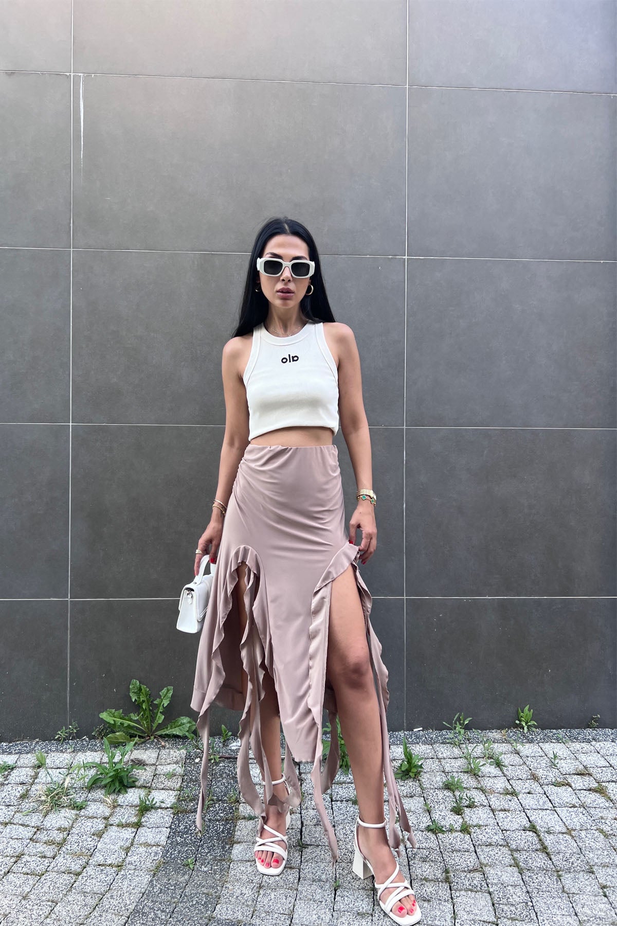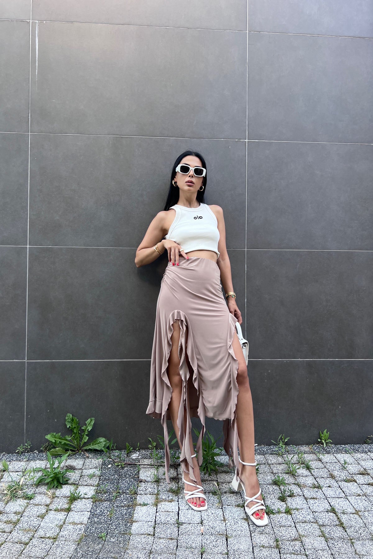 Kahve Derin Yırtmaçlı Fırfır Detay Etek SY-0702-Kahve
