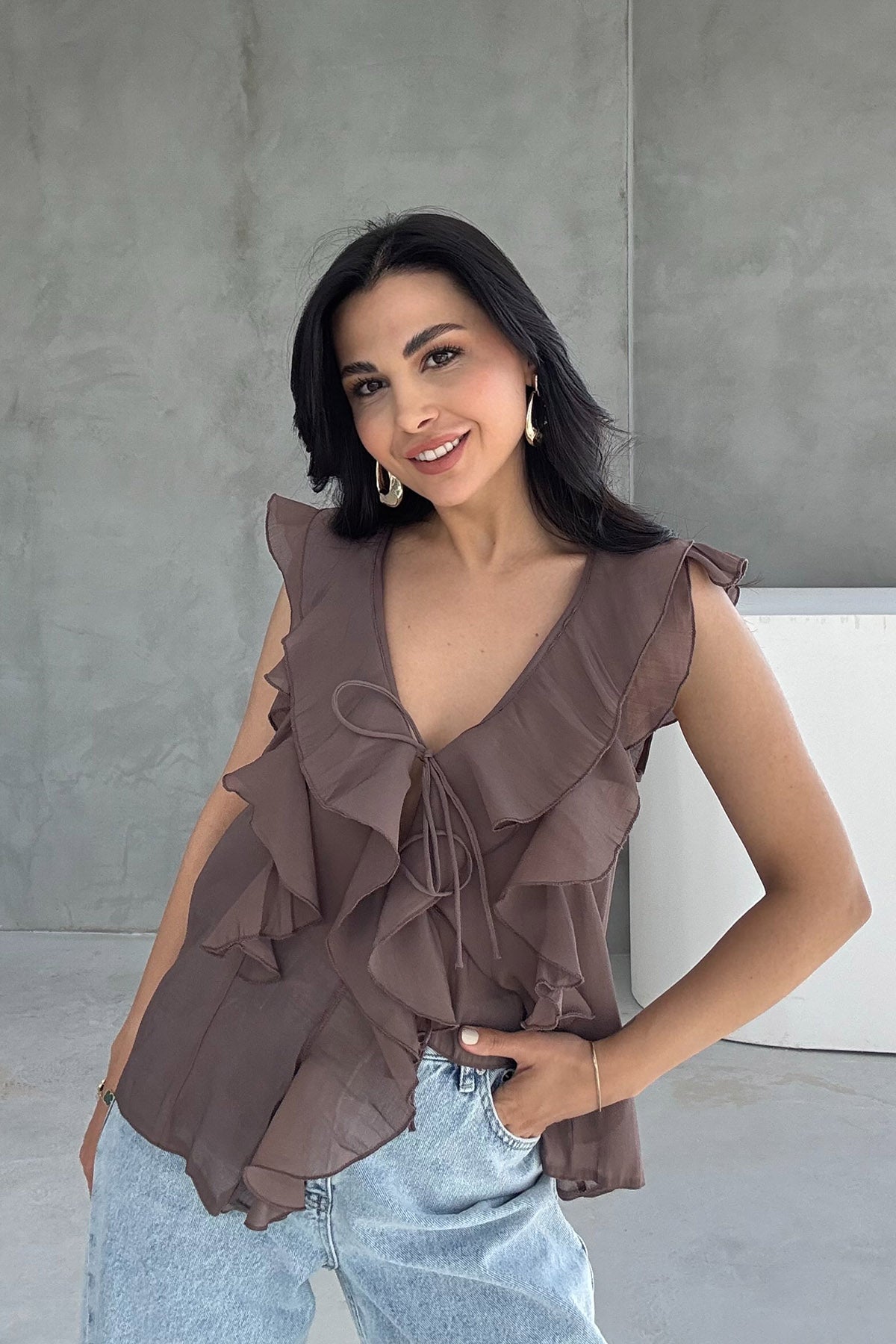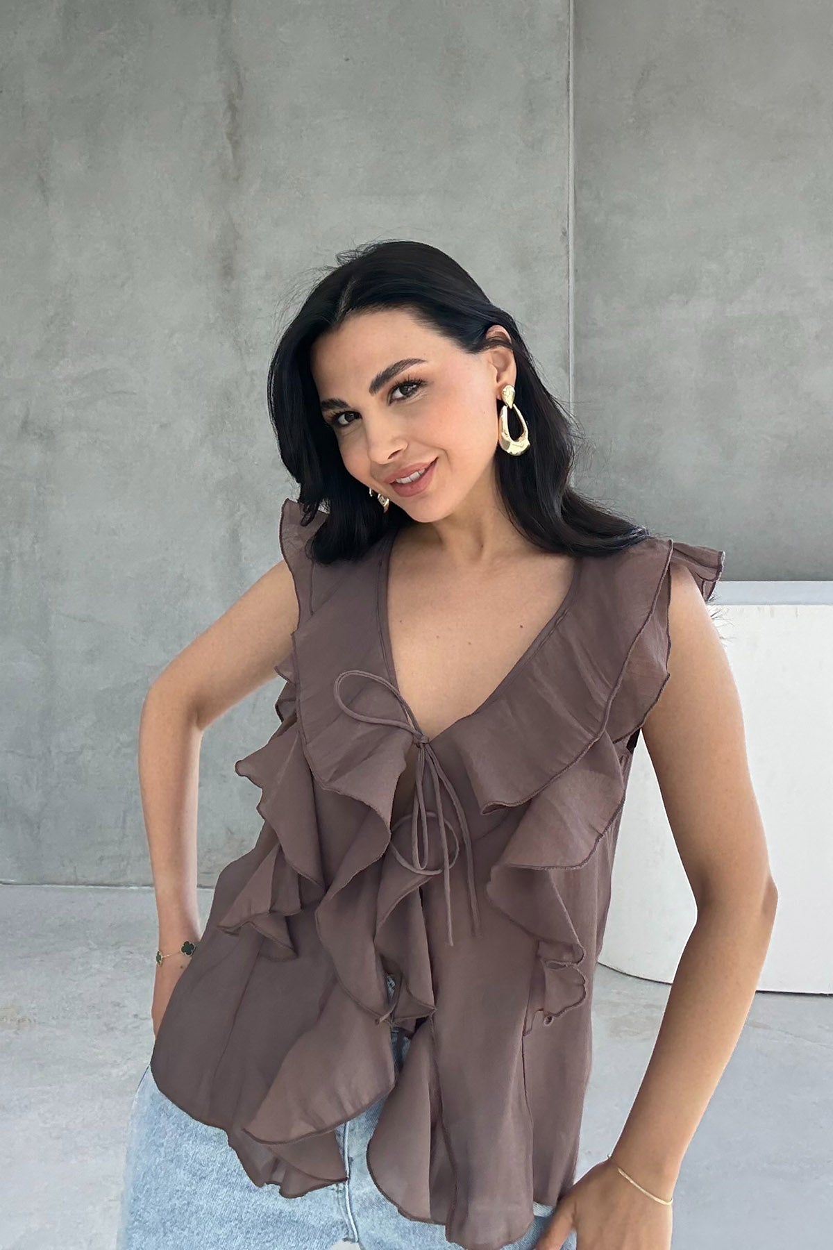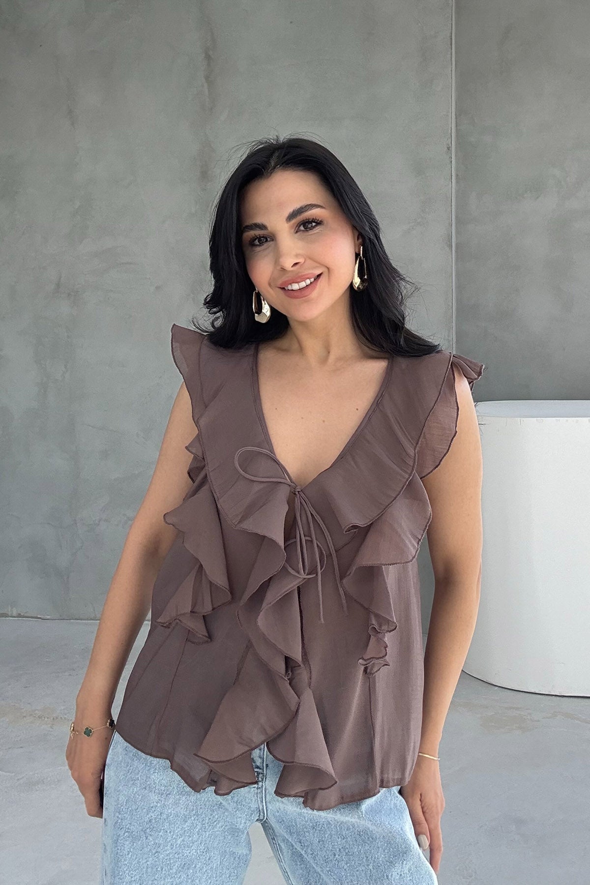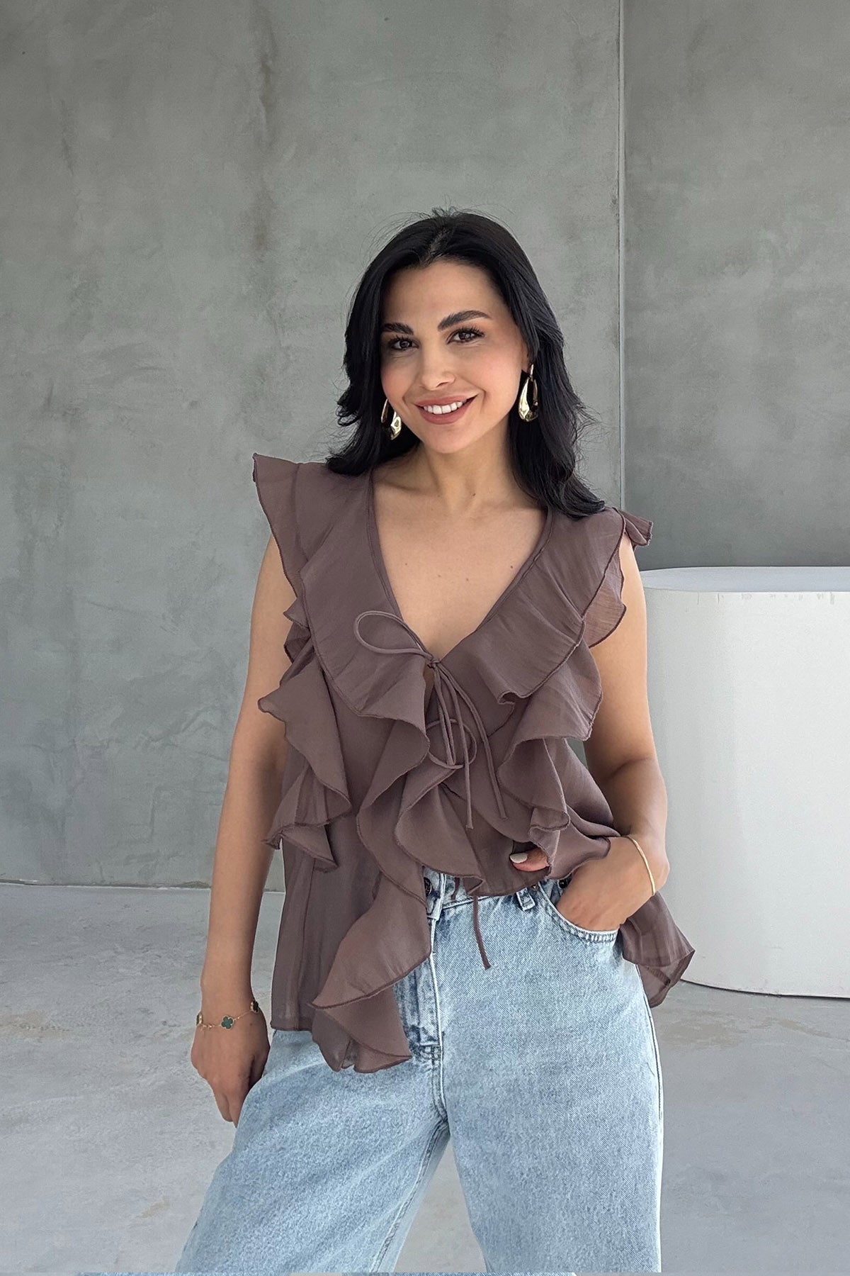 Kahve Fırfırlı Bağlama Detaylı Bluz SY-3165-Kahve