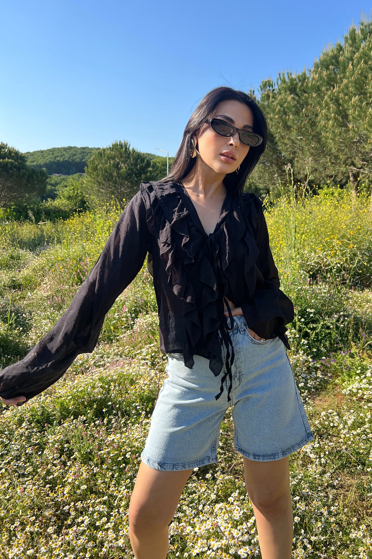 Siyah Uzun Kol Fırfırlı Bluz SY-3168-Siyah
