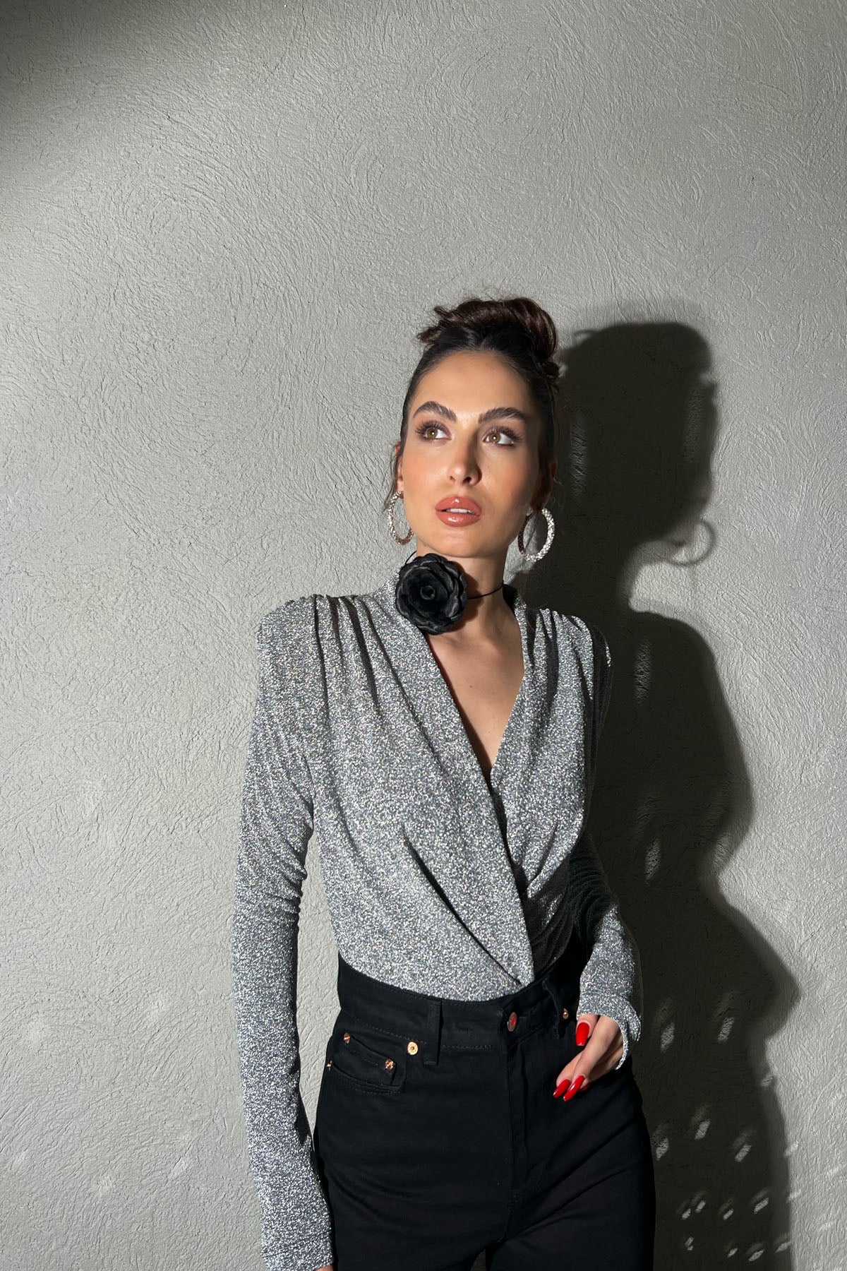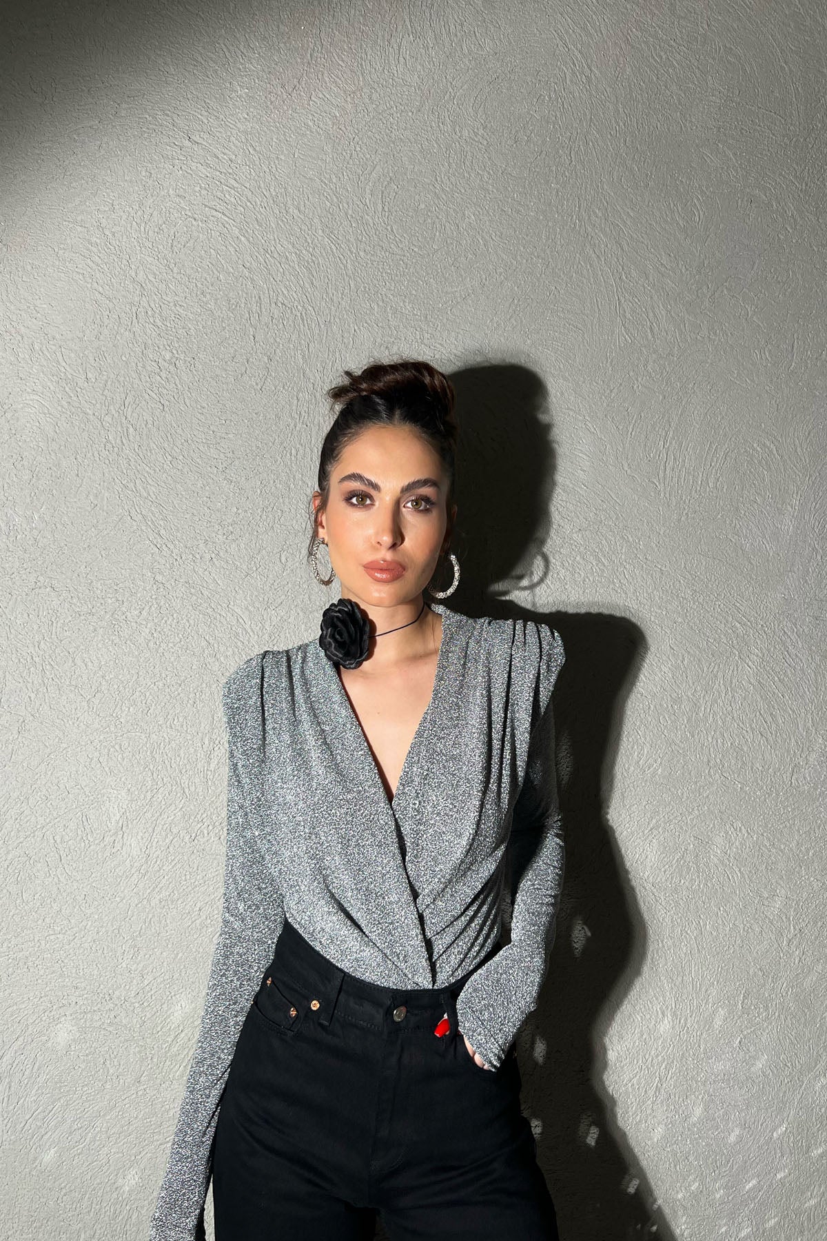 Gümüş Simli Kruvaze Yaka Vatkalı Çıtçıtlı Body SY-1396-Gümüş