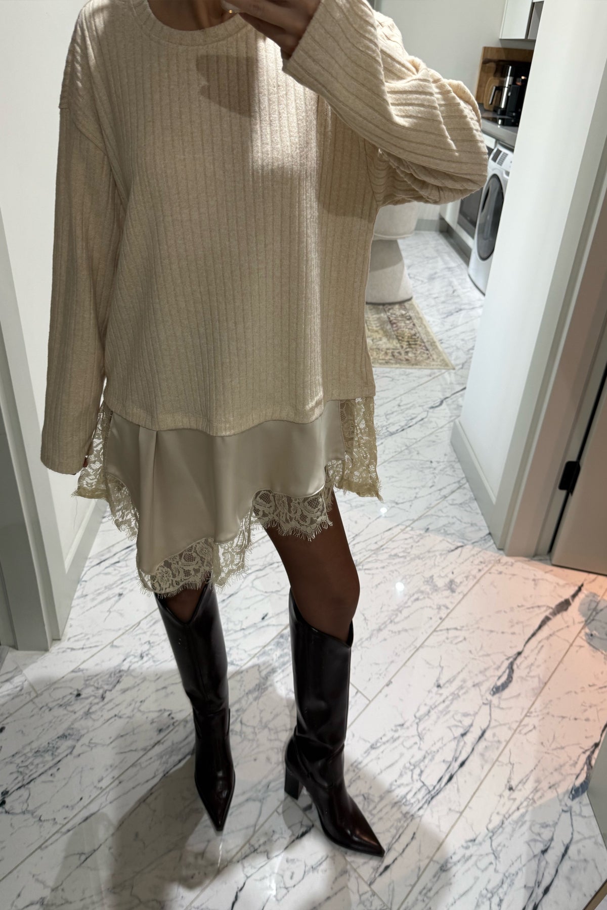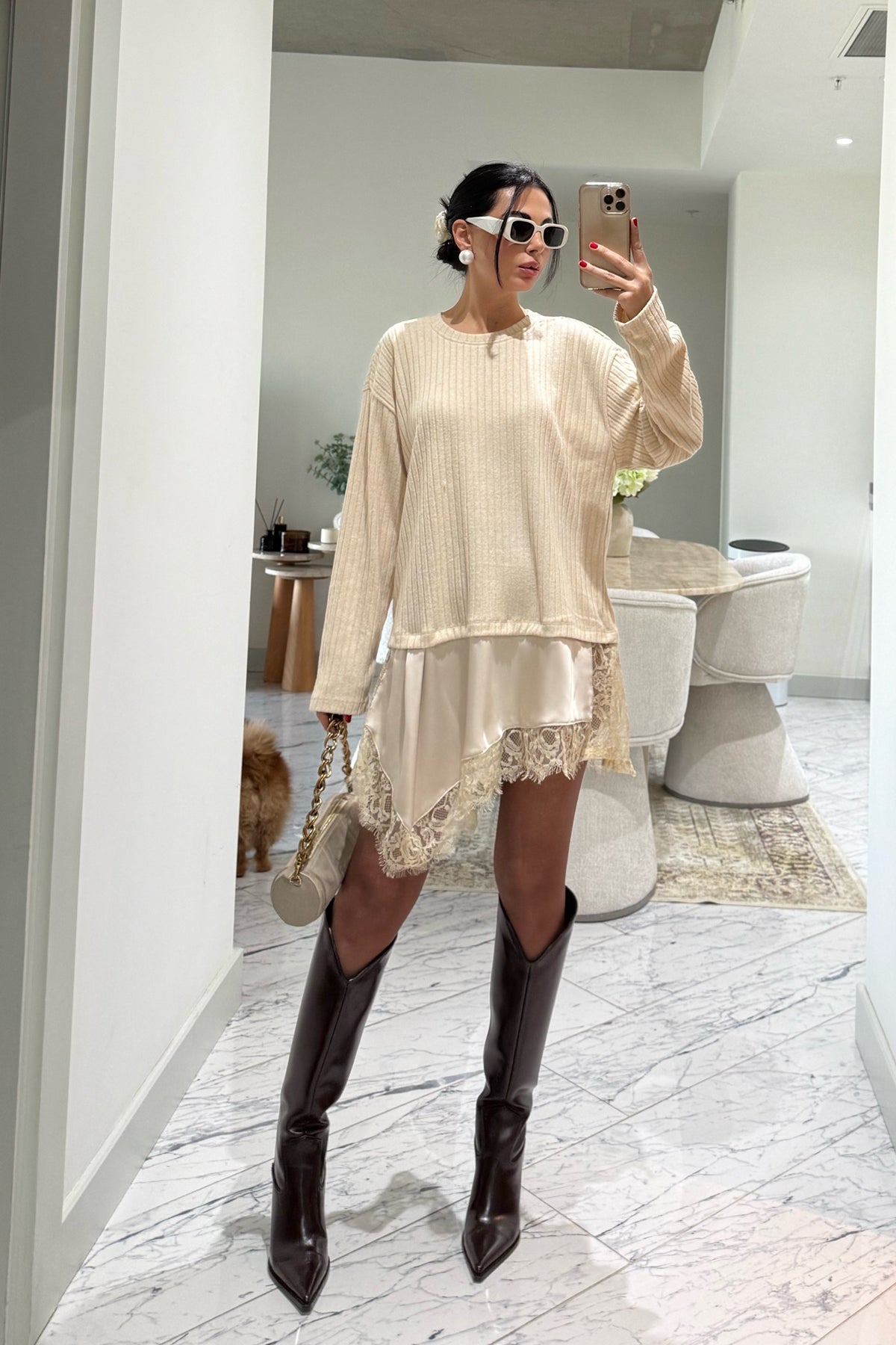 Bej Dantel Detaylı Saten Triko Bluz-Elbise SY-3504-Bej