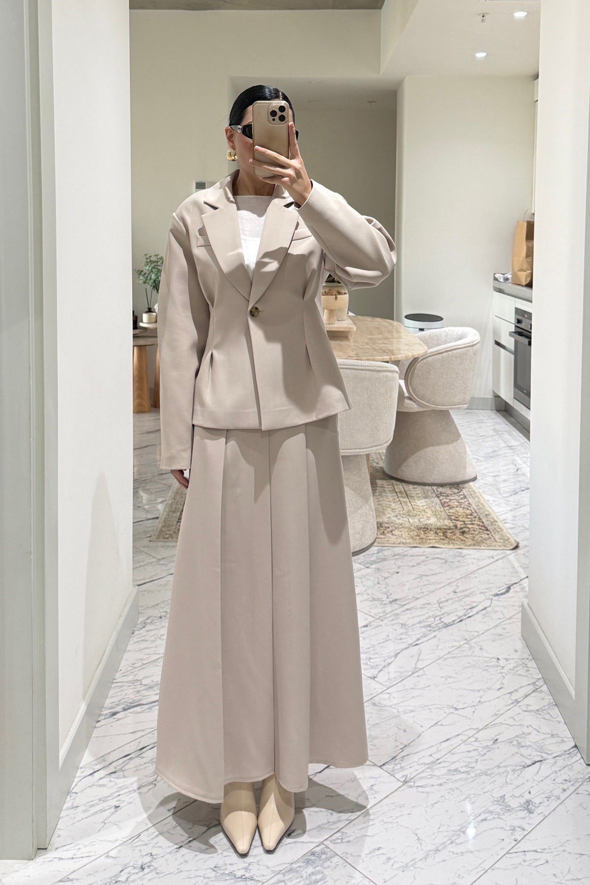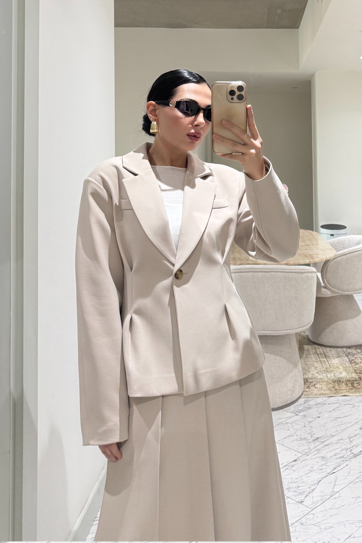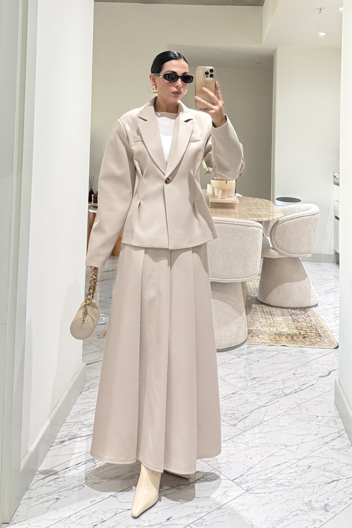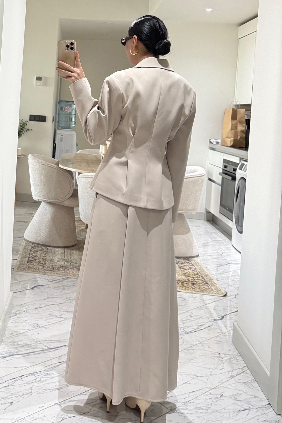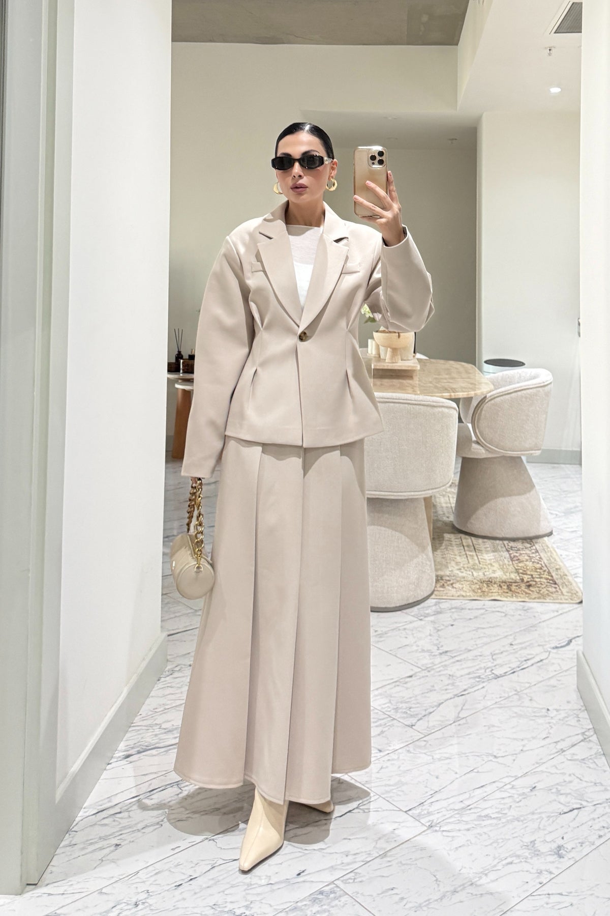 Ürün Detayları:Bej Pli Detaylı Ceket Etek Takım
