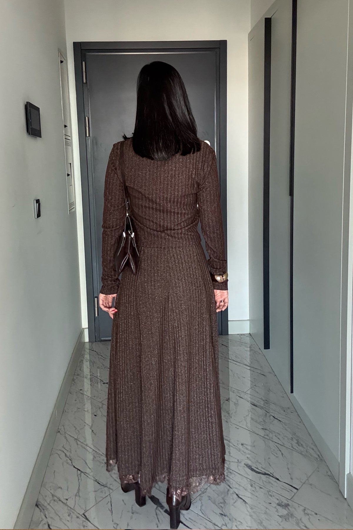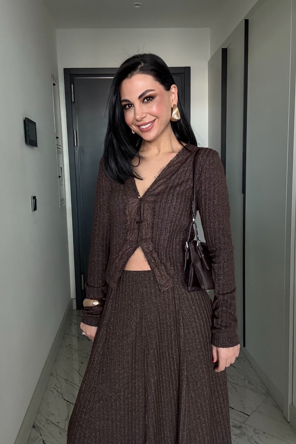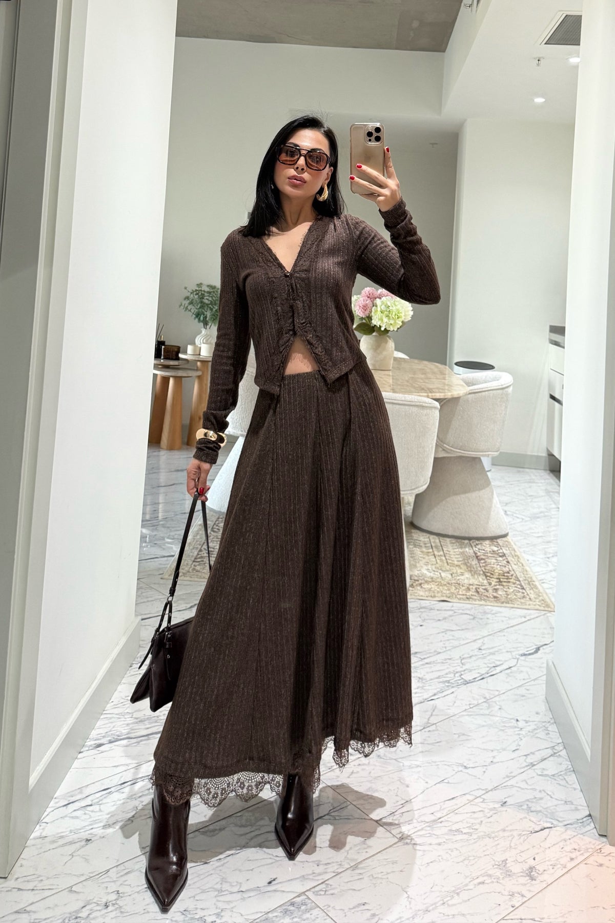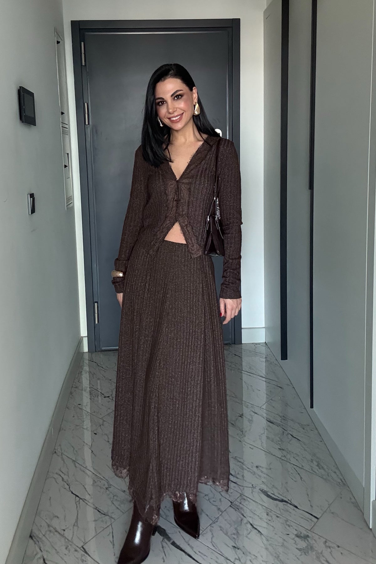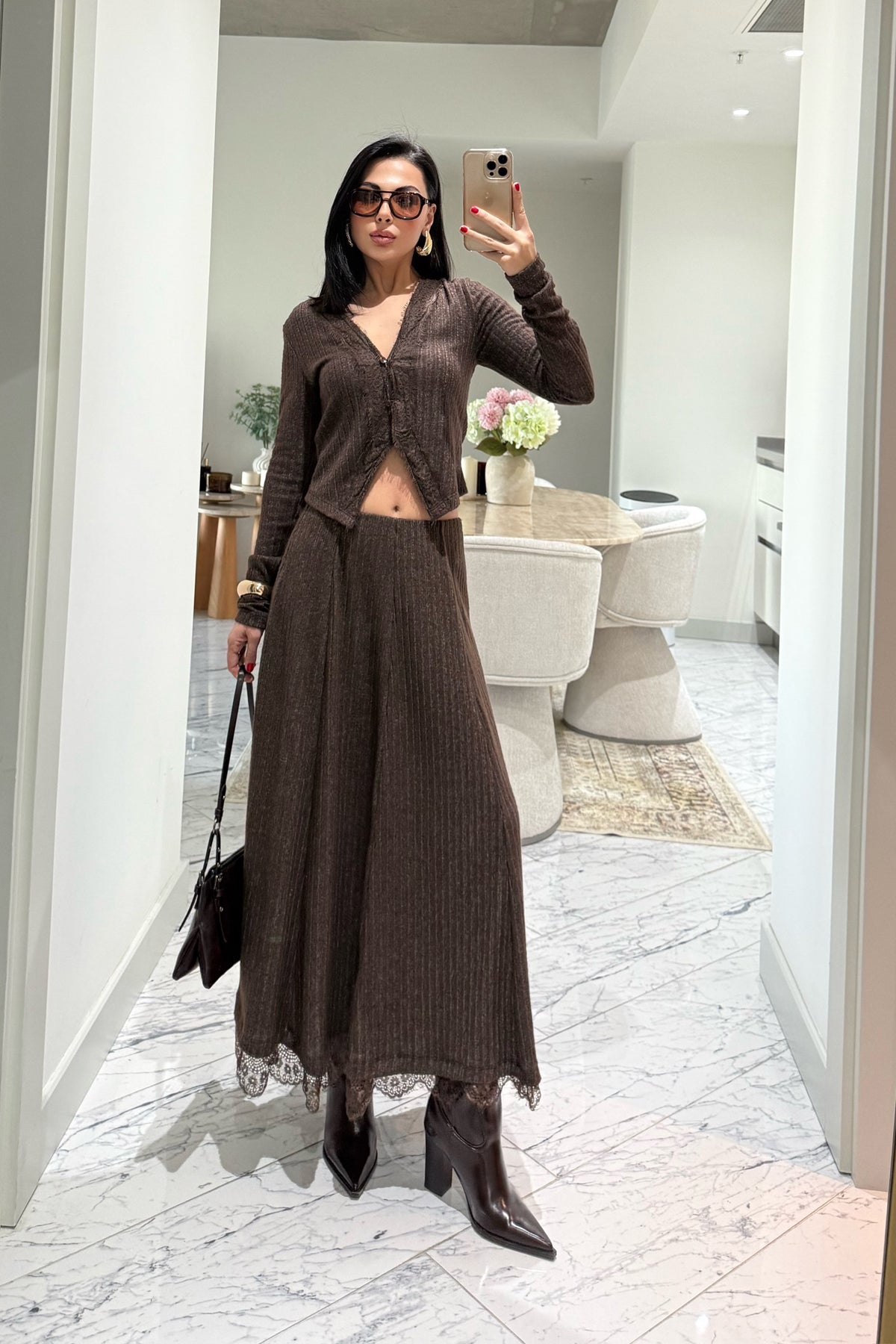 Dantel Detaylı Fitilli Hırka Ve Etek Takım SY-3507-Kahverengi