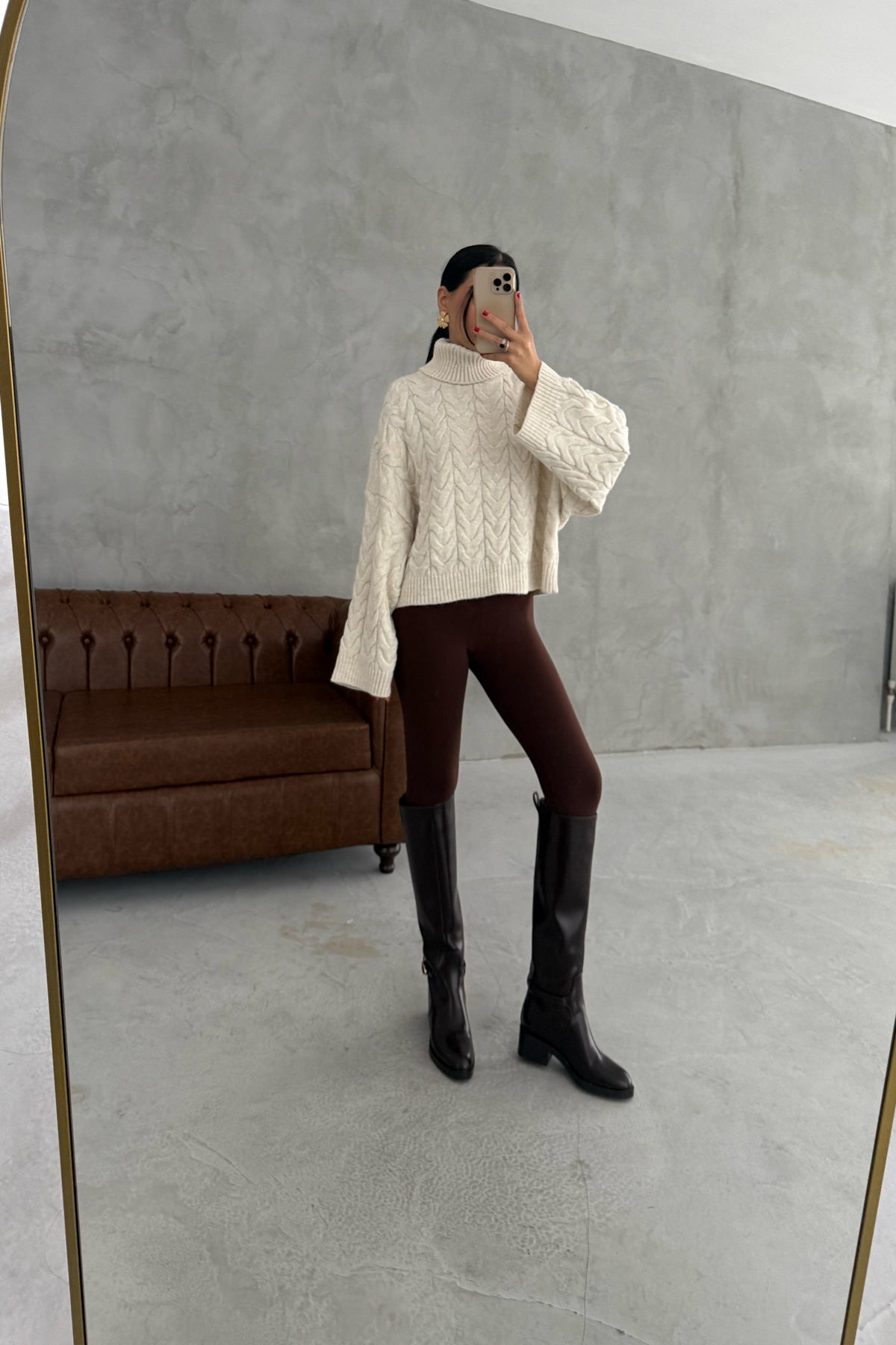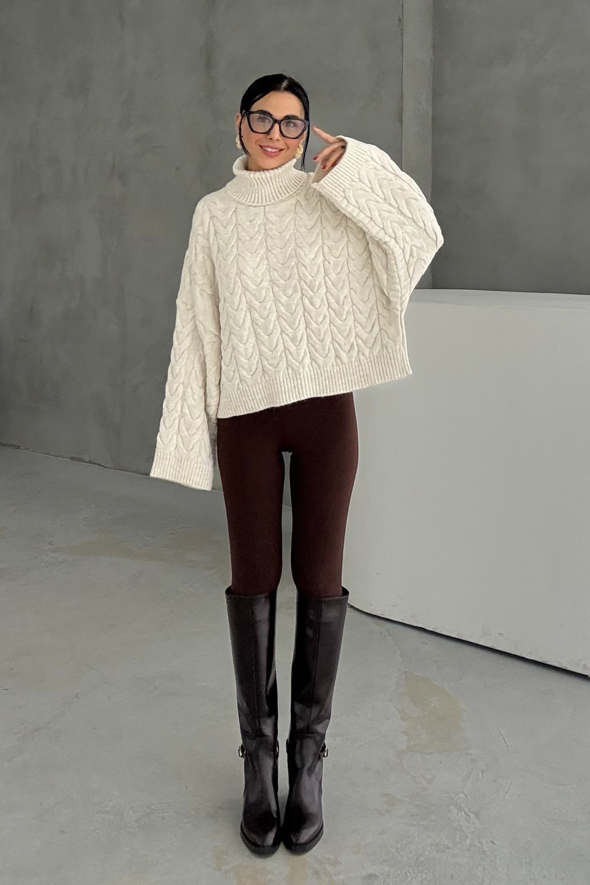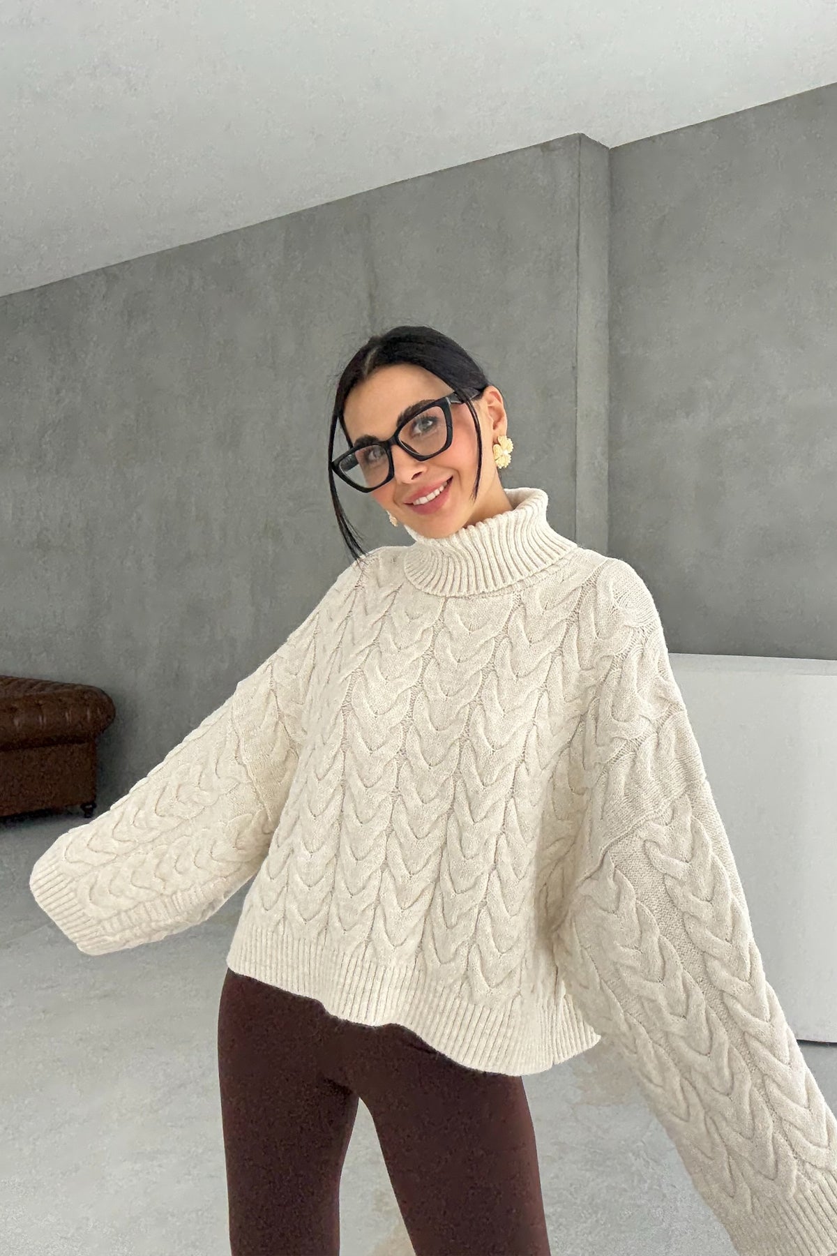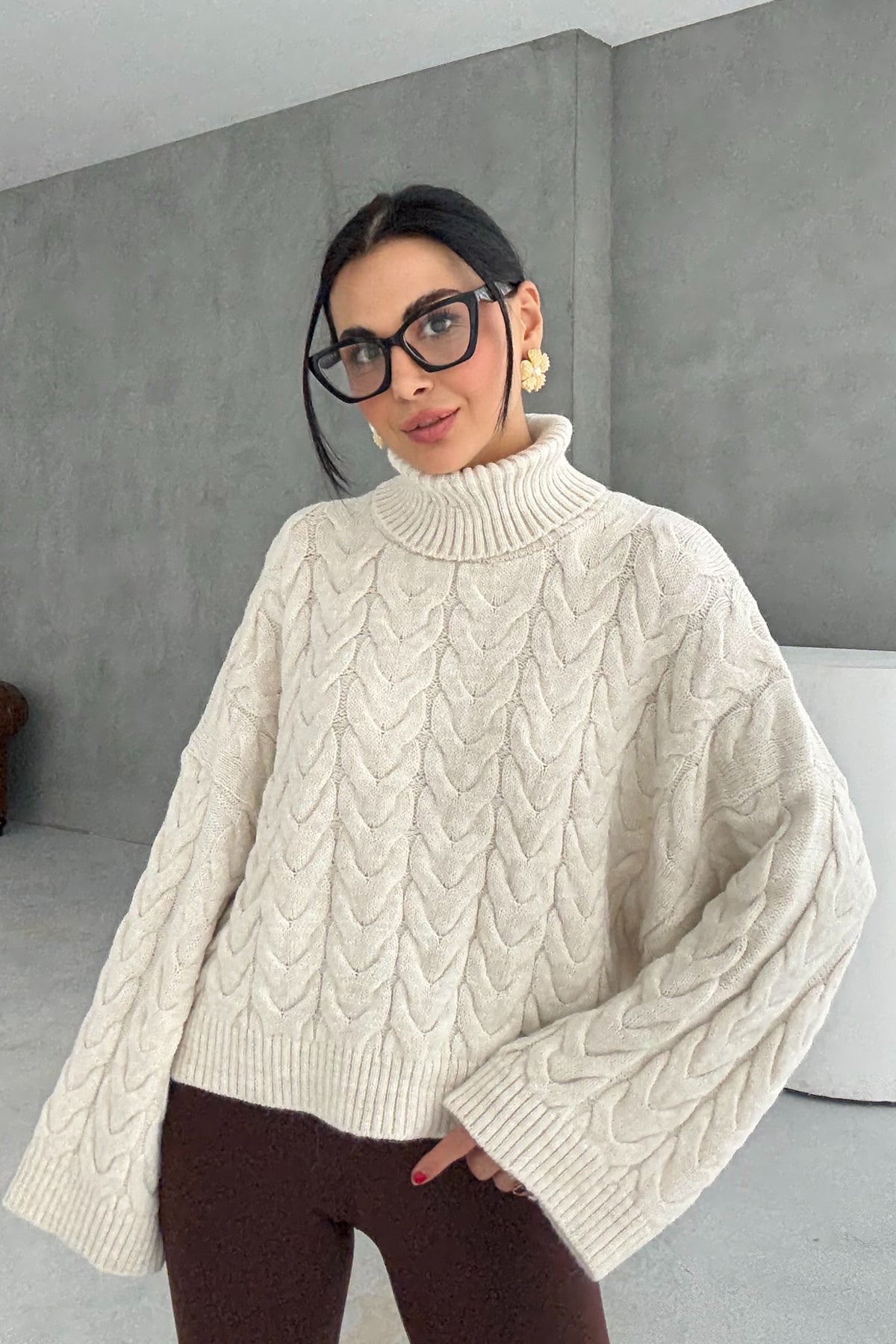 Ürün Detayları ;Ekru Saç Örgü Boğazlı Kazak