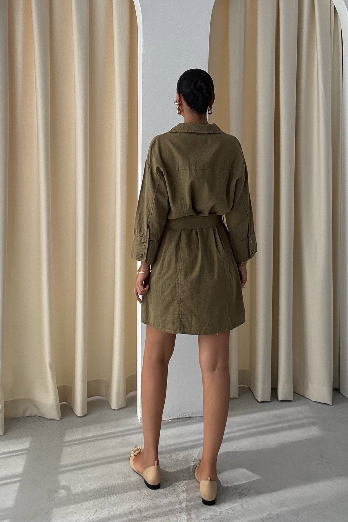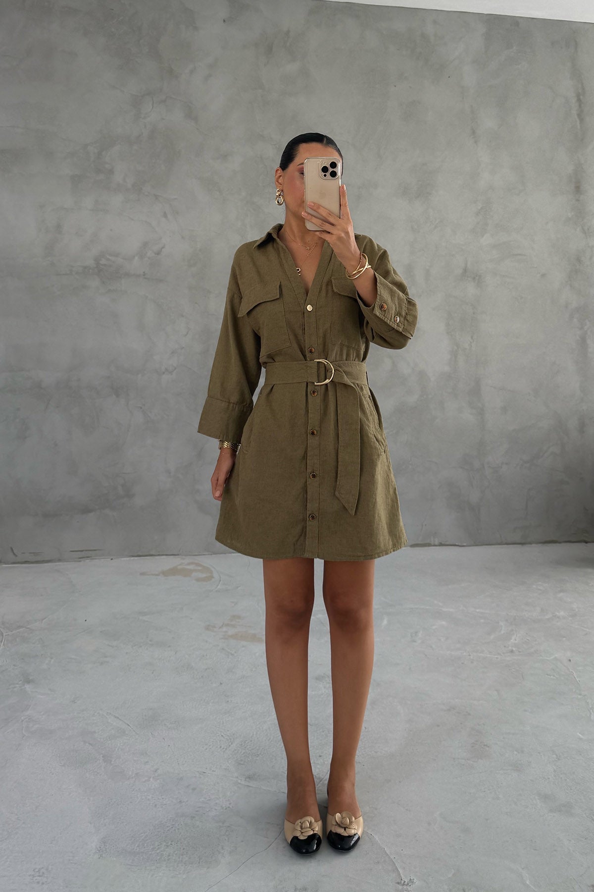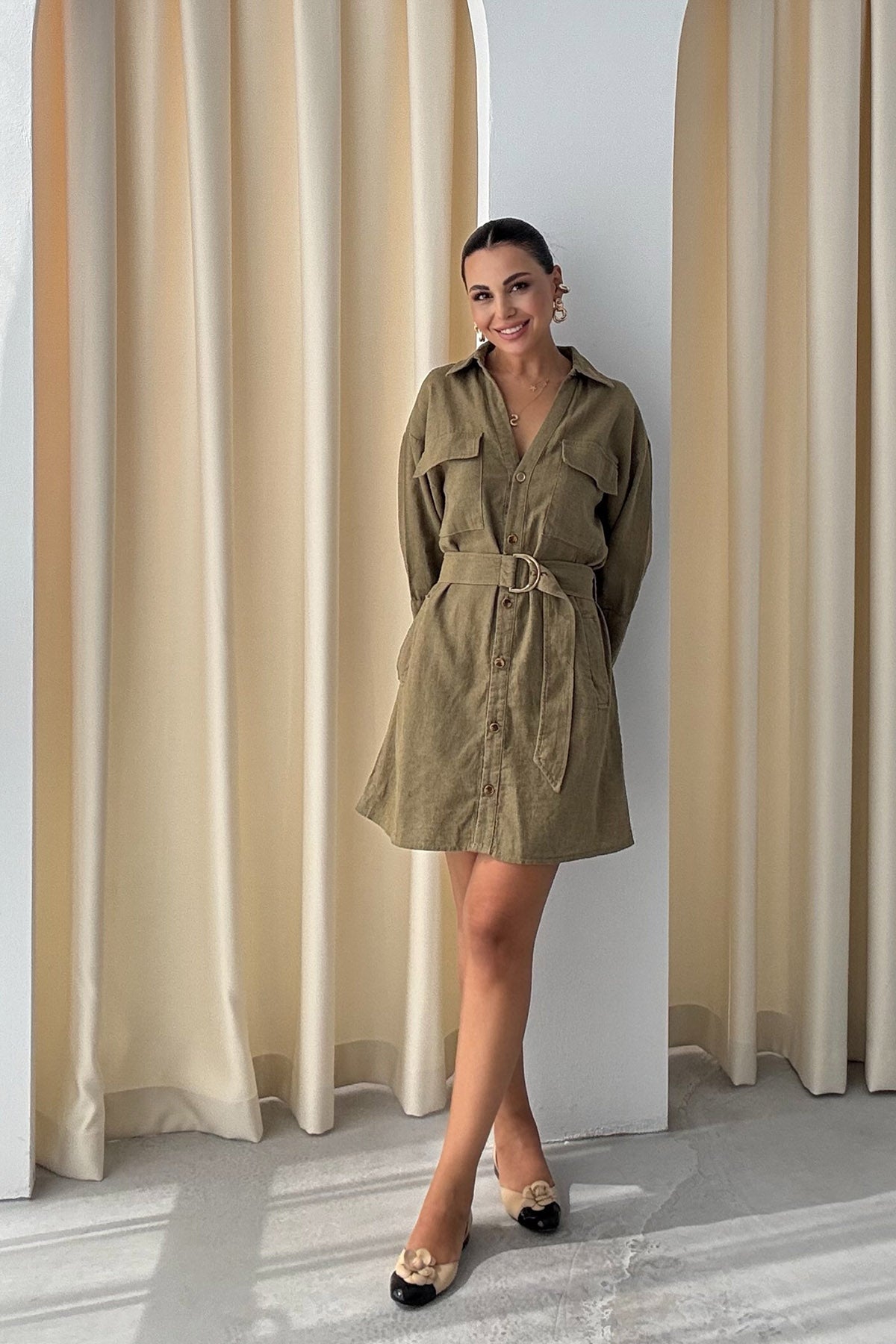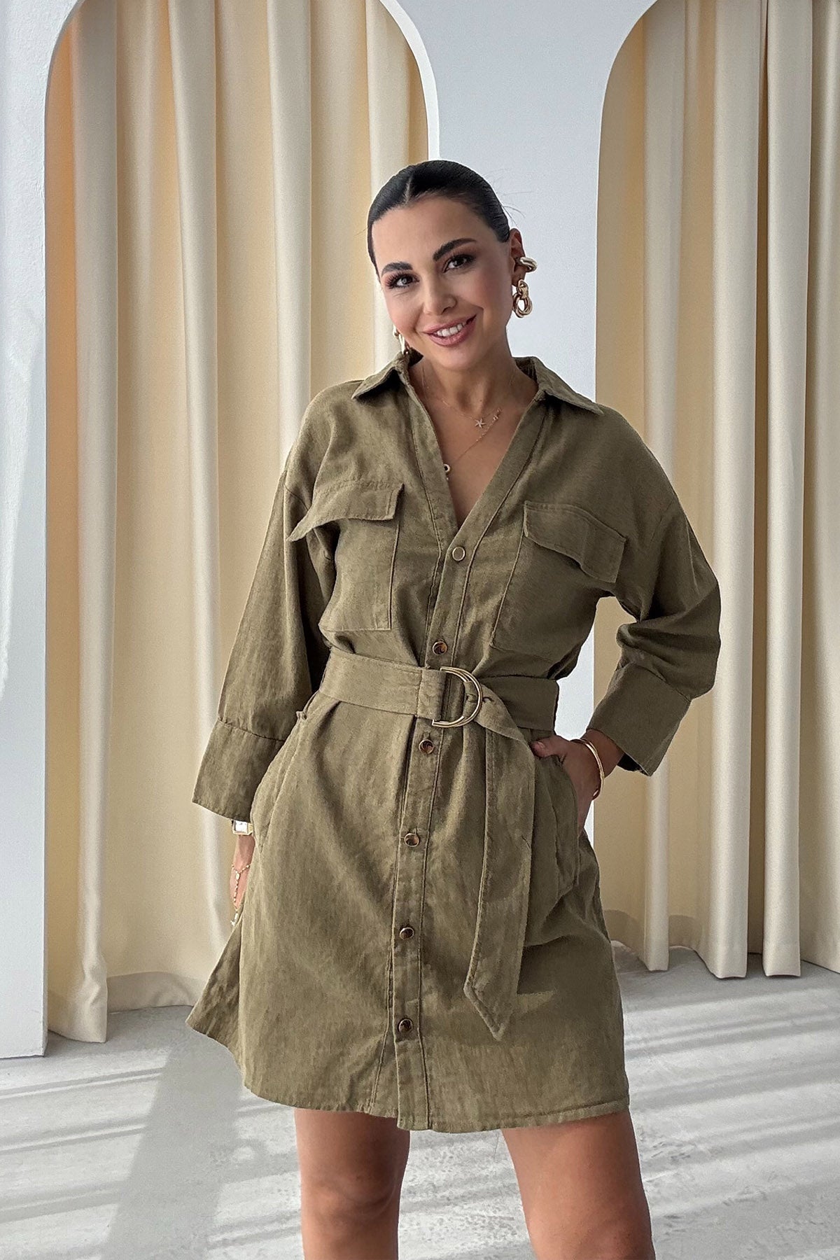 Haki Keten Kuşaklı Gömlek Elbise SY-3213-Haki