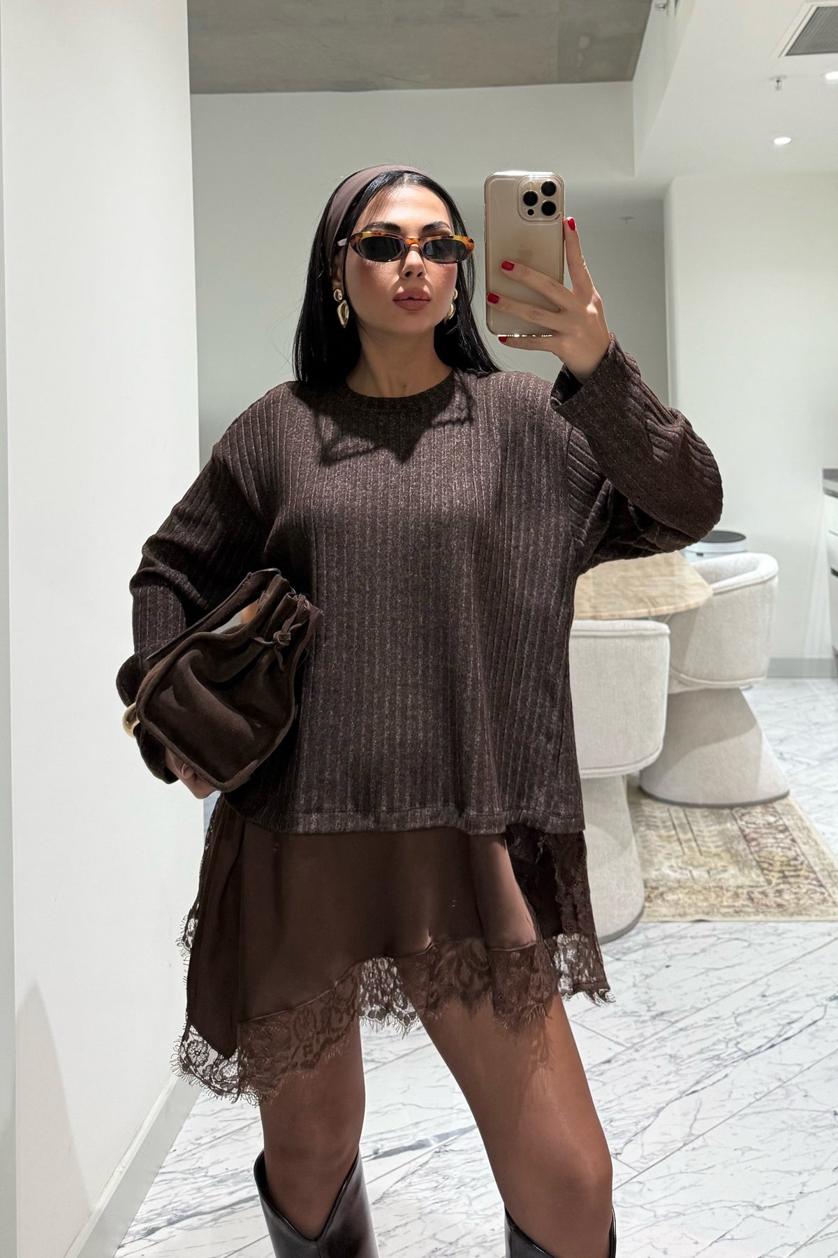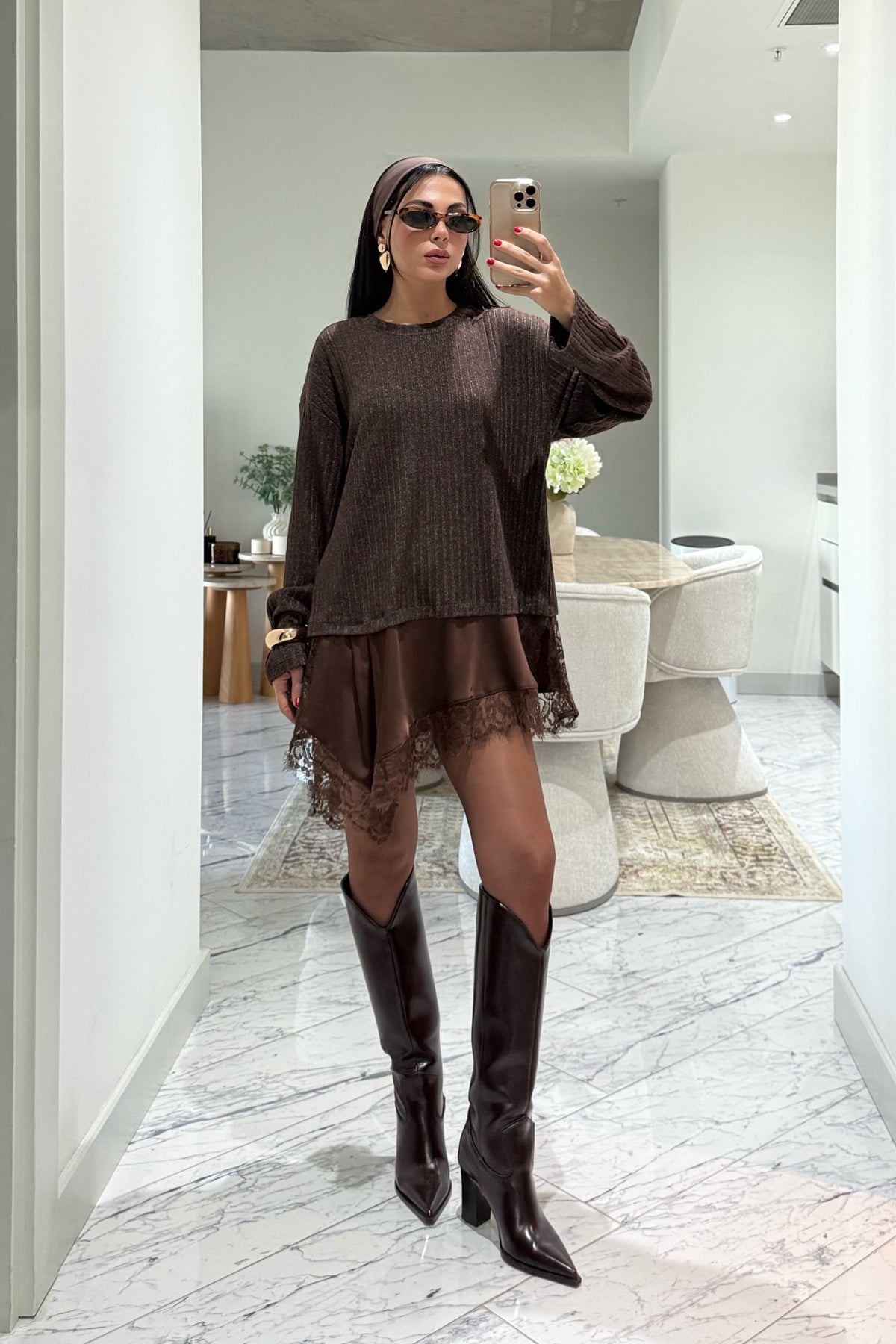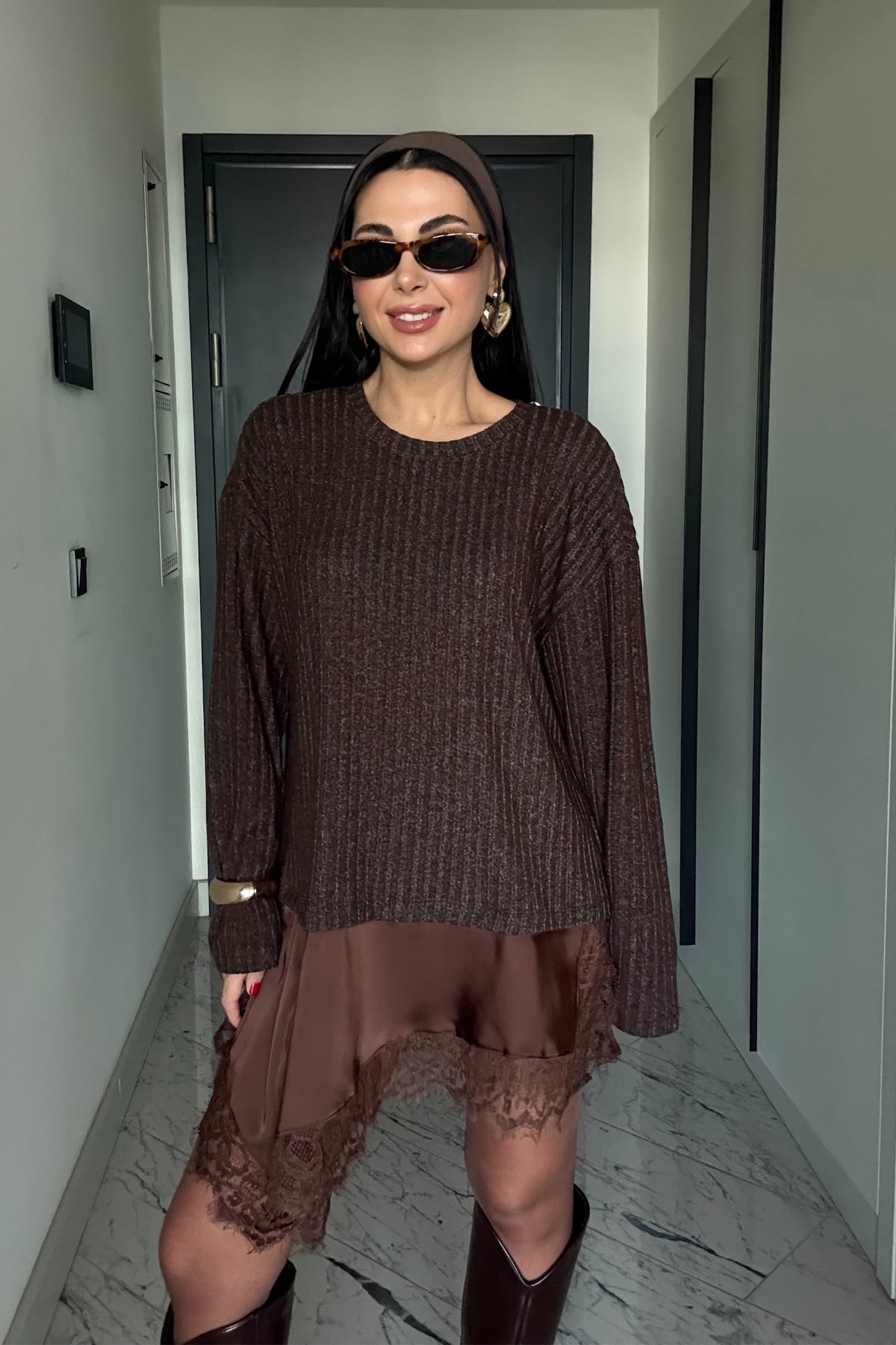 Kahverengi Dantel Detaylı Saten Triko Bluz-Elbise SY-3504-Kahverengi
