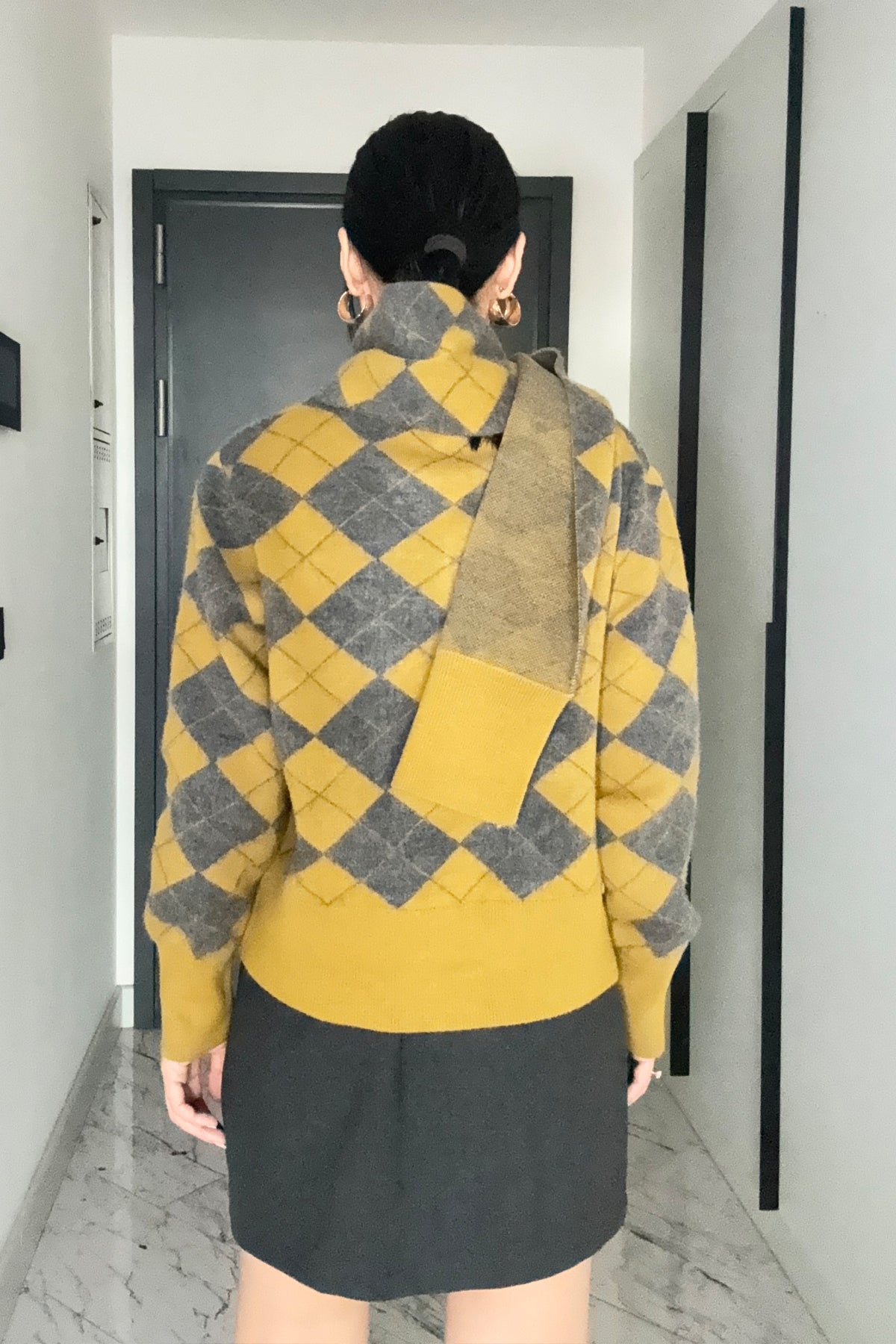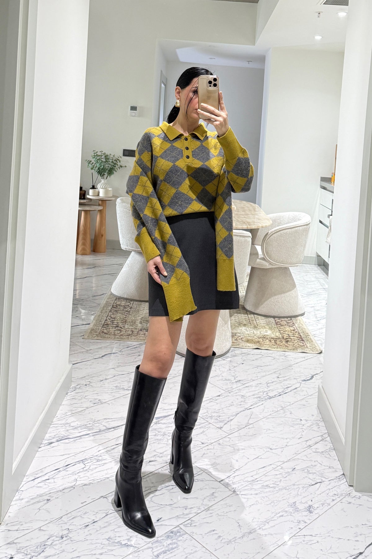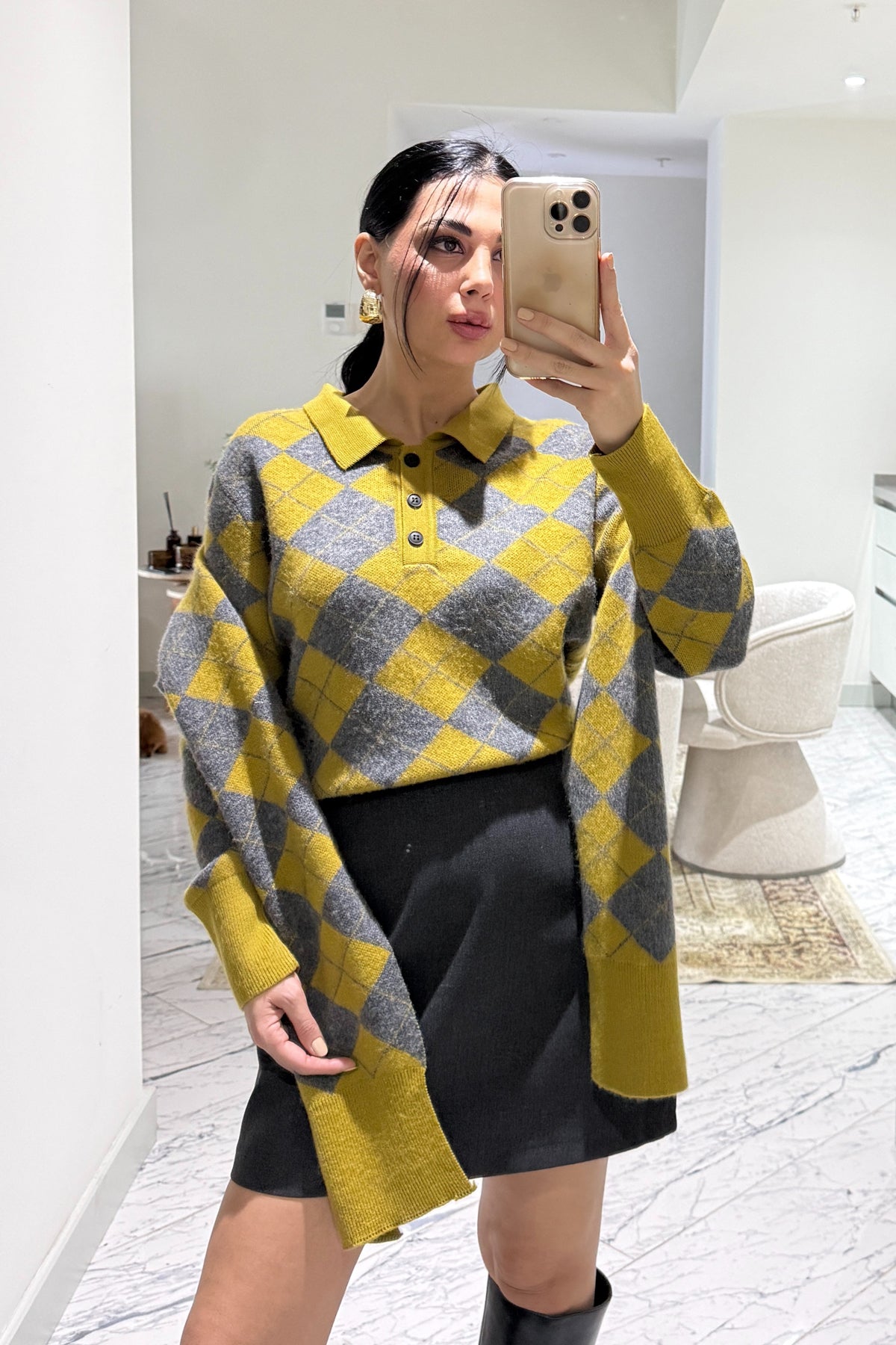 Ürün Detayları :Kendinden Şallı Baklava Desenli Polo Yaka Triko -Kaşkol Kazağa aittir .Tam kalıp tam beden önerilir.Esnektir