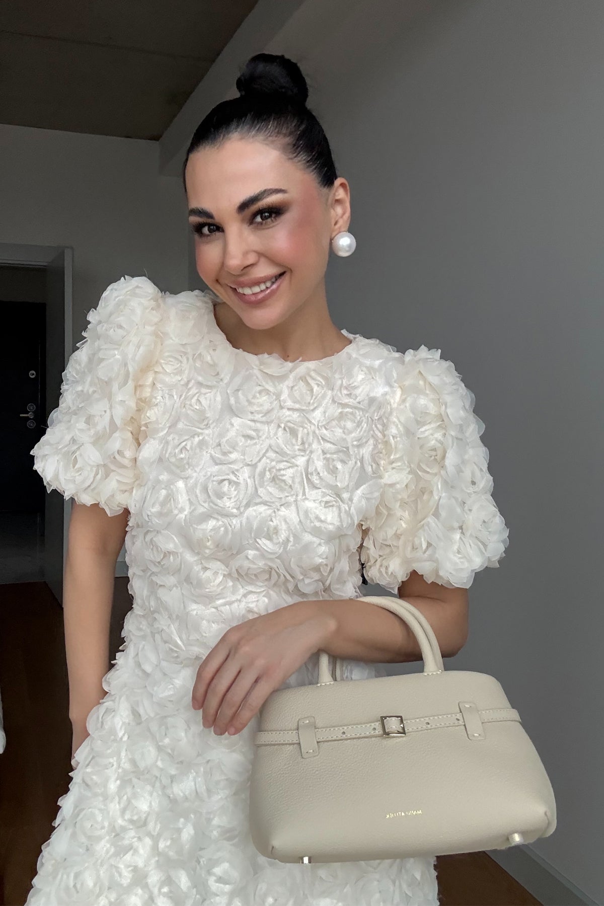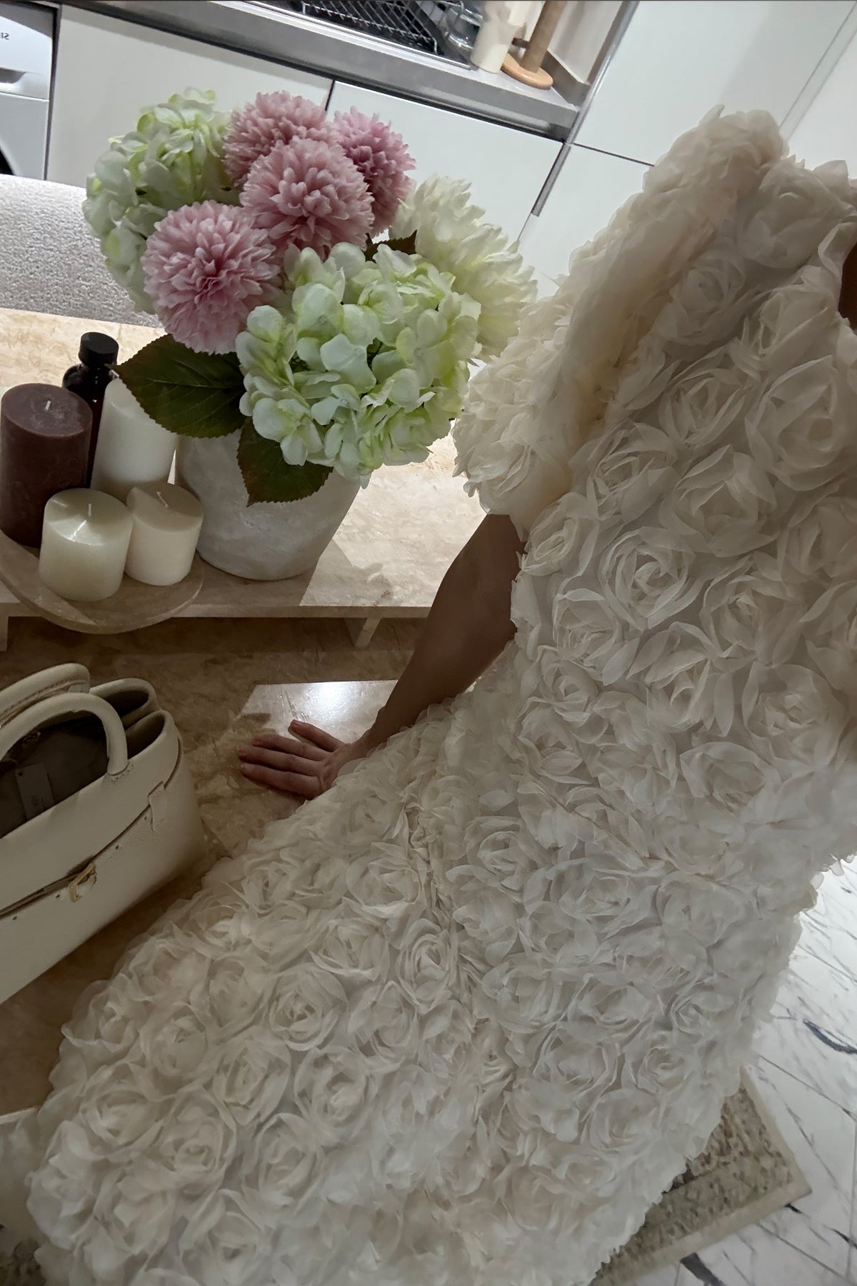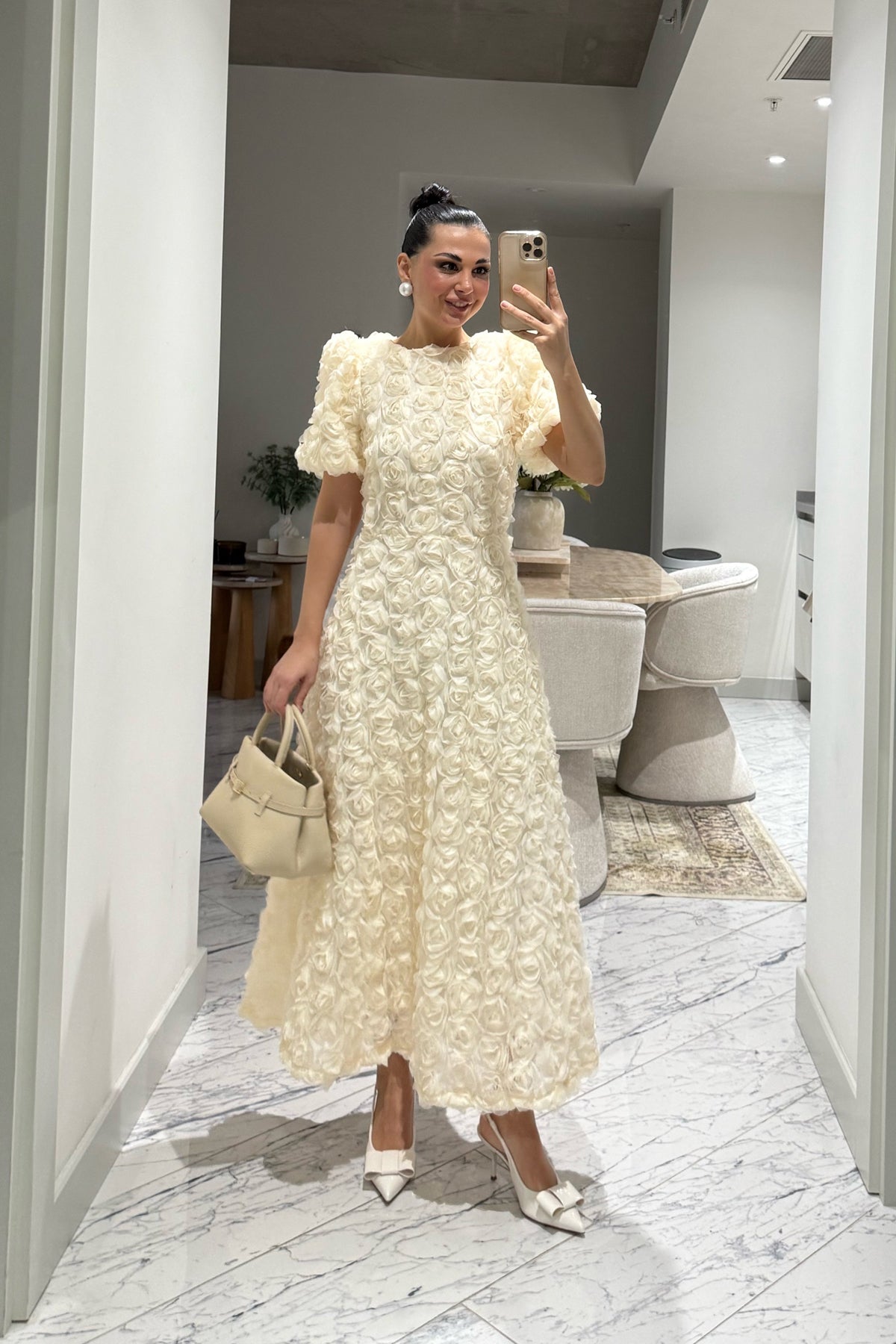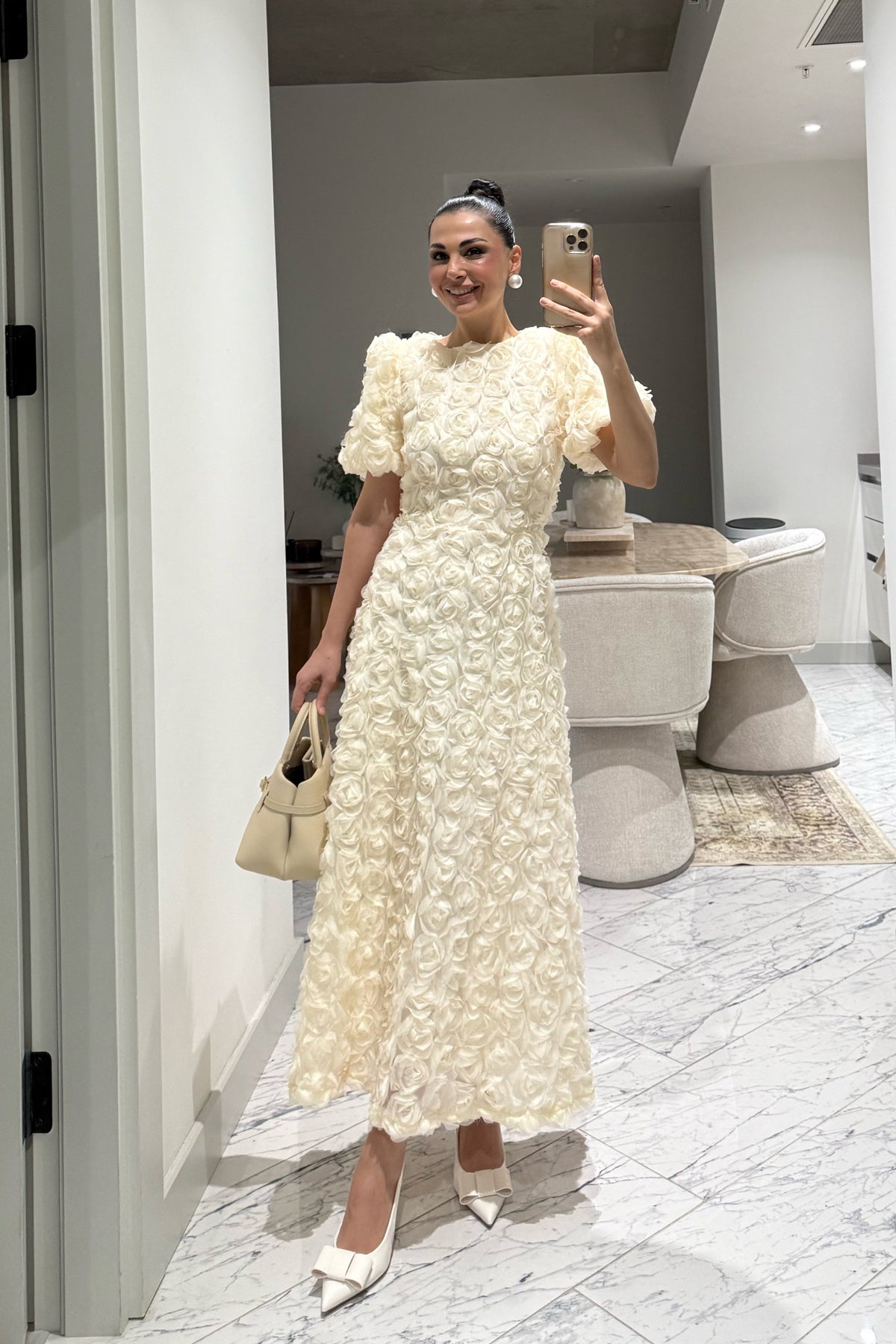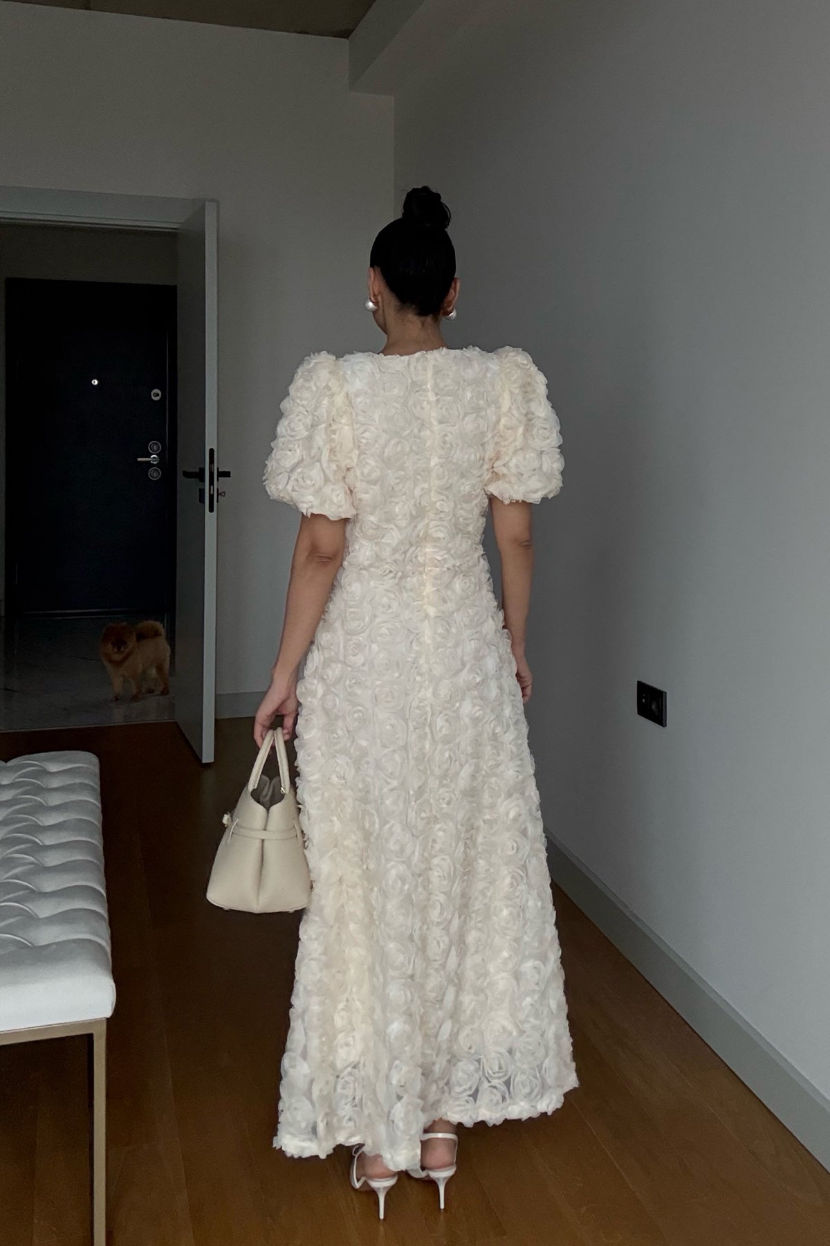Ürün Detayları:Gül Detaylı Krem Rosella Özel Tasarım Elbise