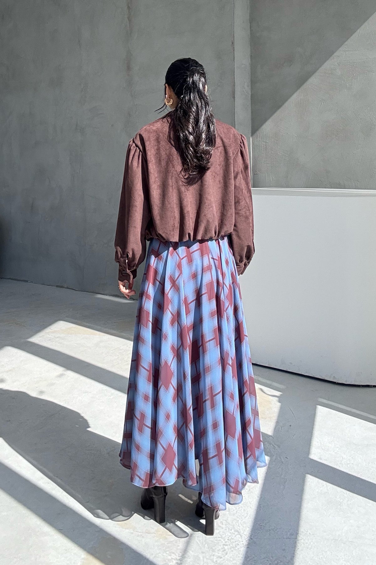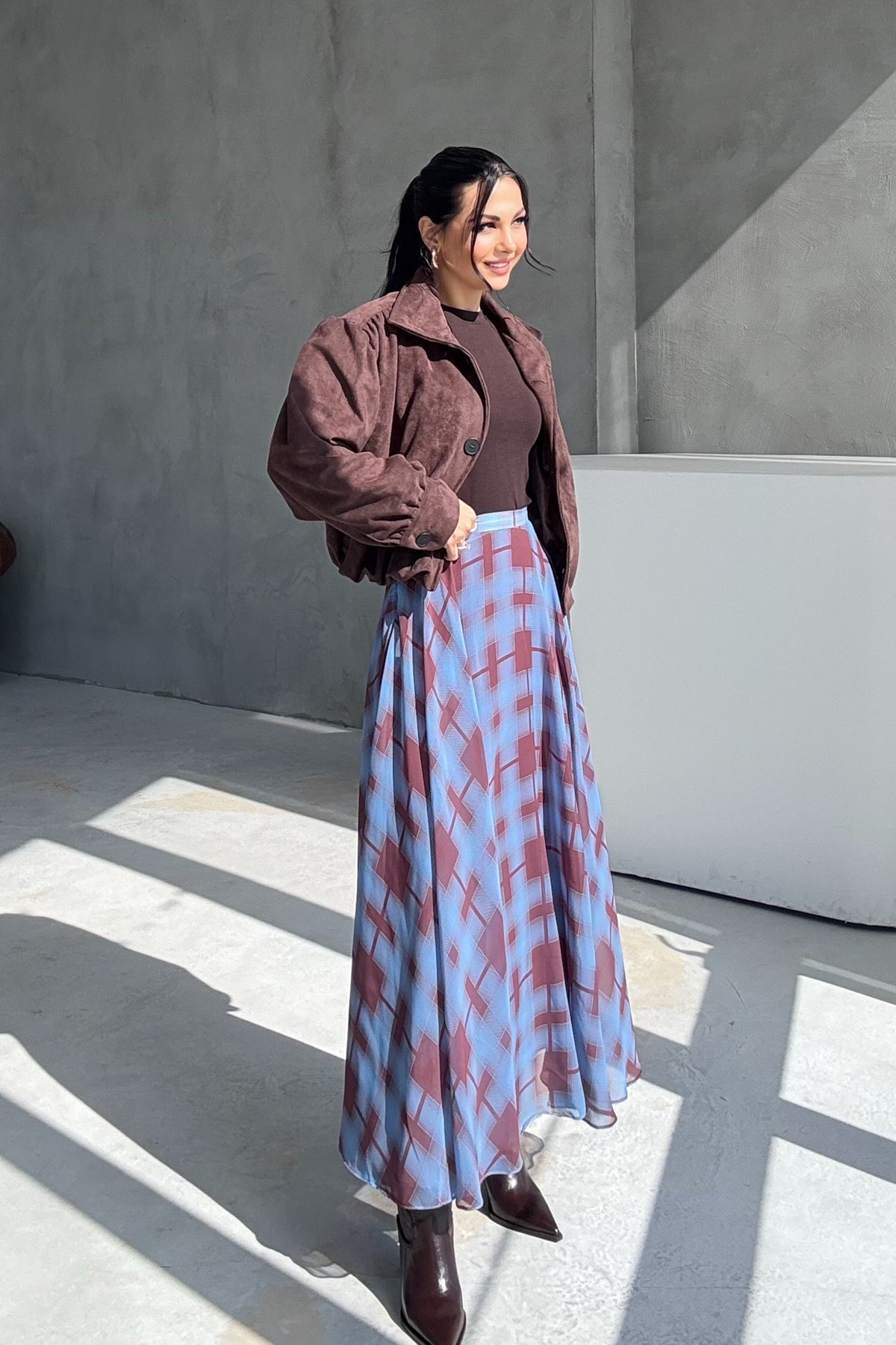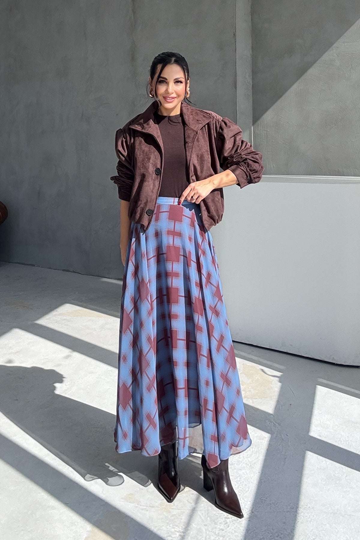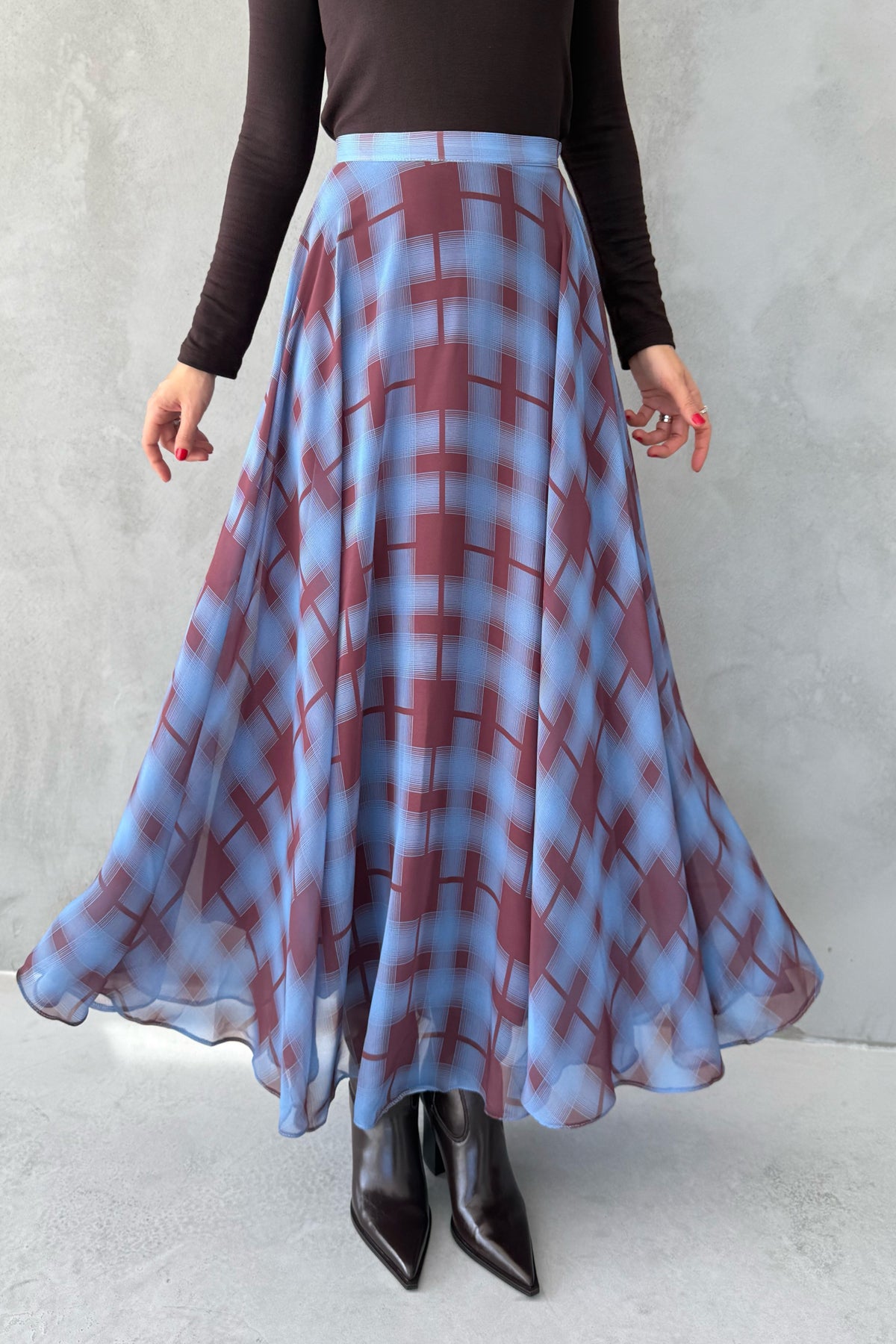 Ürün Detayları; Mavi Ekose Desenli Şifon Etek