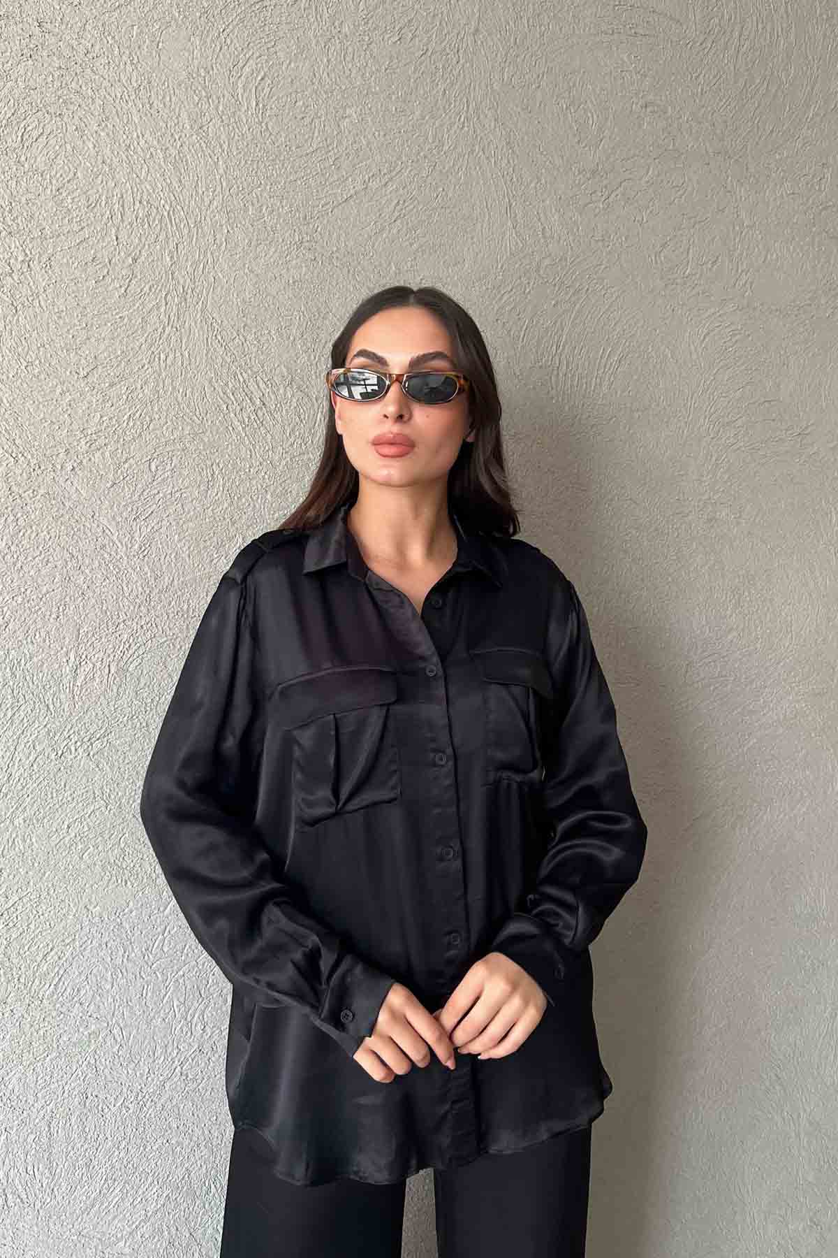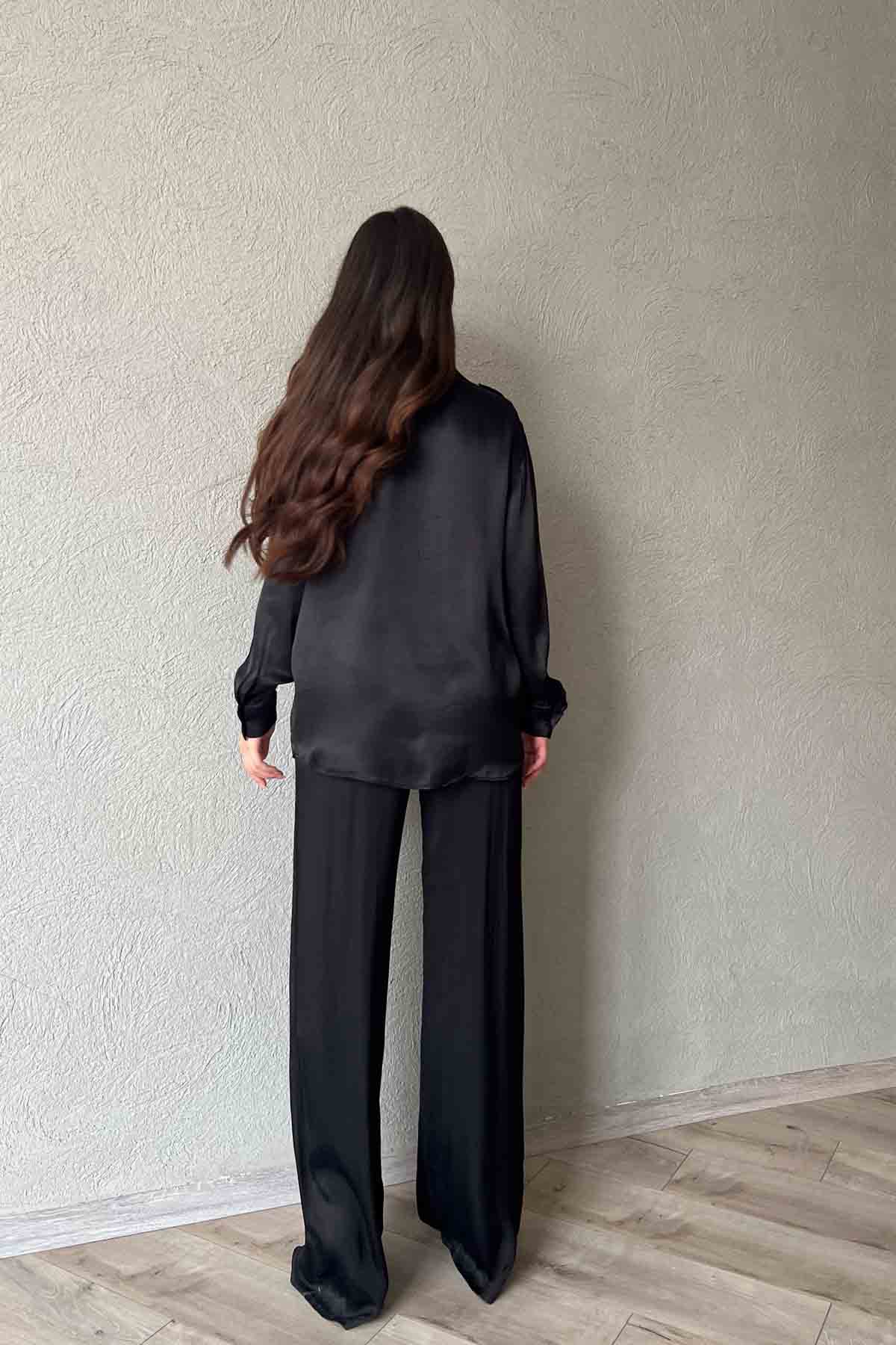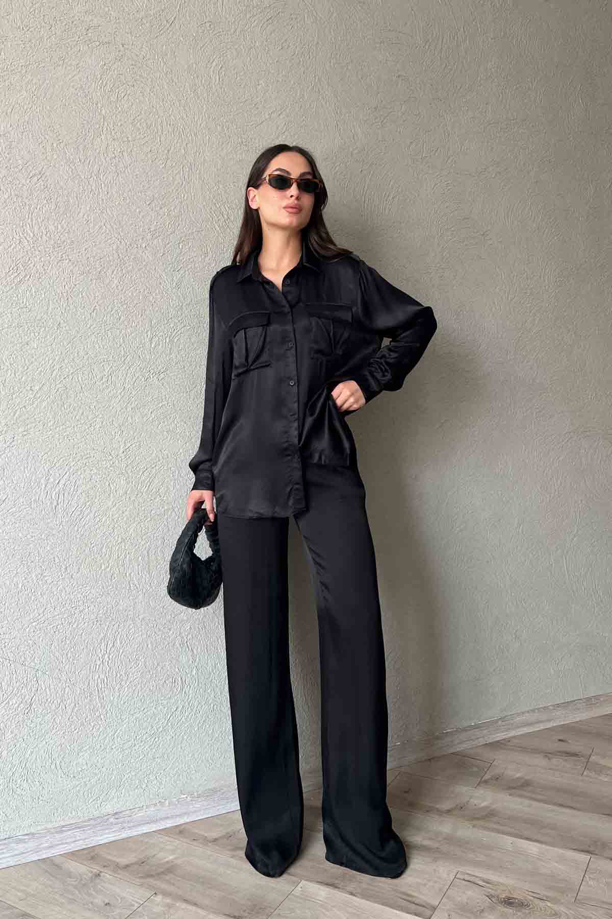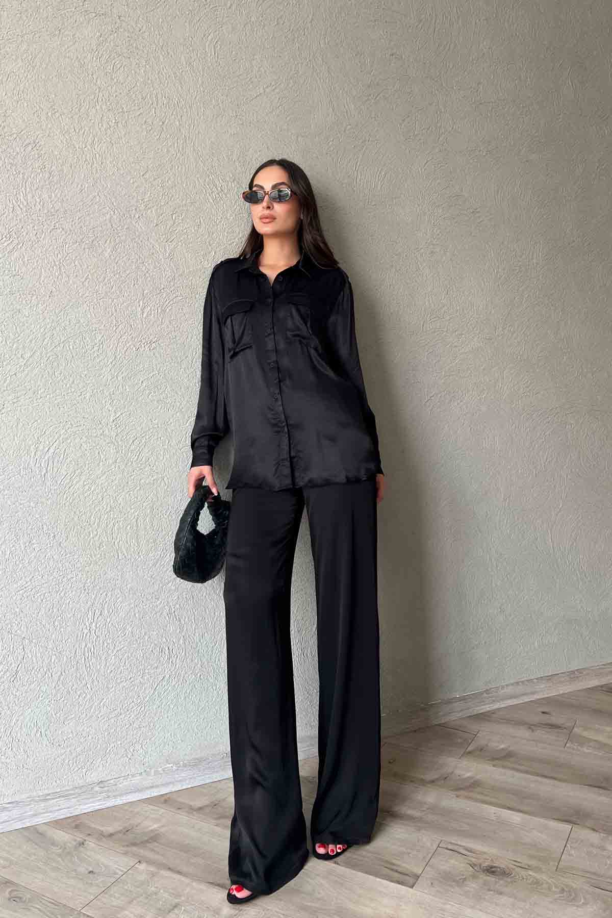 Ürün Detayları ;Siyah Saten Düğme Detaylı Gömlek Pantolon Takım