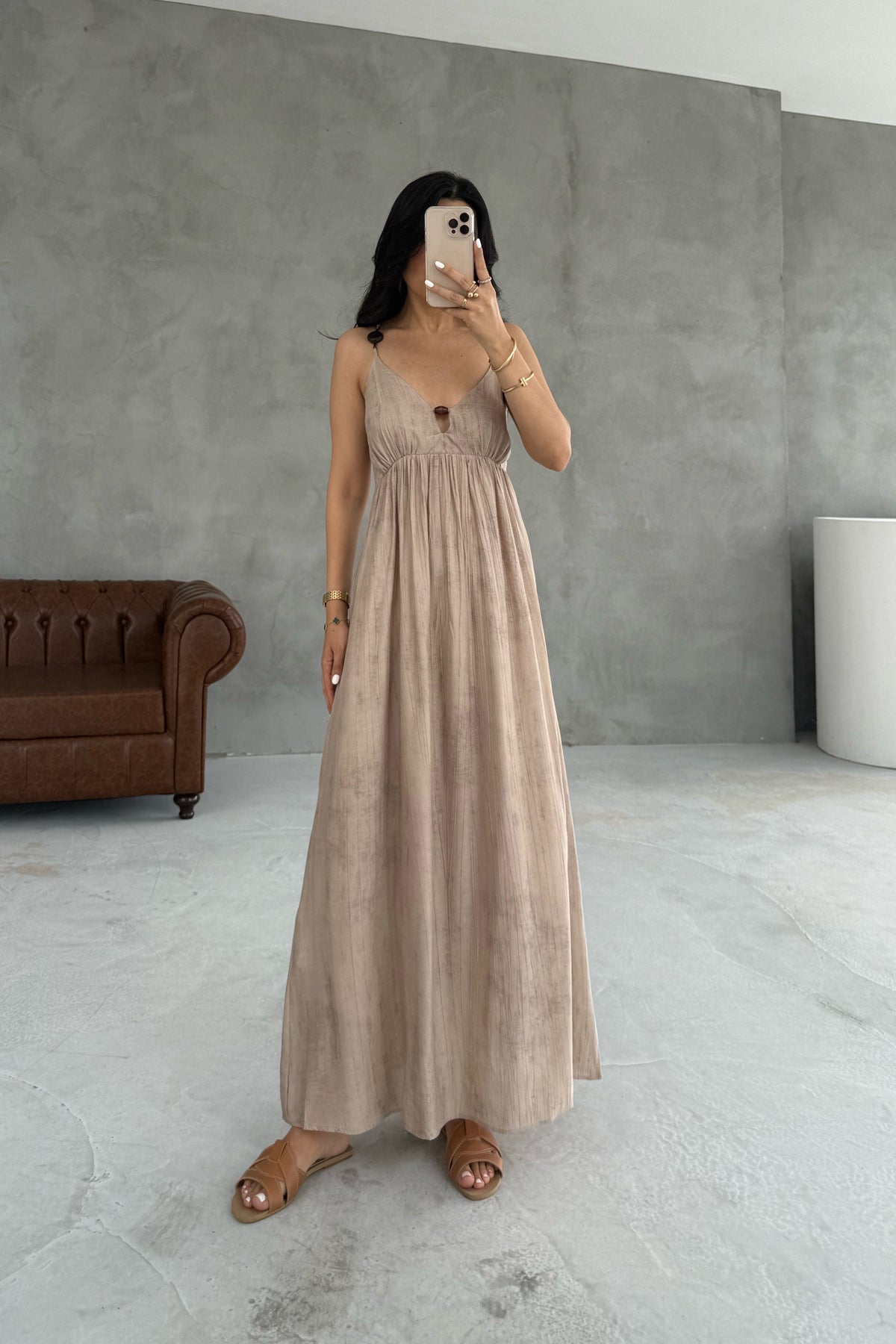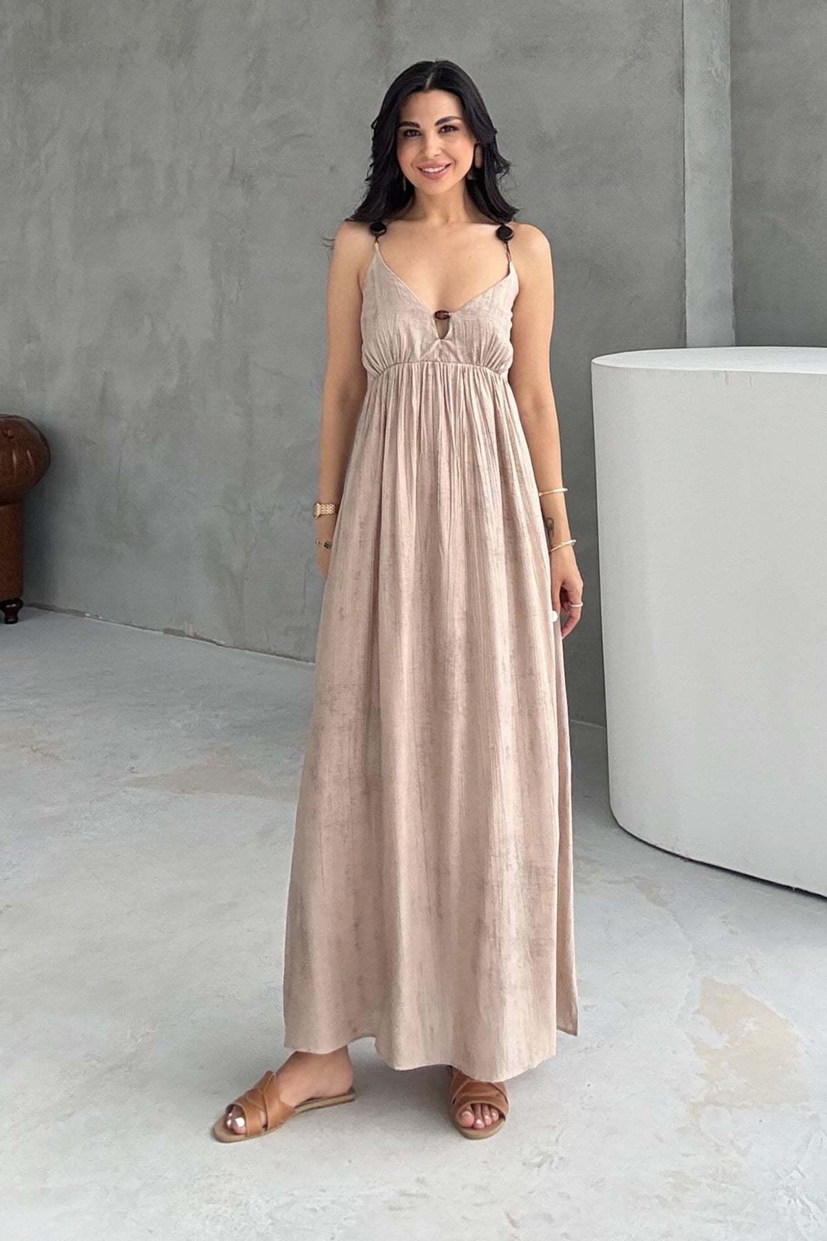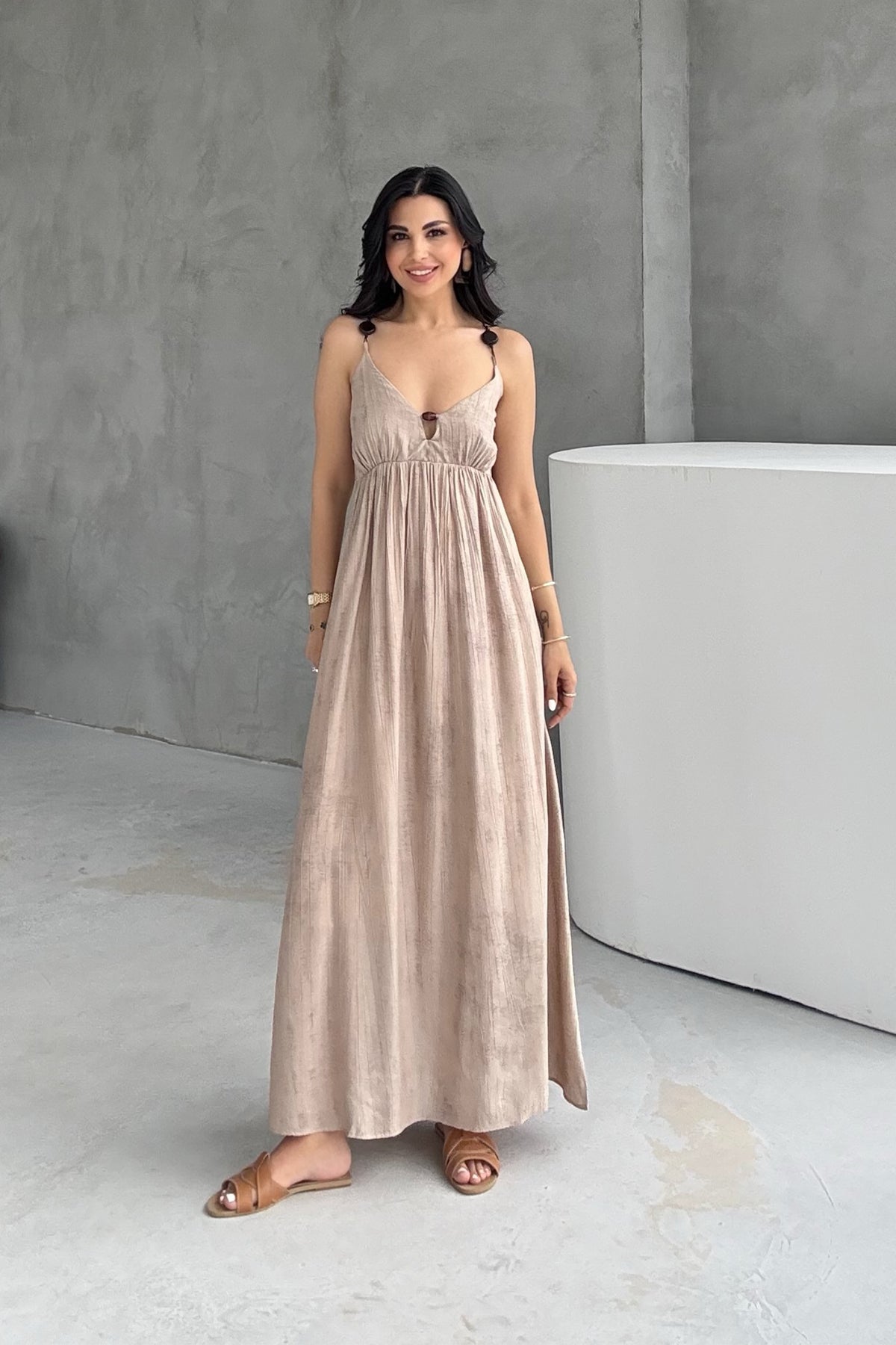 Vizon Boncuk Detaylı Askılı Elbise SY-3215-Vizon