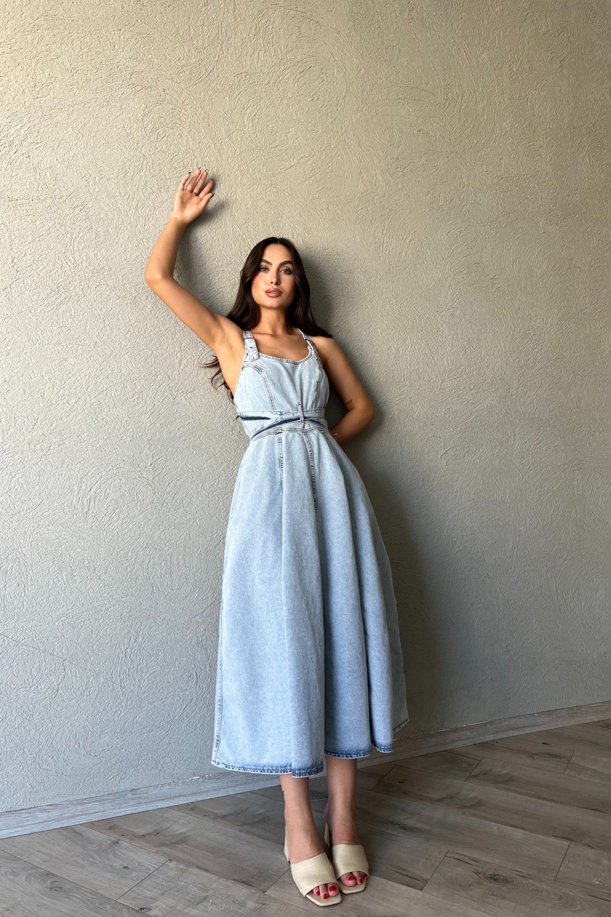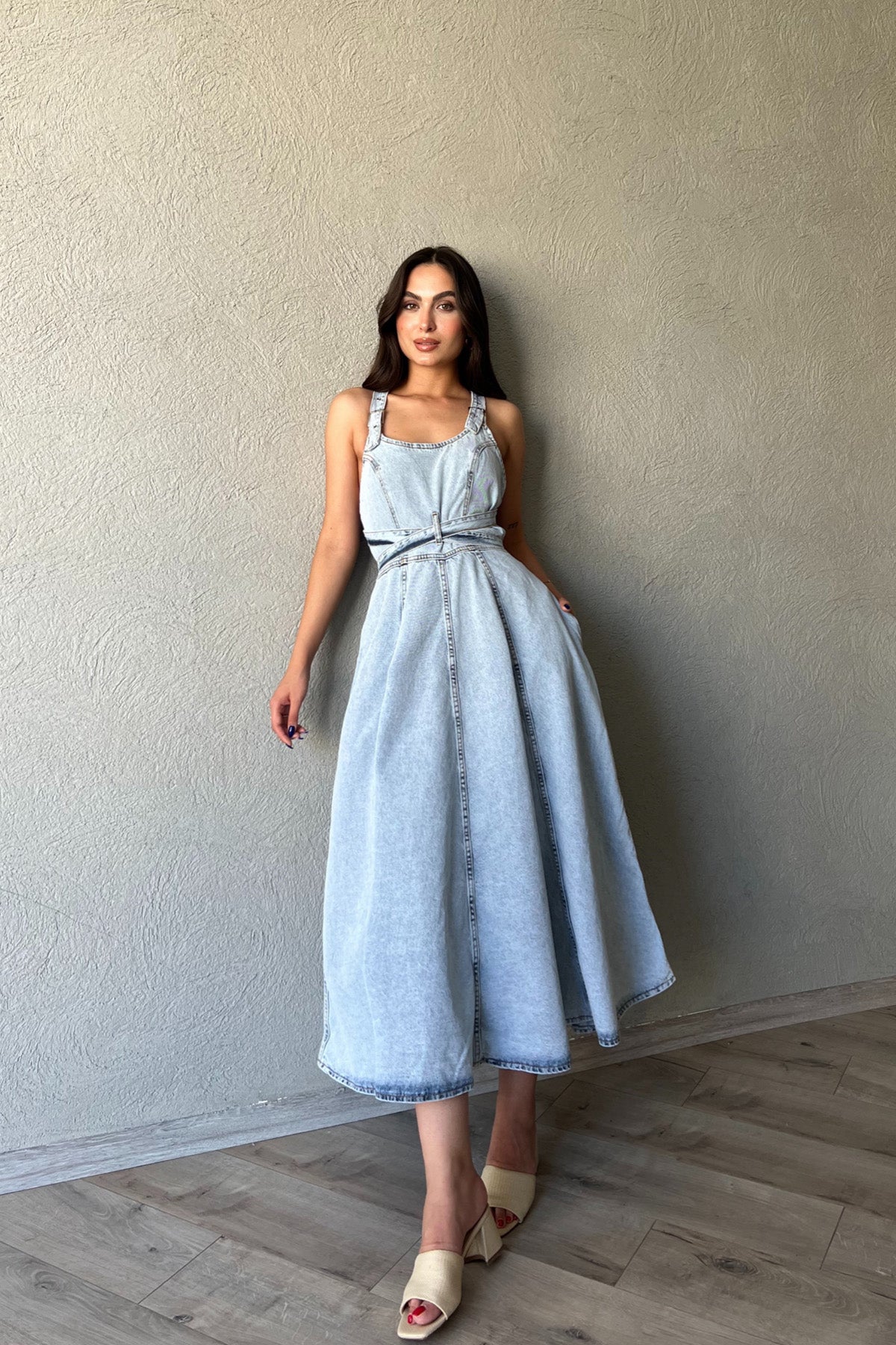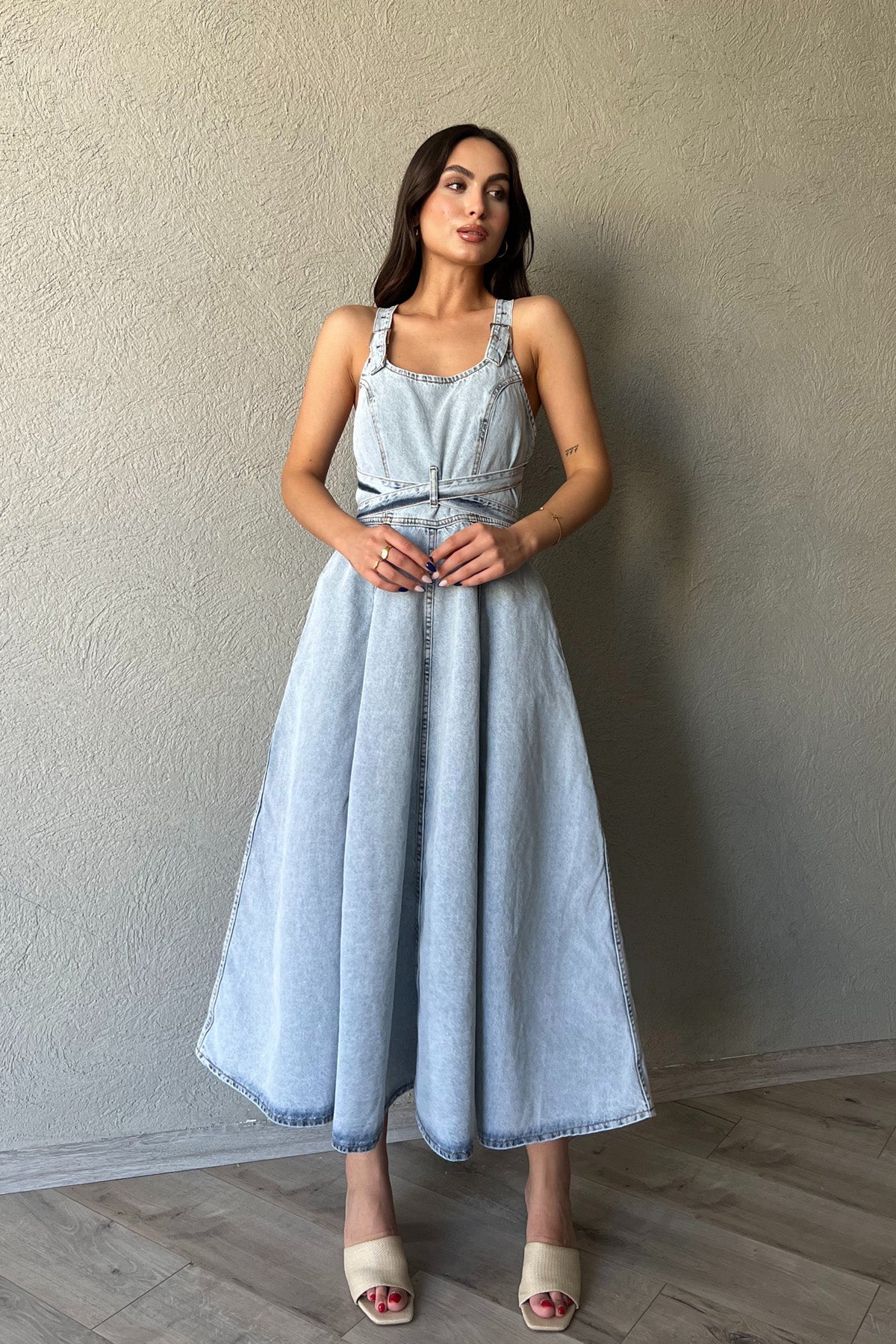 Açık Mavi Tasarım Bağlama Detay Denim Uzun Elbise SY-0836-Açık Mavi