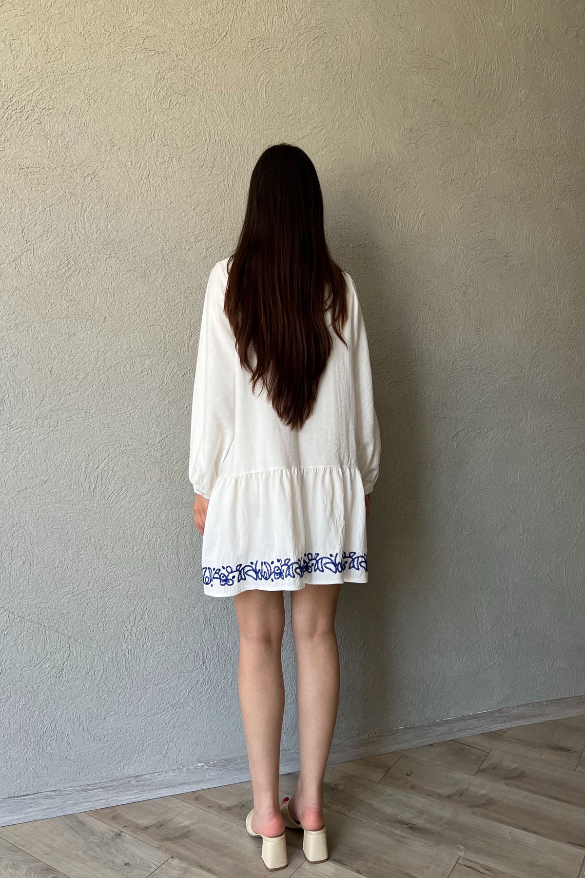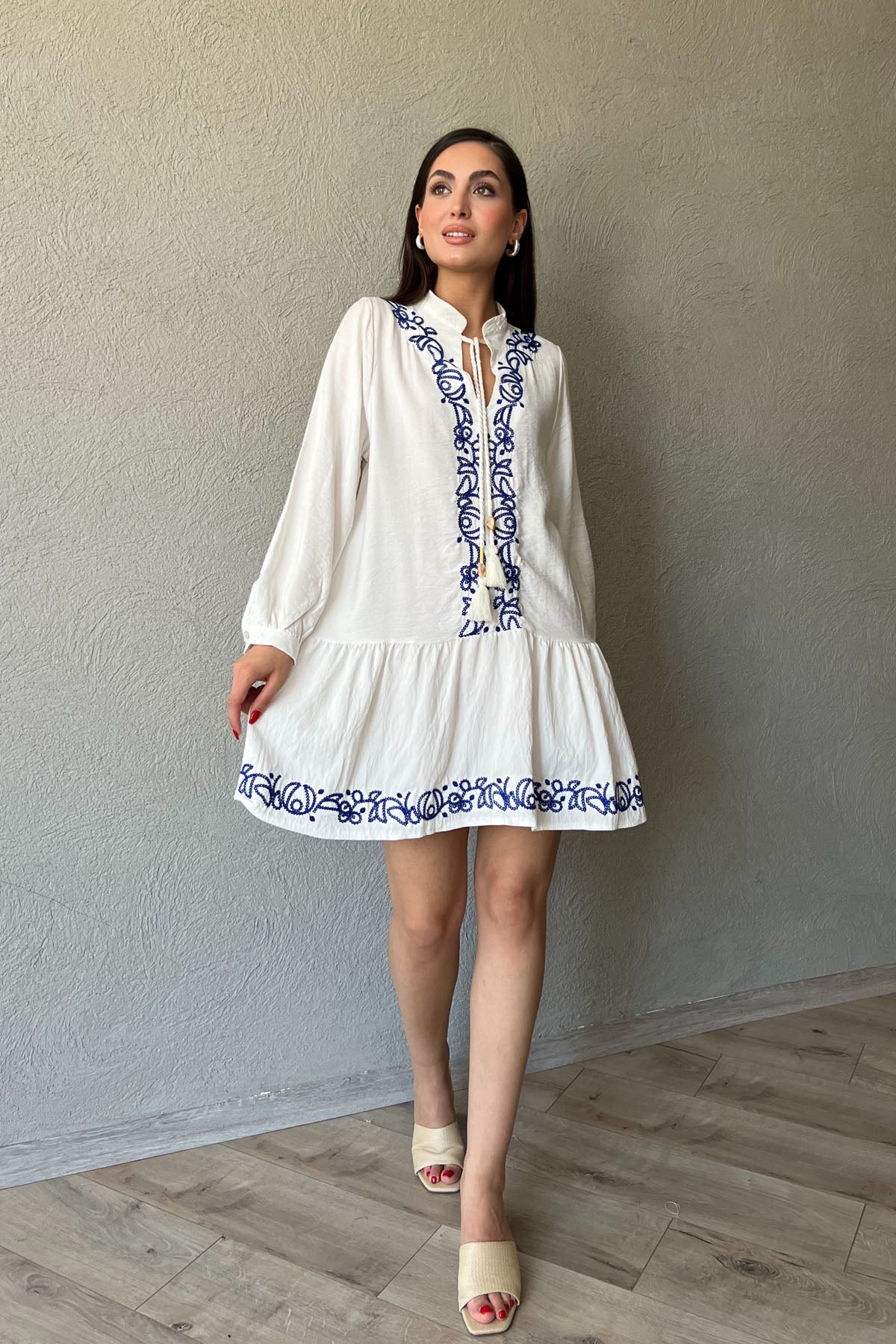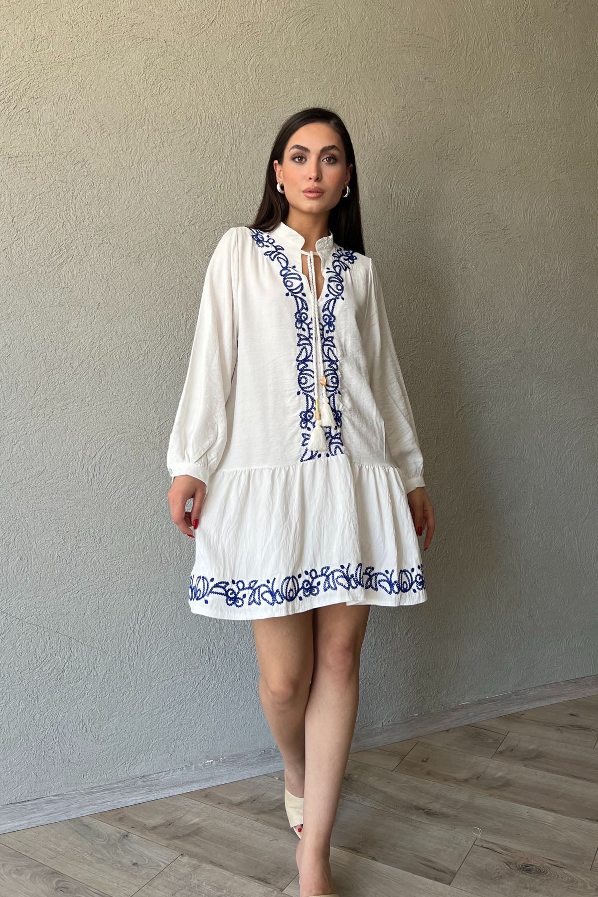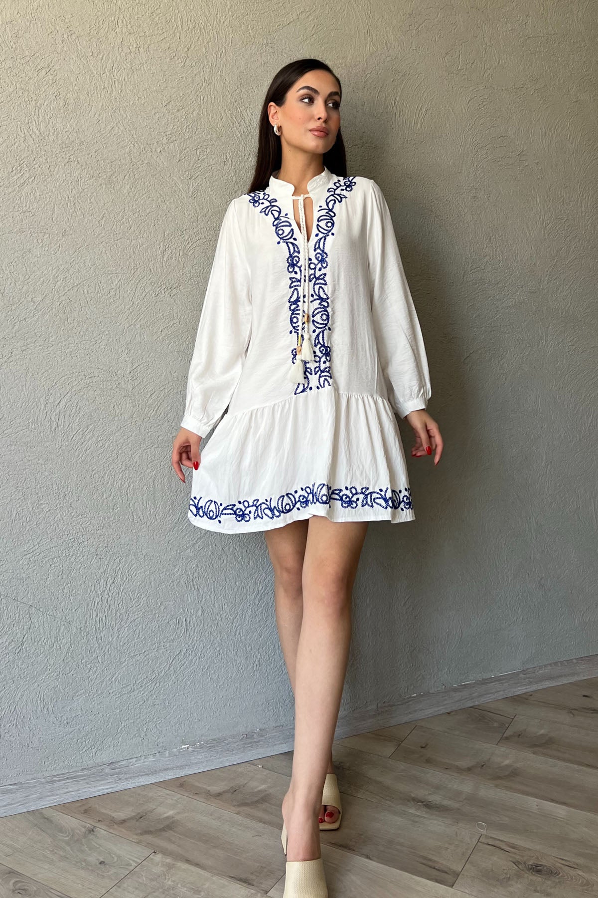 Beyaz Nakış Detaylı Keten Elbise SY-2043-Beyaz