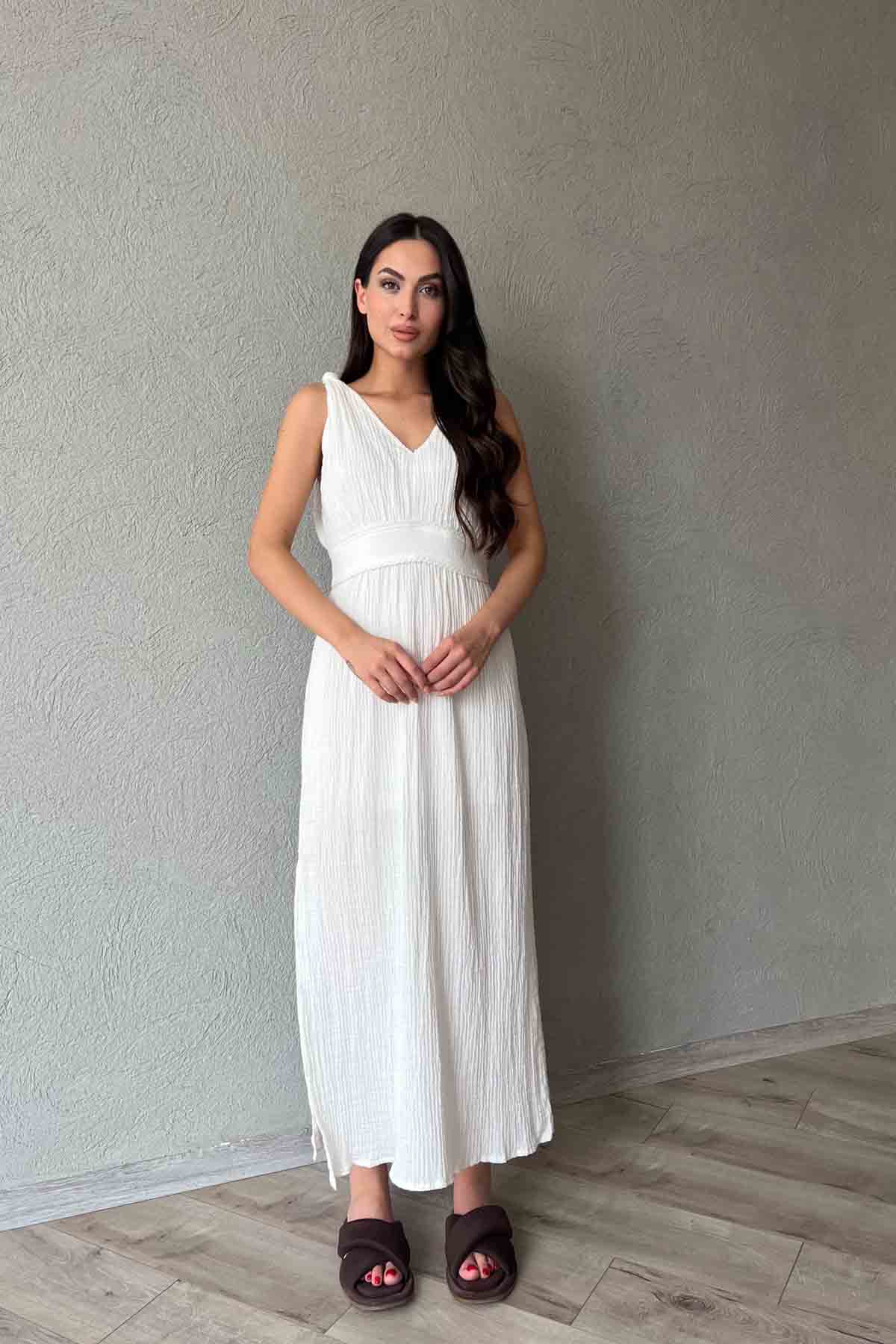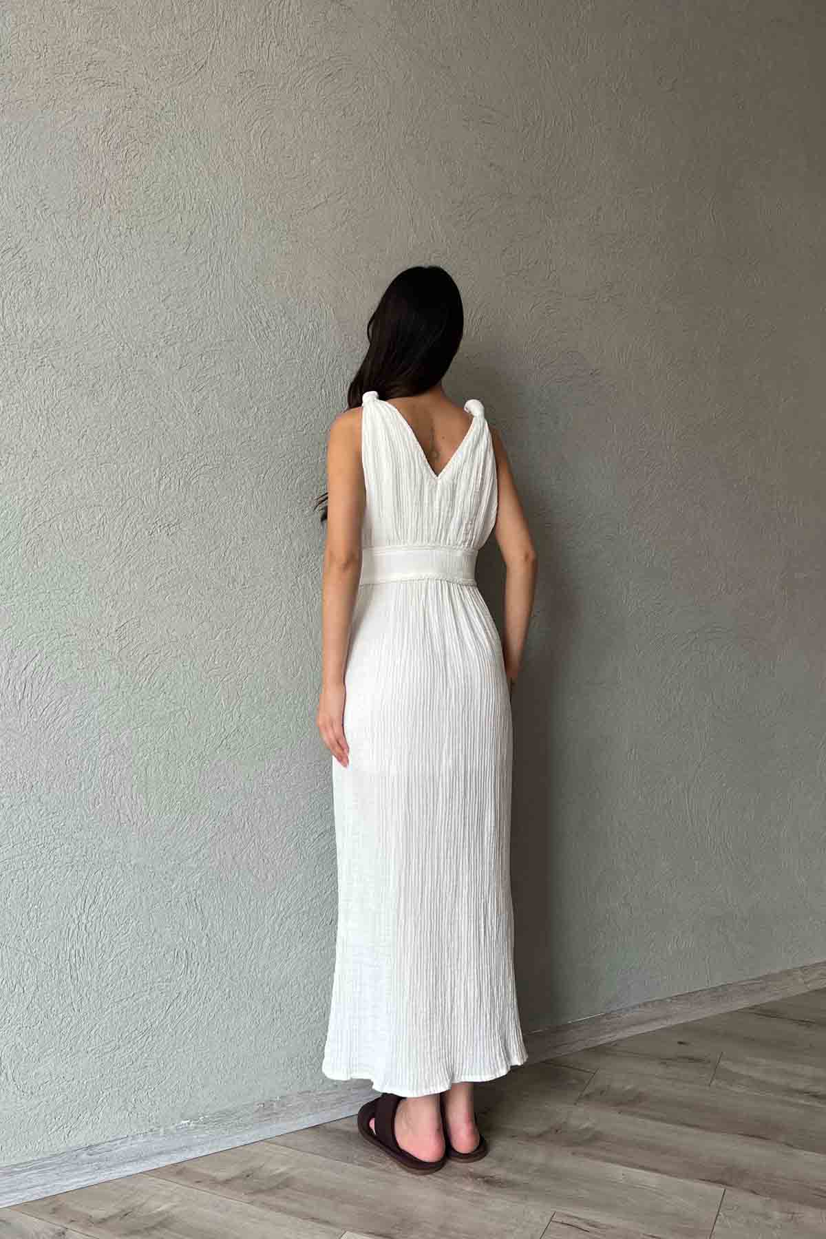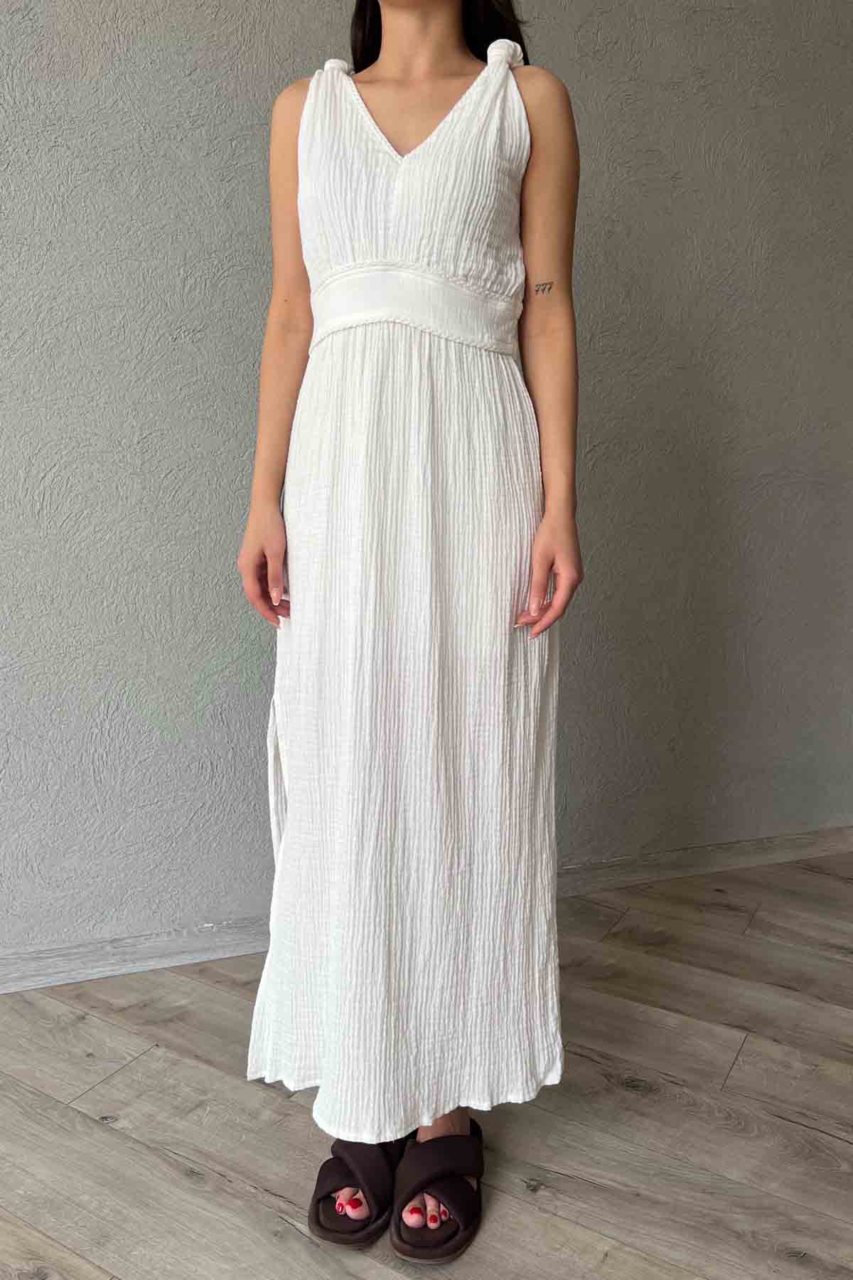 Beyaz Örme Detaylı Müslin Midi Boy Elbise SY-1982-Beyaz