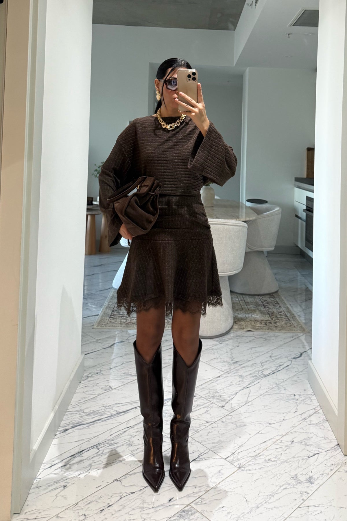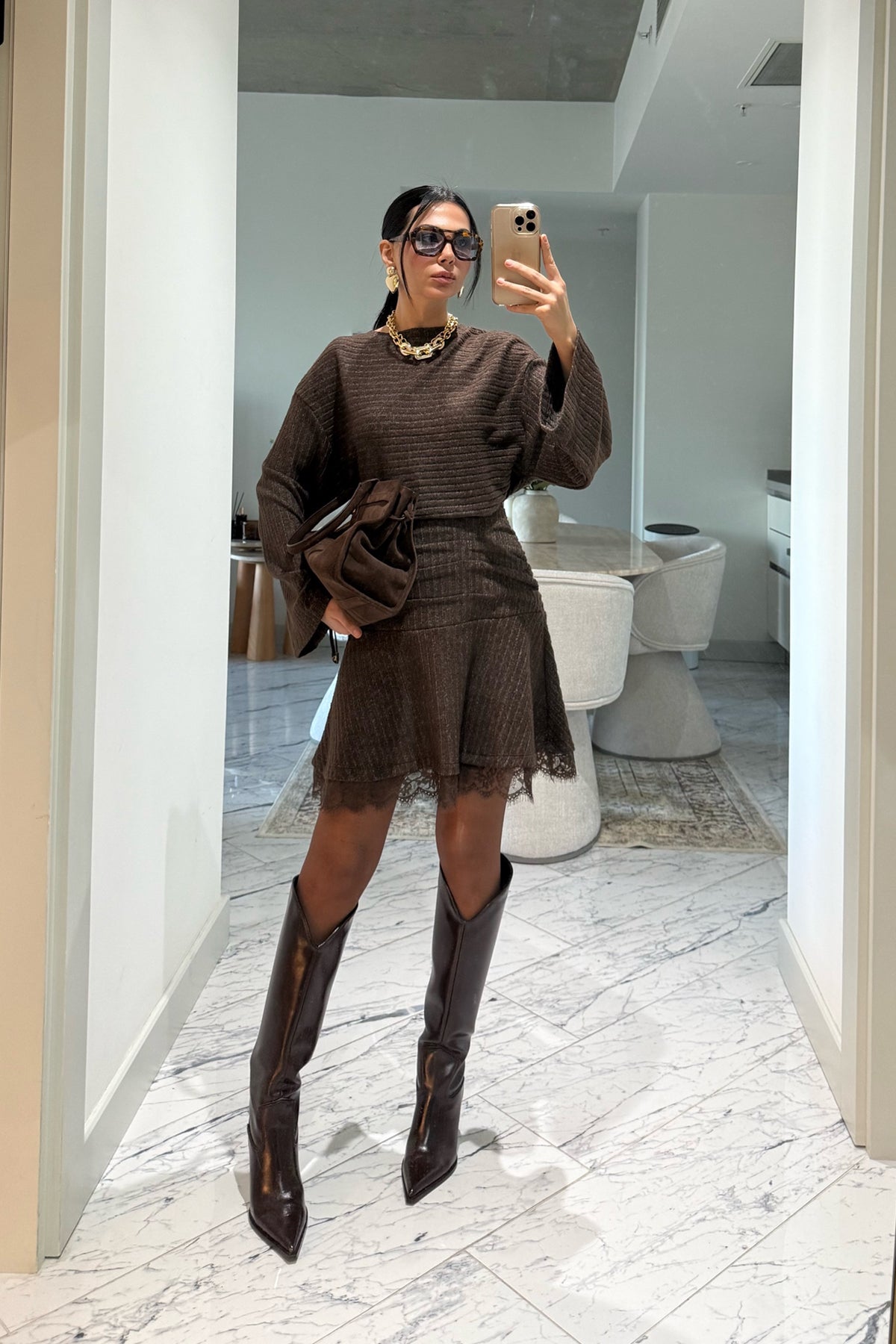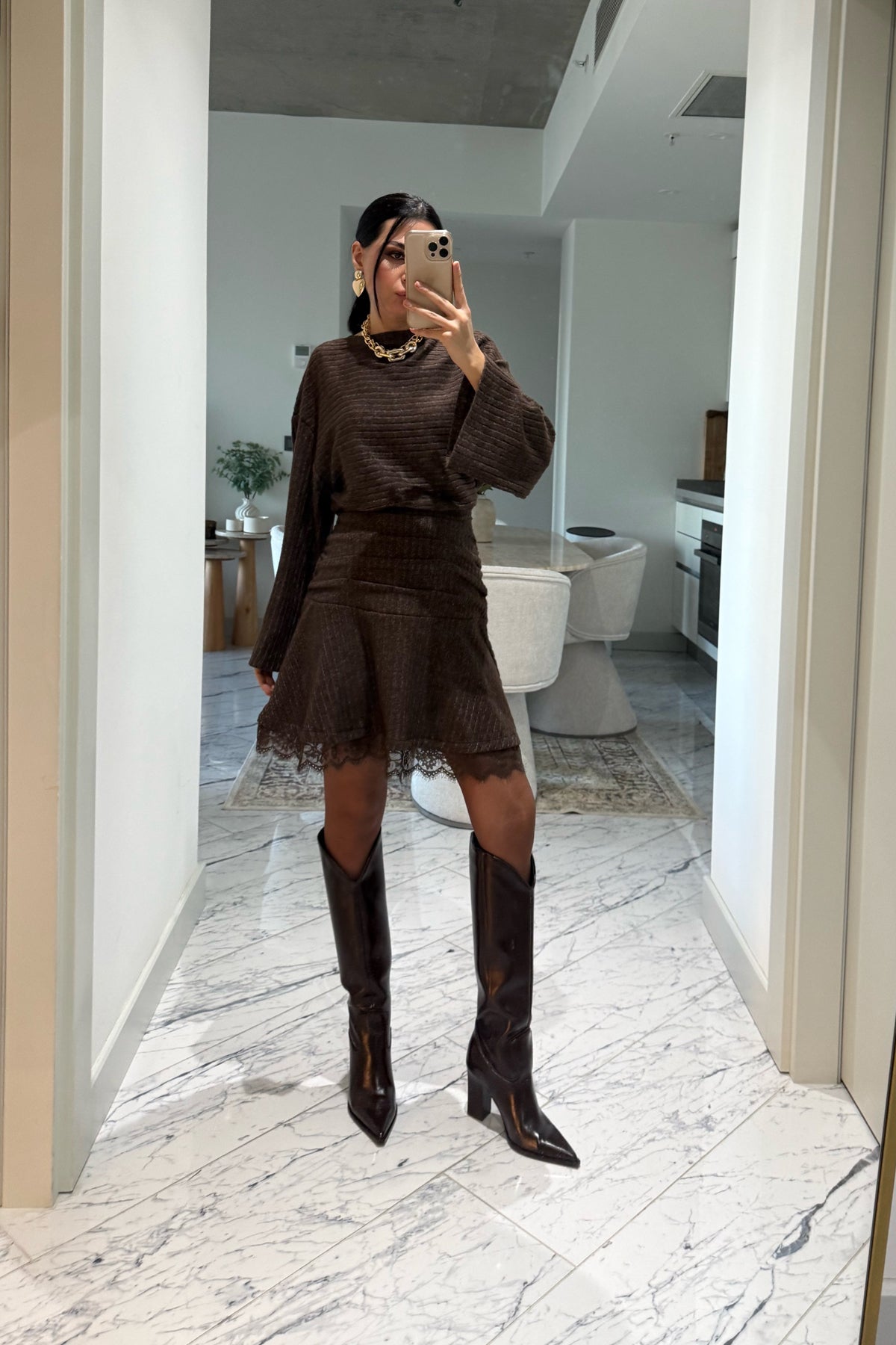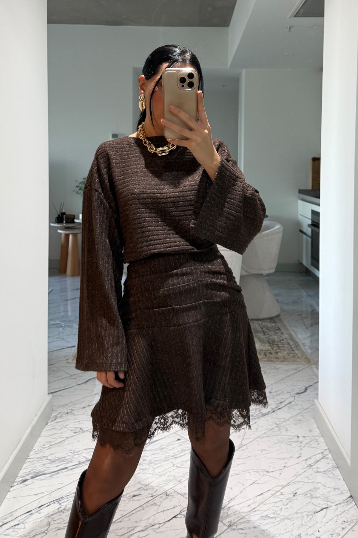 Brown Beli Büzgüli Dantel Detaylı Midi Elbise SY-3499-Kahverengi