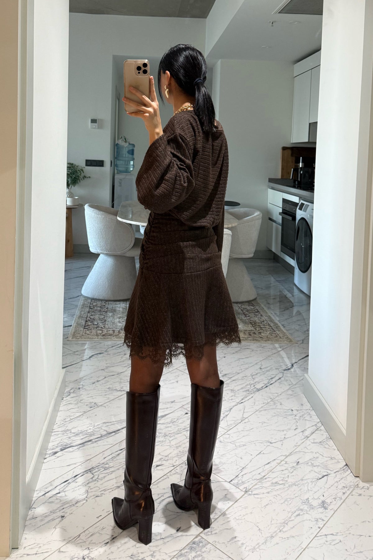 Ürün Detayları:Brown Beli Büzgüli Dantel Detaylı Midi Elbise