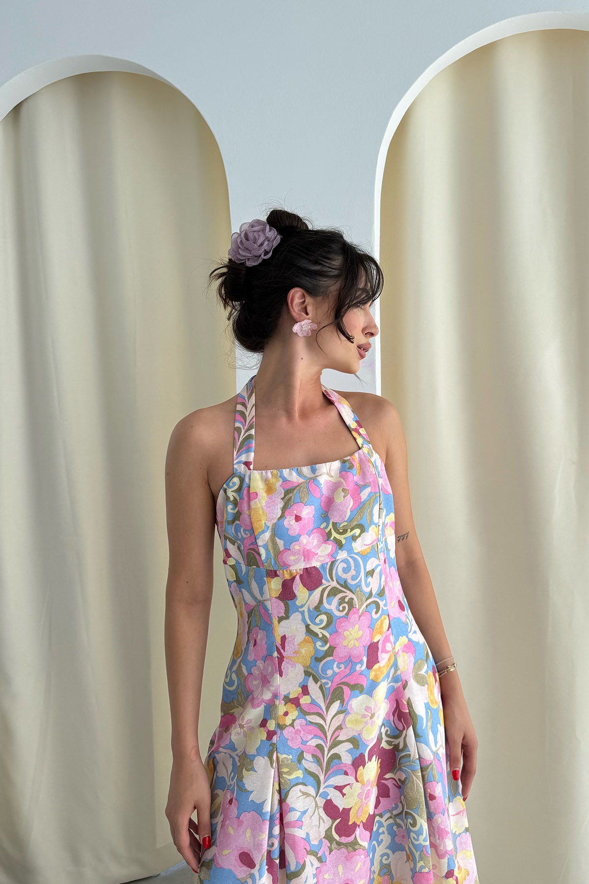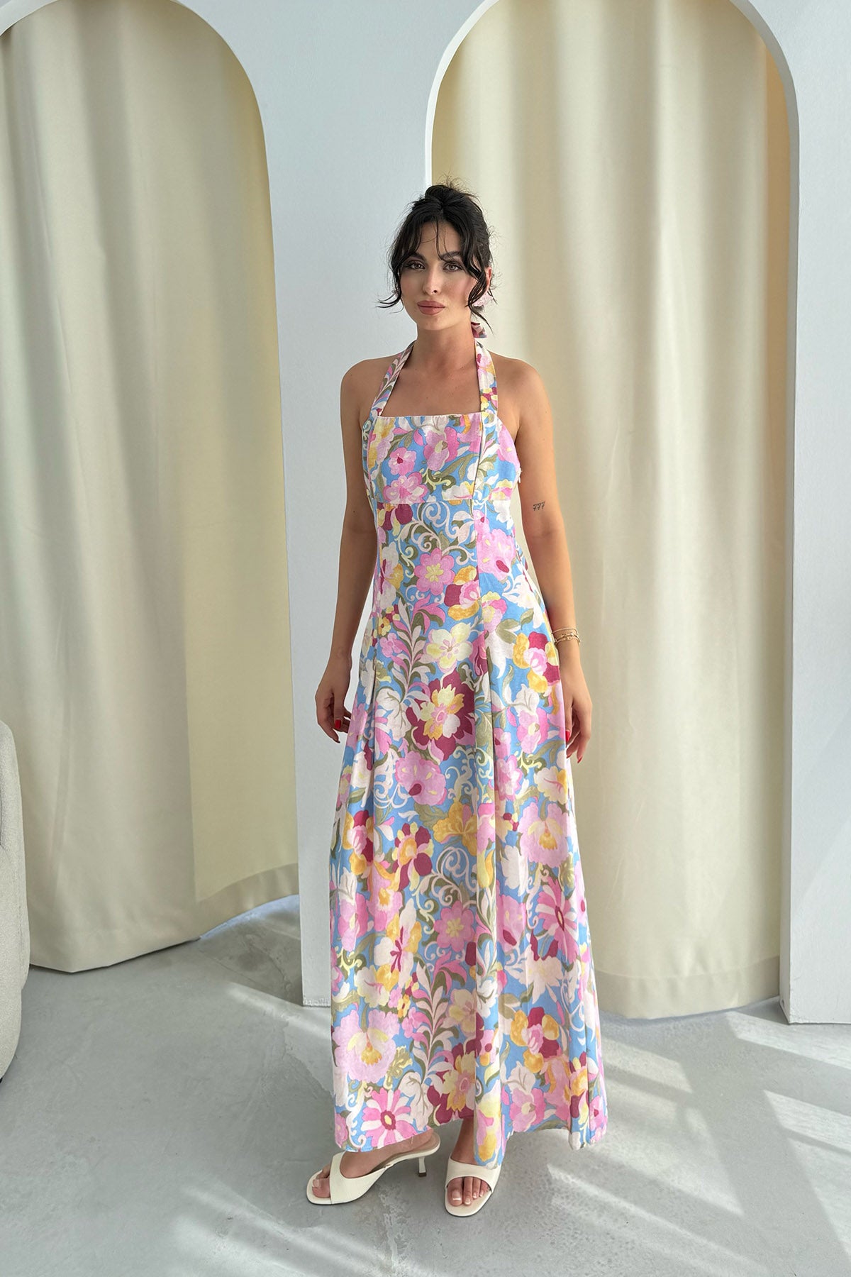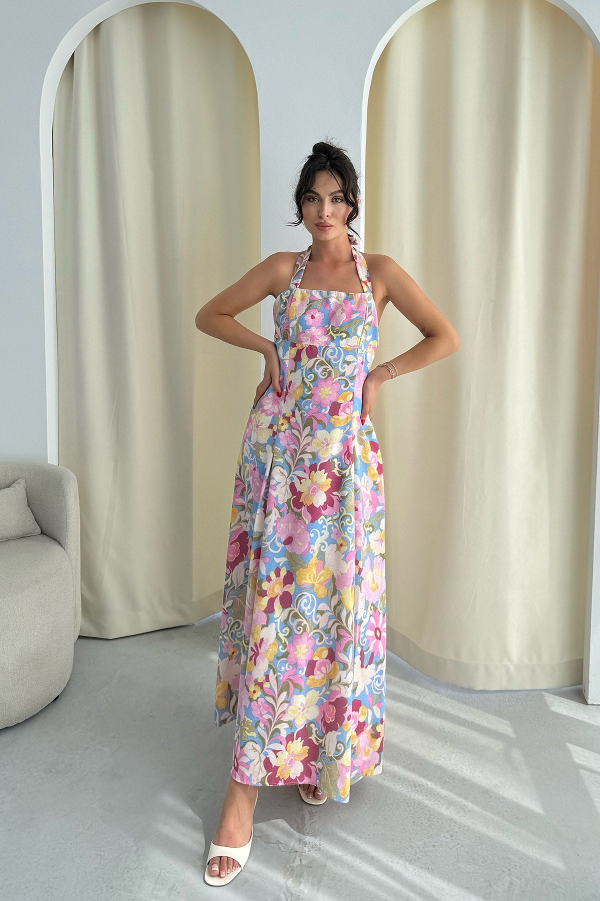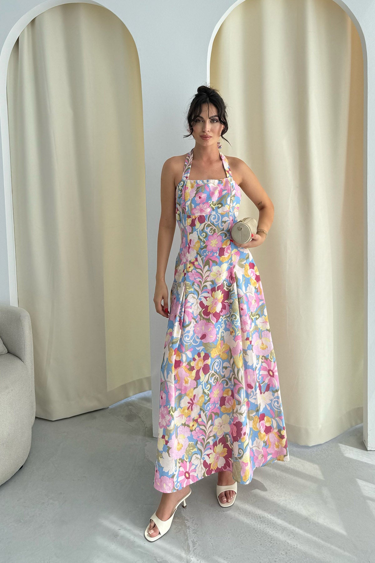 Çok Renkli Çiçek Desenli Midi Boy Keten Elbise SY-3267-Renkli