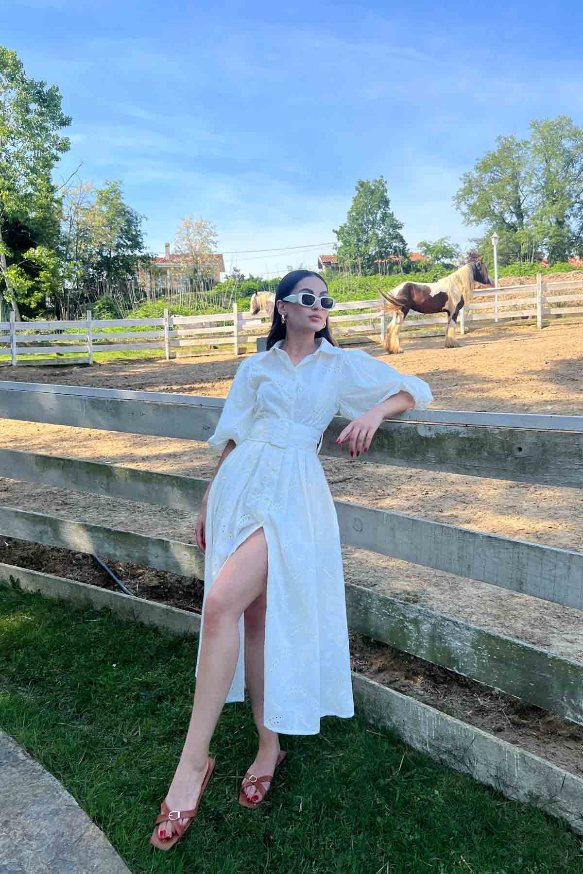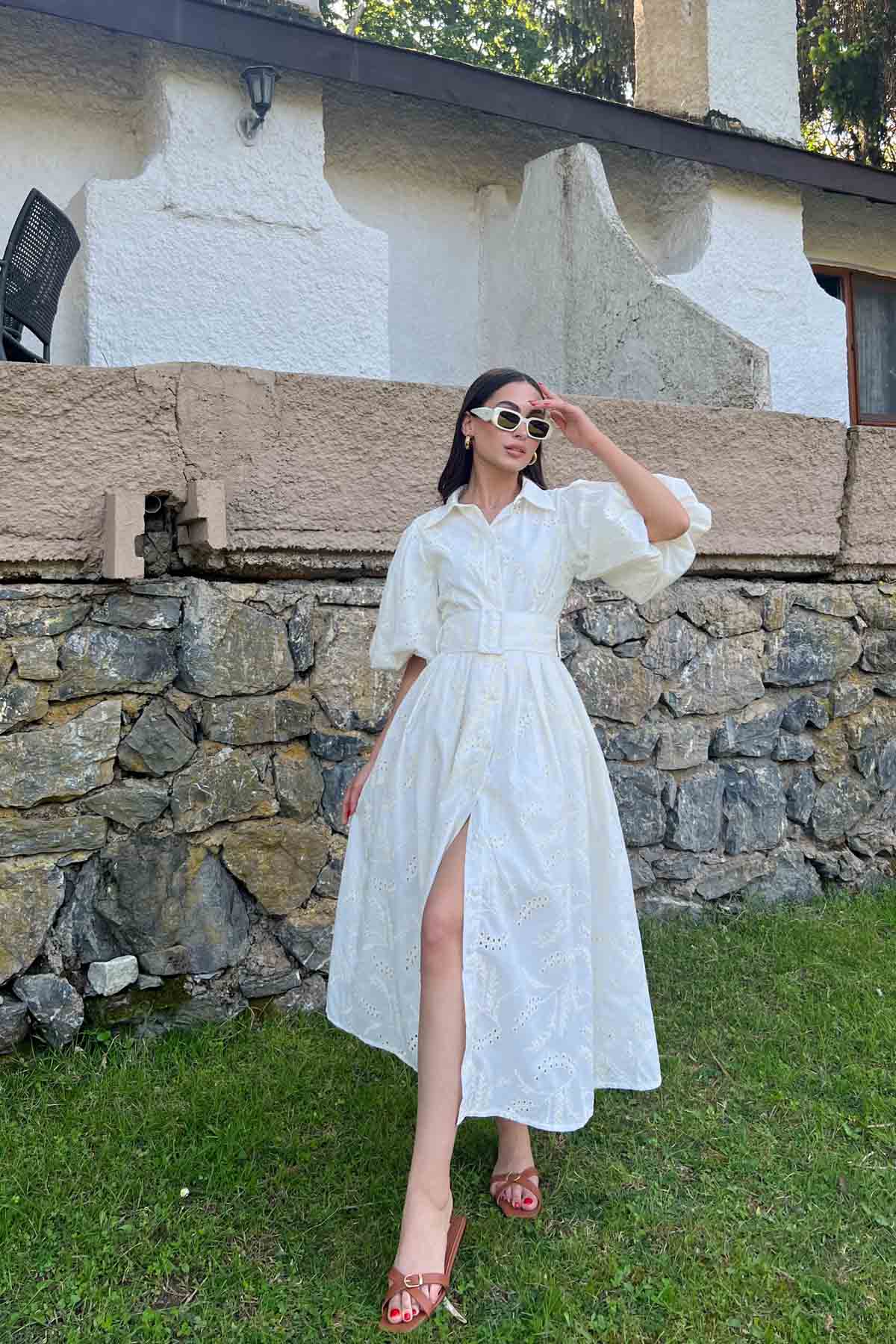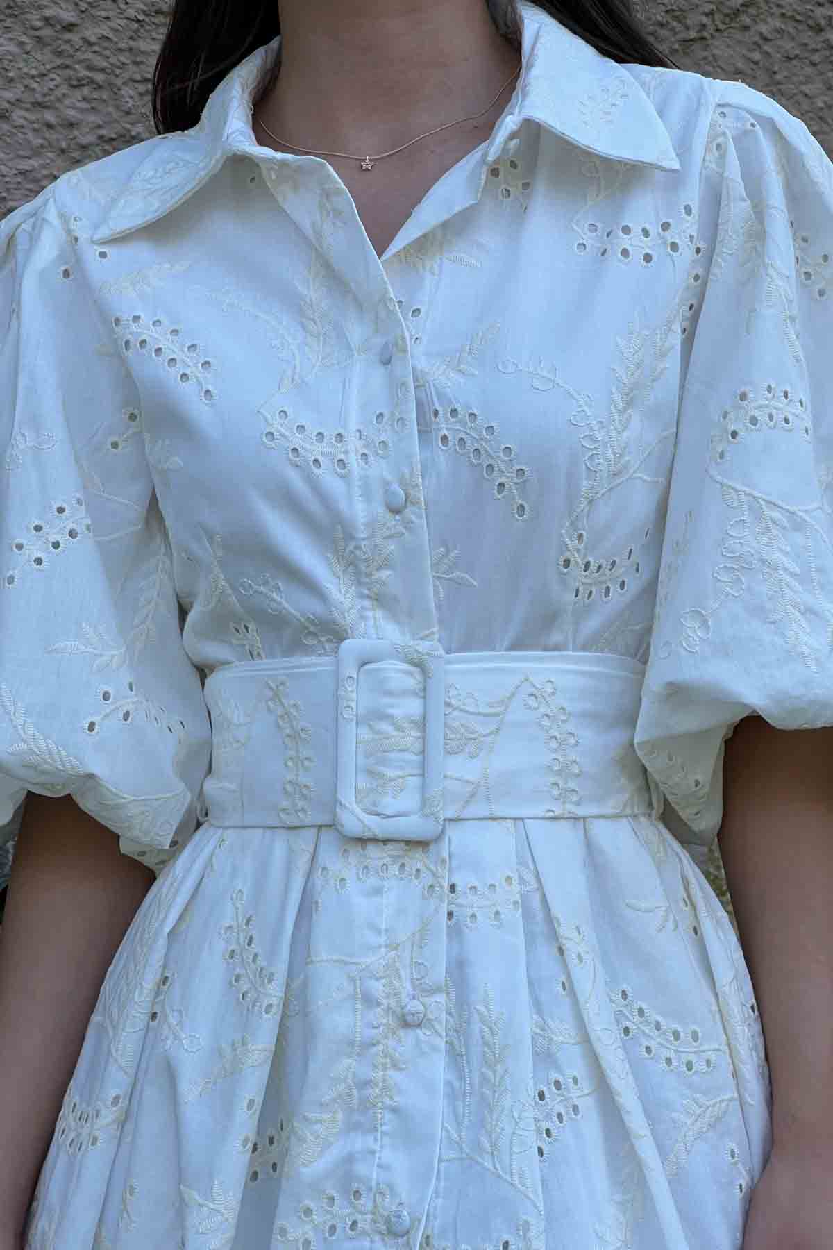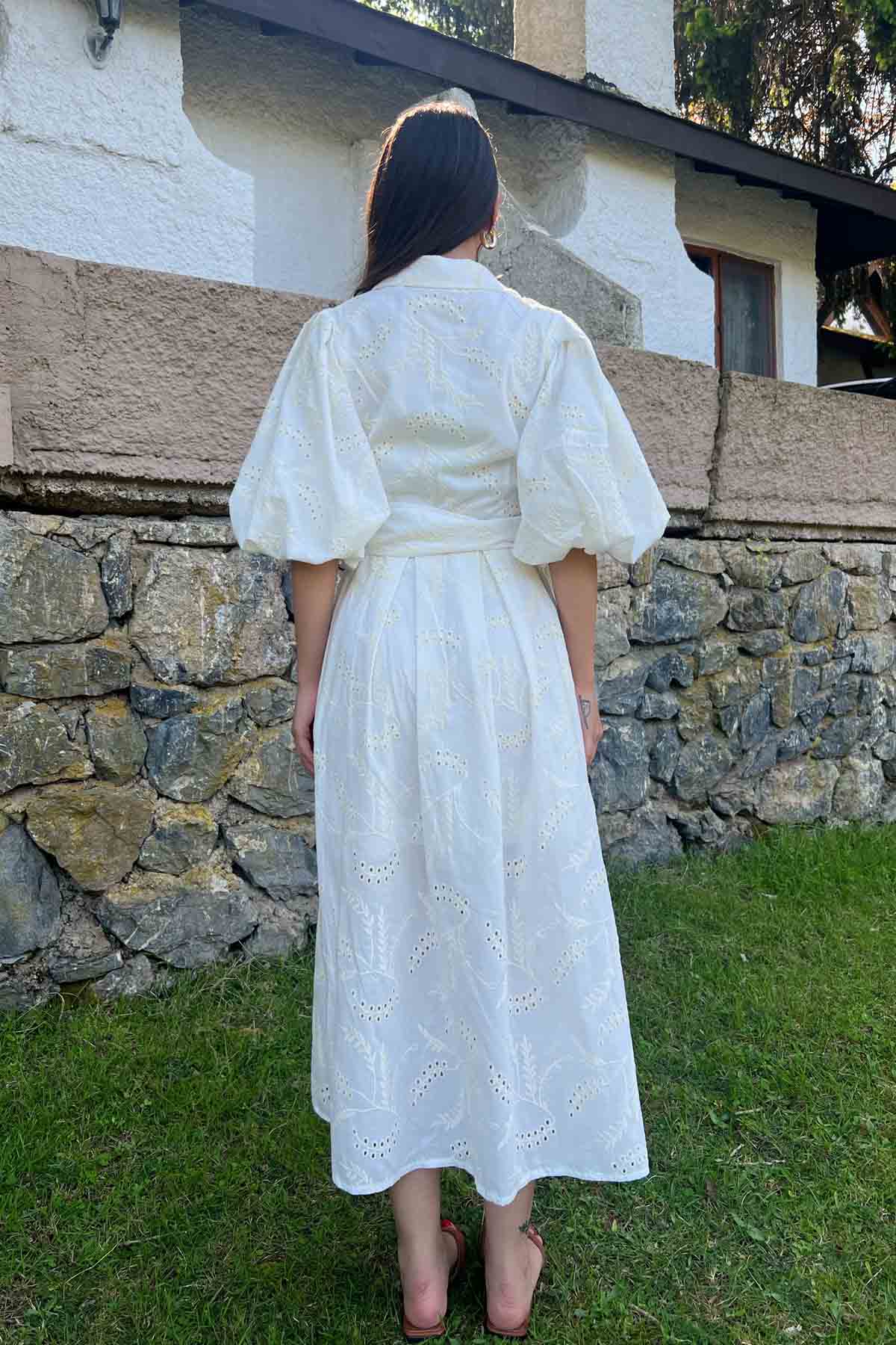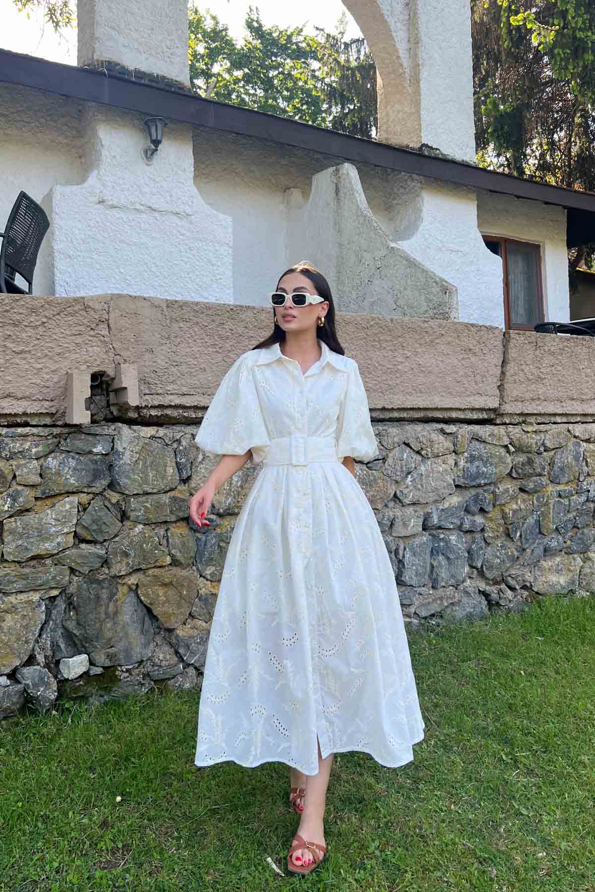 Ekru Balon Kol Pile Detaylı Kemerli Brode Elbise SY-2084-Ekru