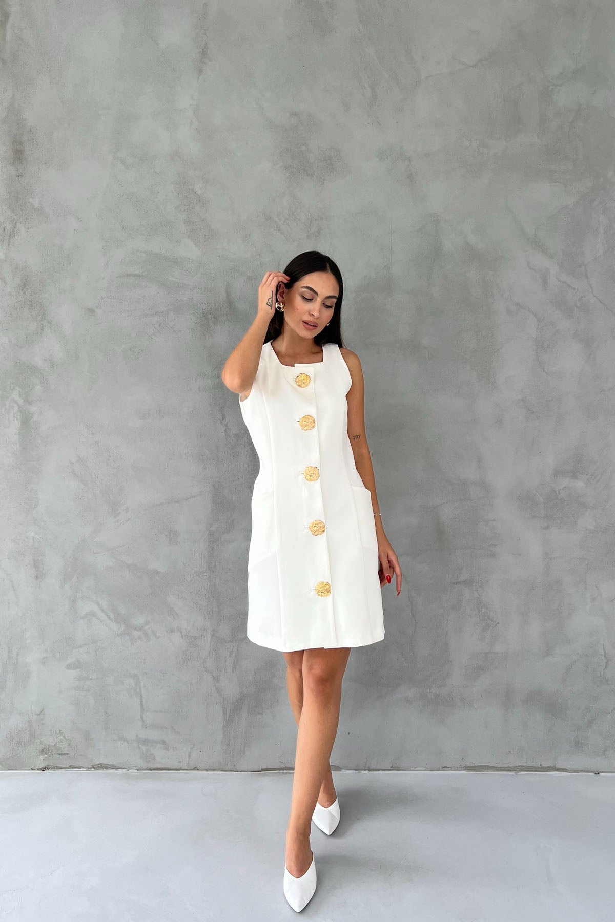 Ekru Büyük Gold Düğme Detaylı Kısa Elbise SY-2449-Ekru