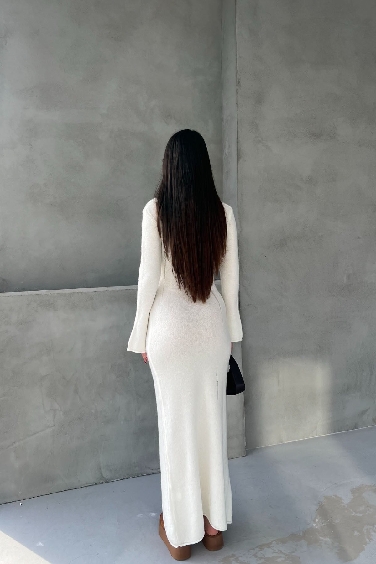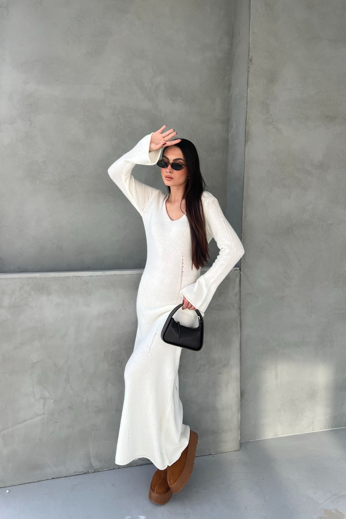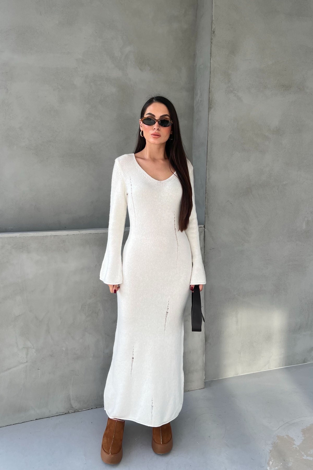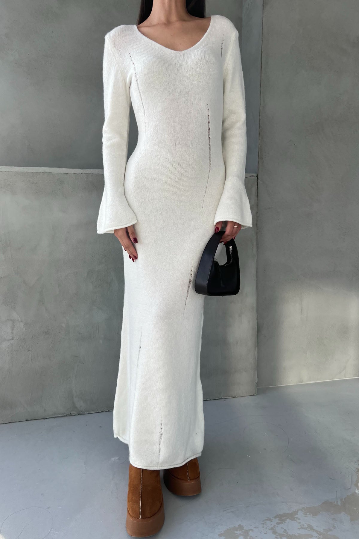 Ekru V Yaka Yırtık Detaylı Triko Uzun Elbise SY-2527-Ekru