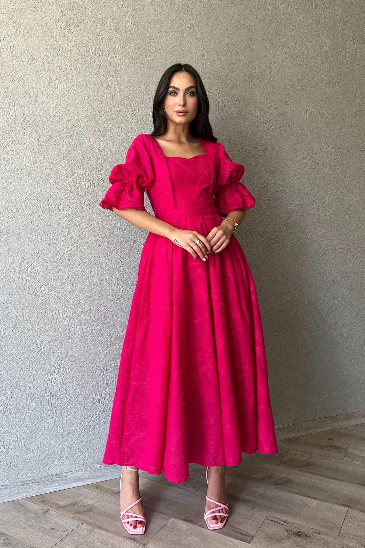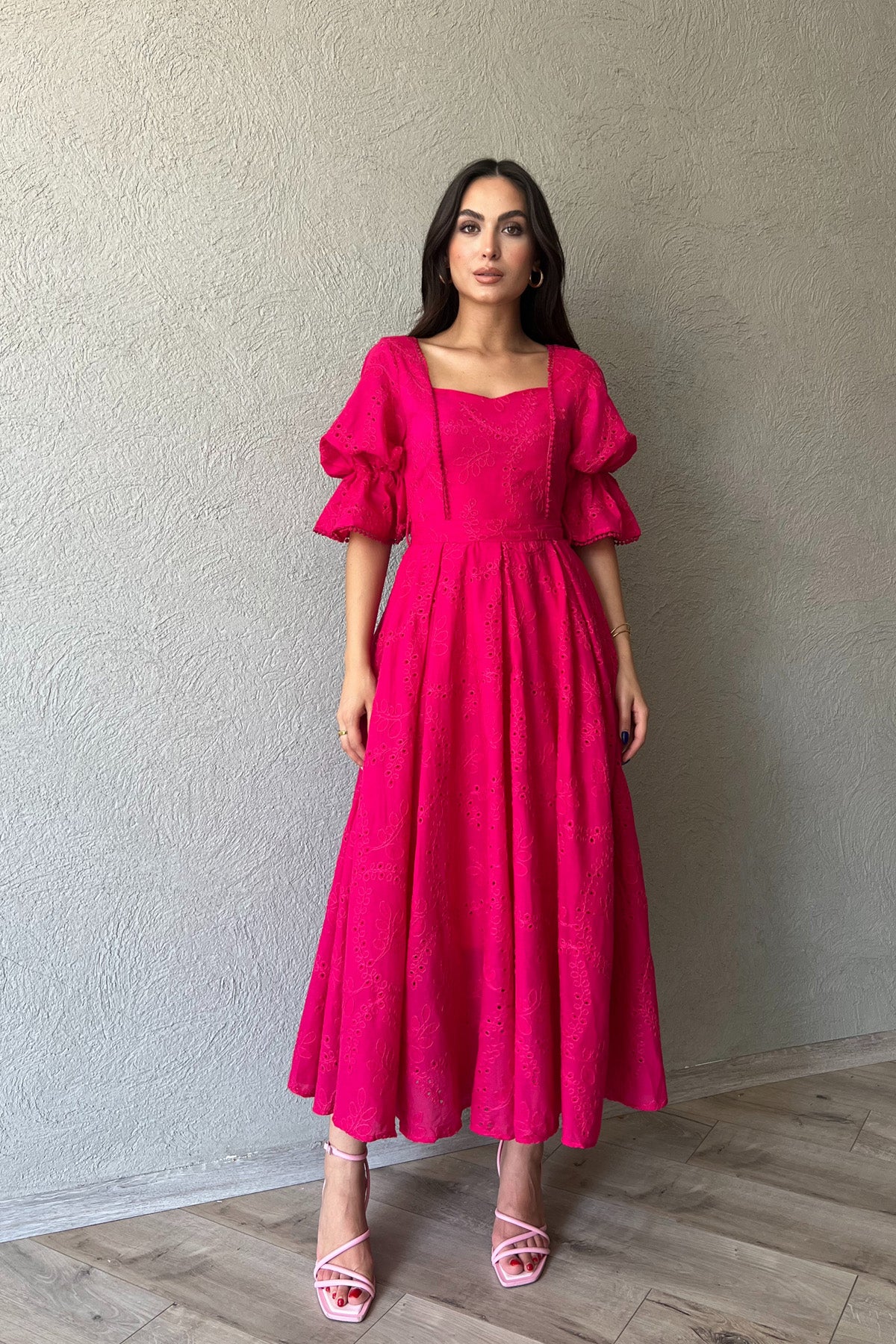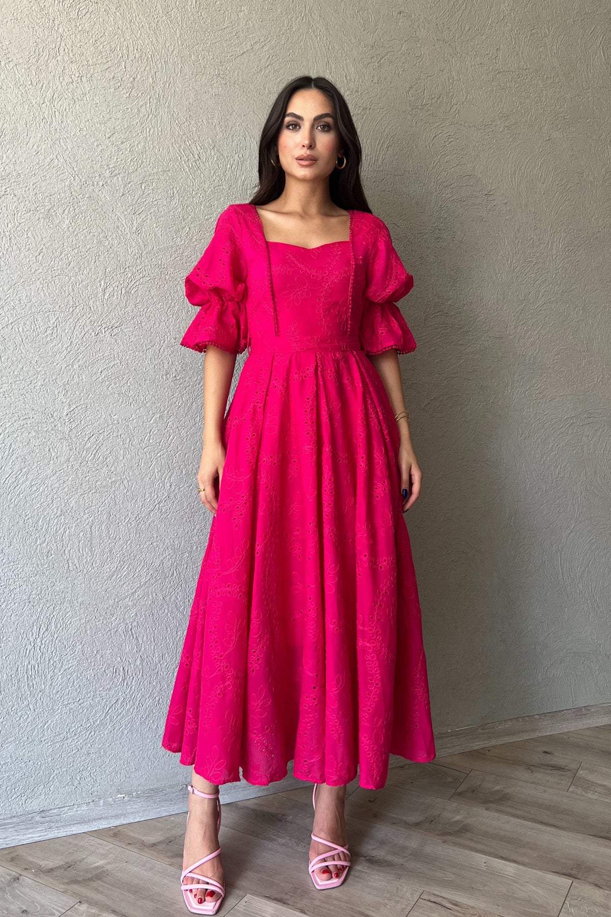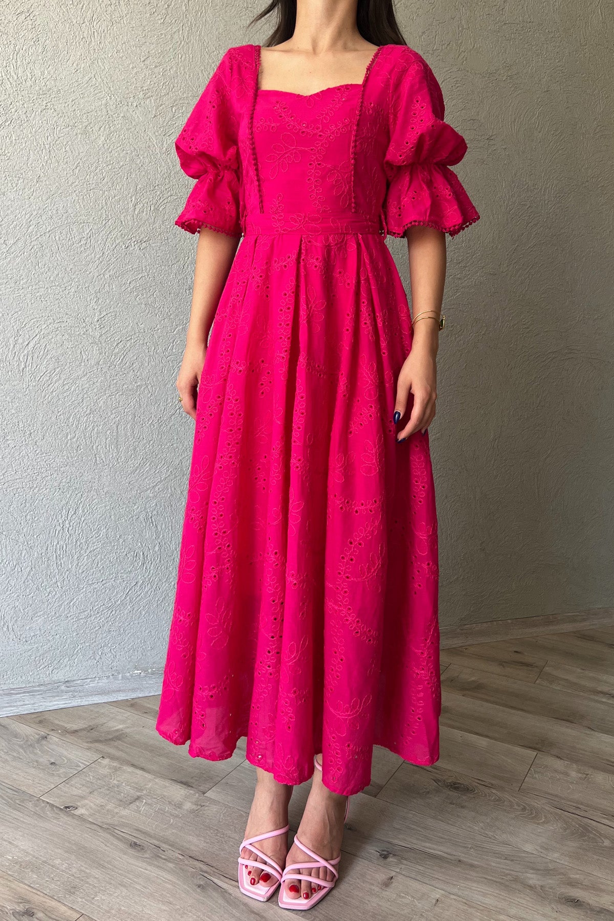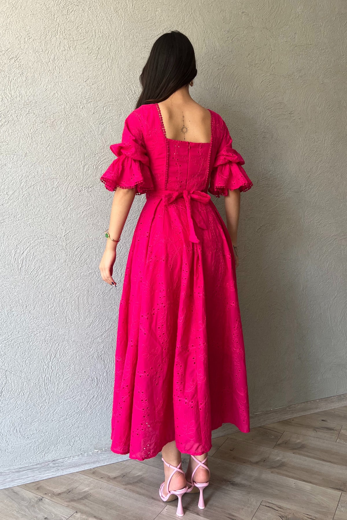 Fuşya Kolu Lastik Detaylı Güpür Detaylı Brode Elbise SY-2109-Fuşya
