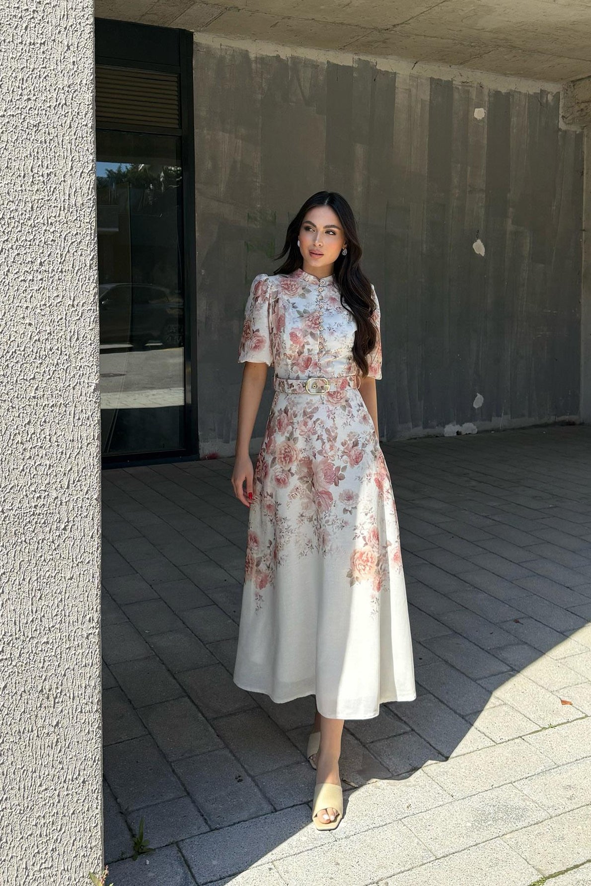 Gold Kemerli Çiçek Desenli Kloş Uzun Elbise (Kemersiz) SY-3378