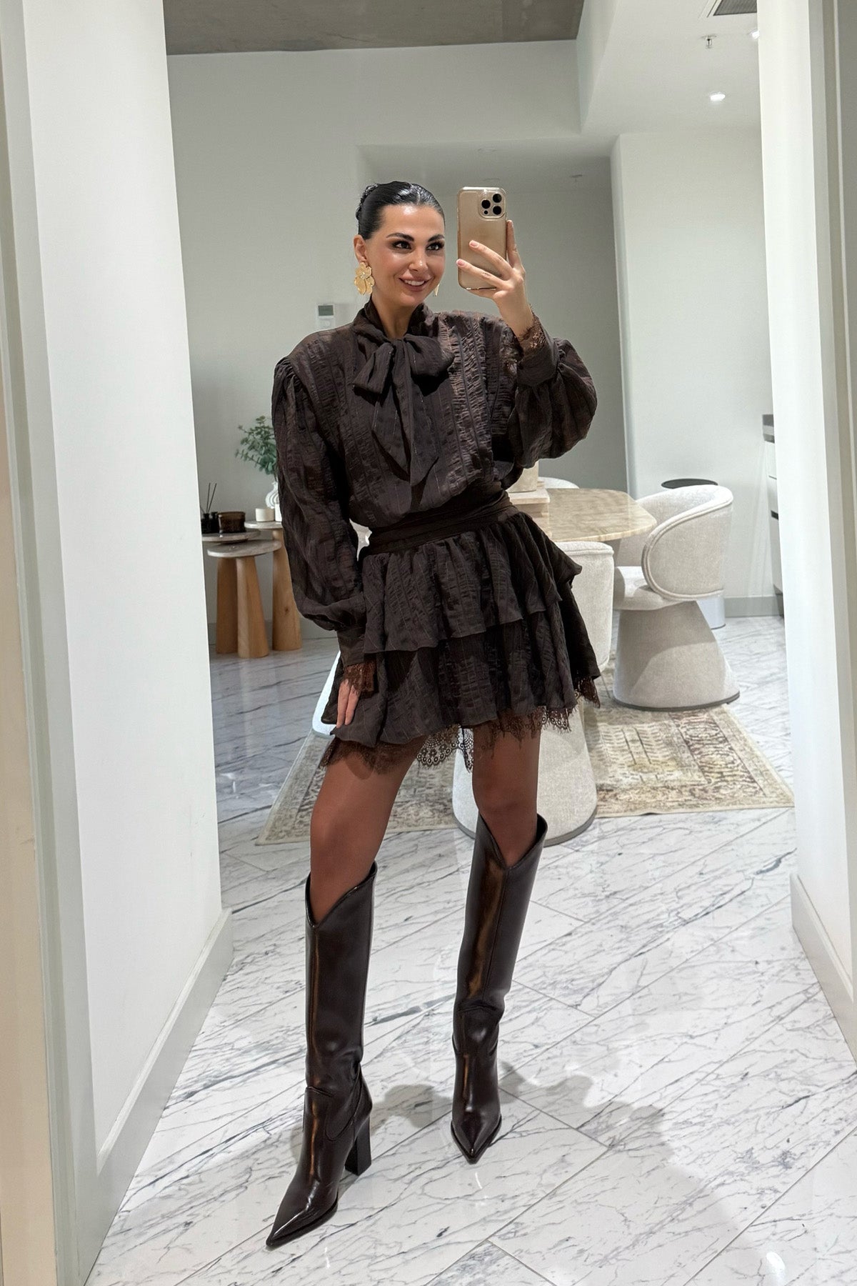 Kahve Dantel Detaylı Vatkalı Vintage Elbise SY-3528-Kahve
