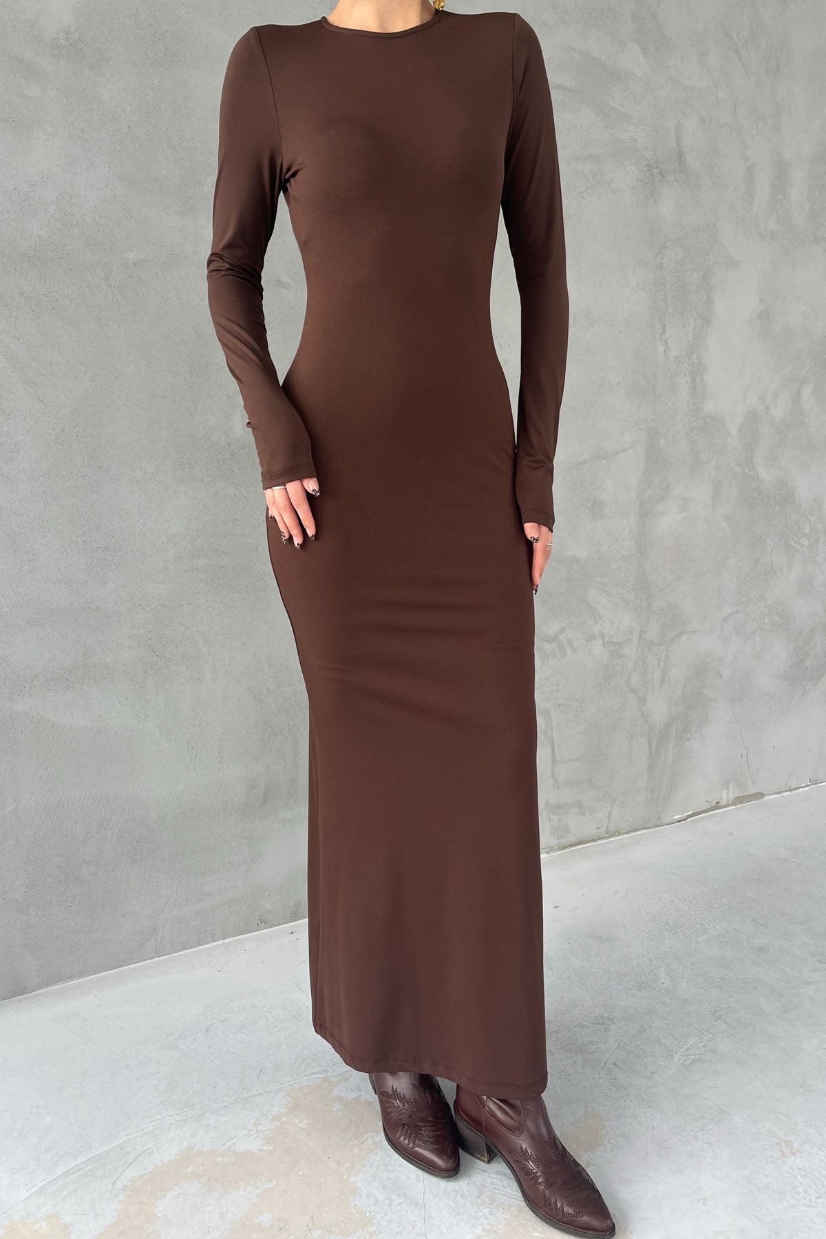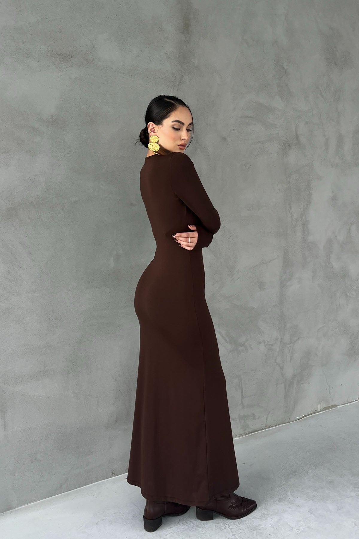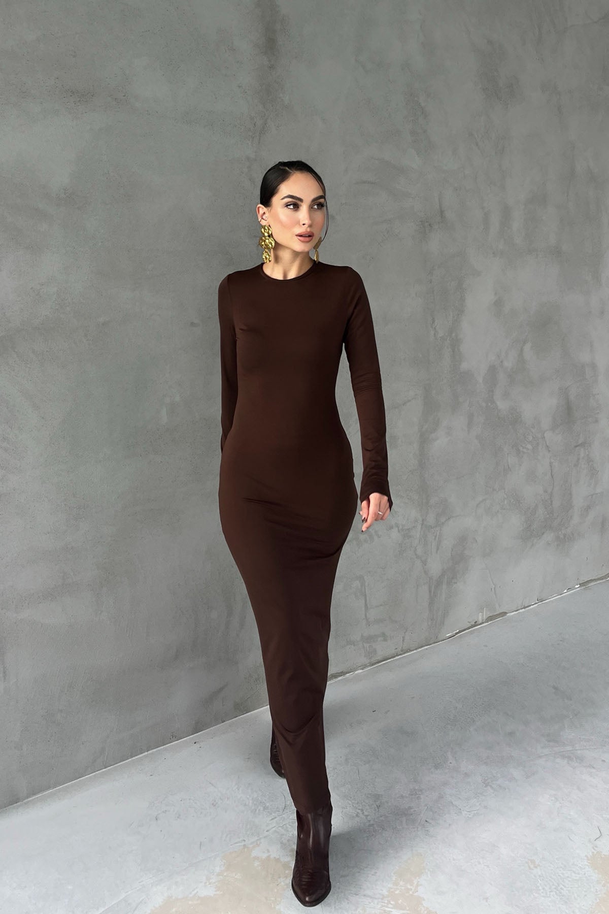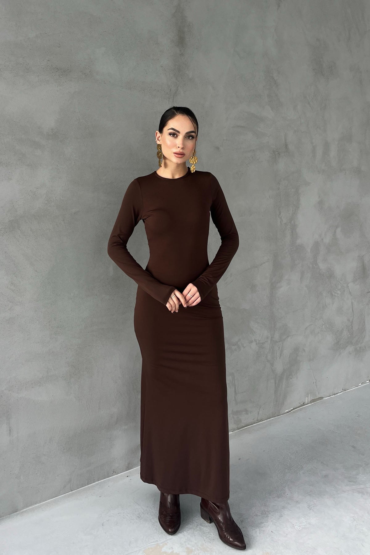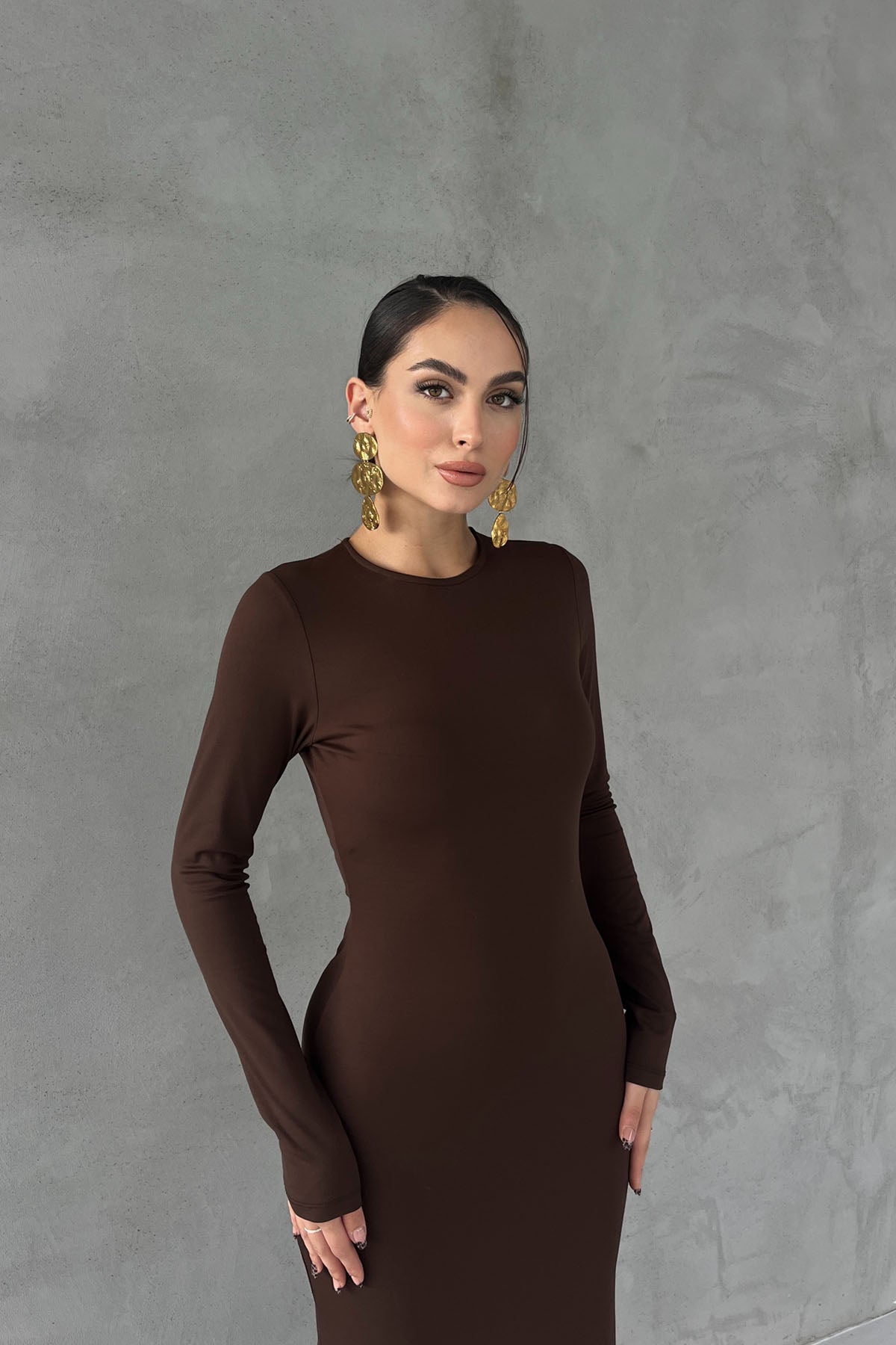 Kahverengi Lyon Uzun Kollu Elbise SY-2757-Kahverengi