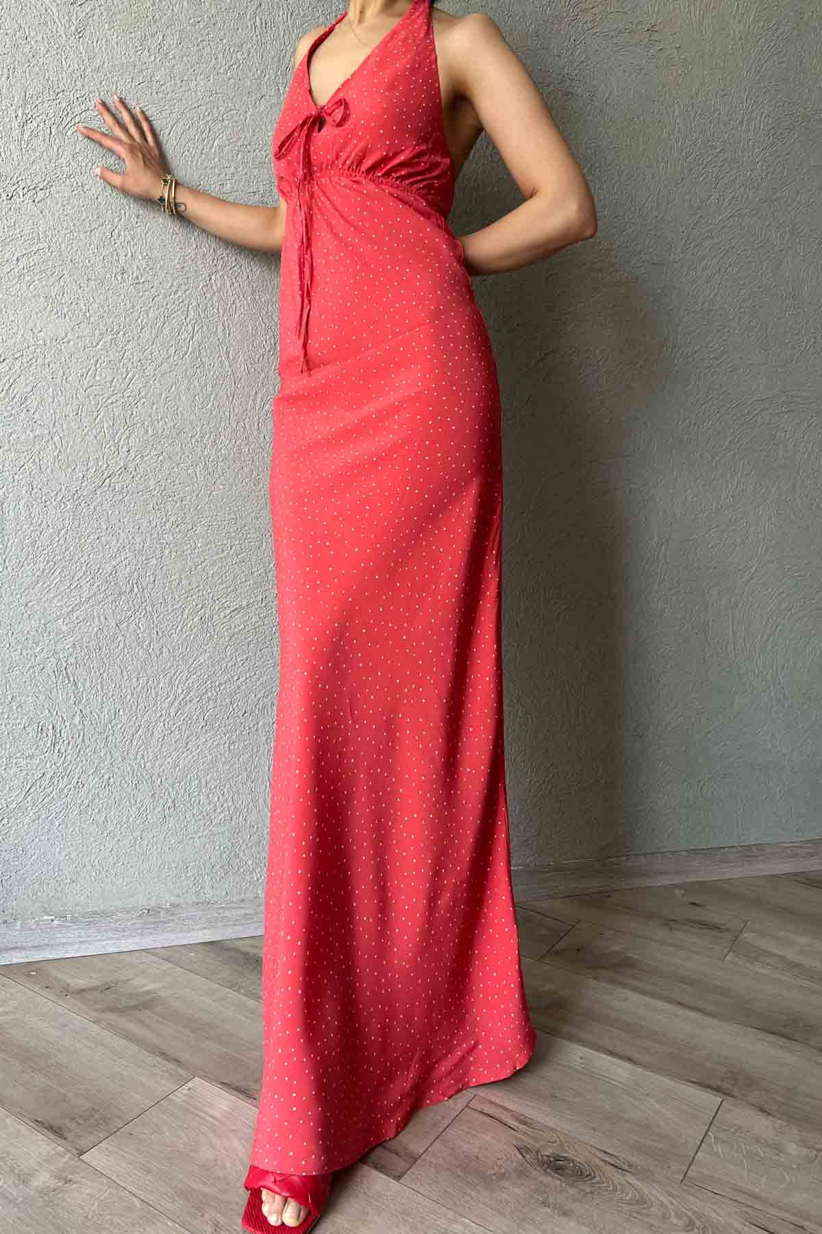 Kırmızı Puantiyeli Boyundan Bağlama Detaylı Elbise SY-2033-Kırmızı
