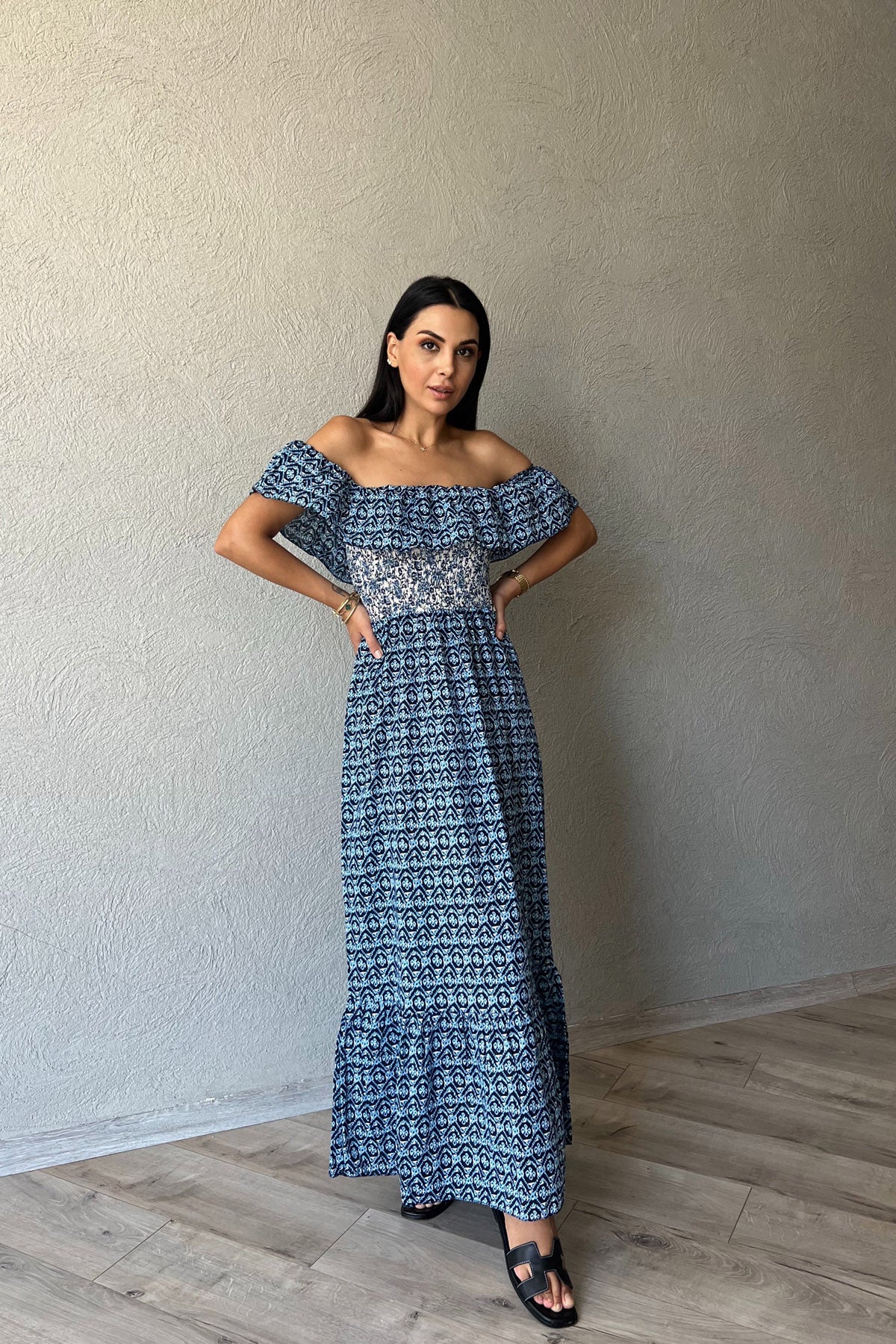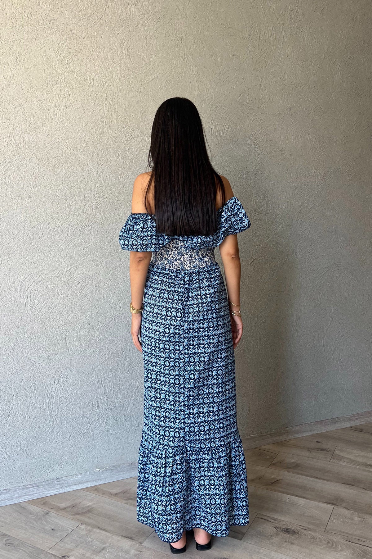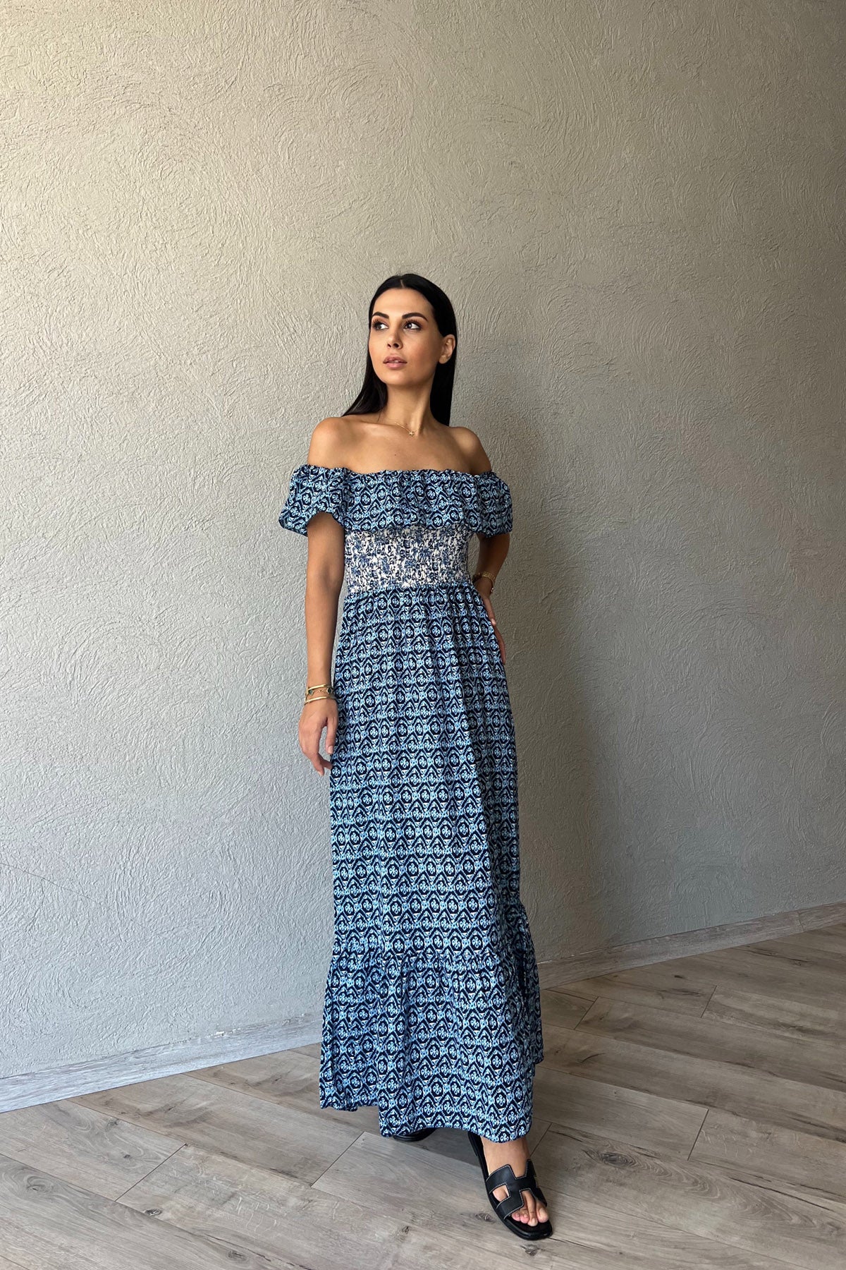 Koyu Mavi Madonna Yaka Desenli Gipeli Elbise SY-2164-Koyu Mavi