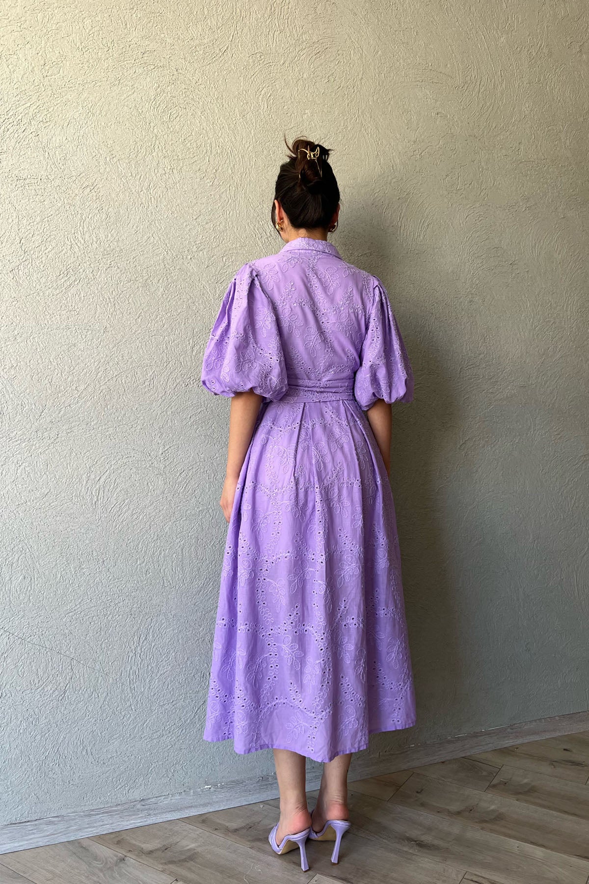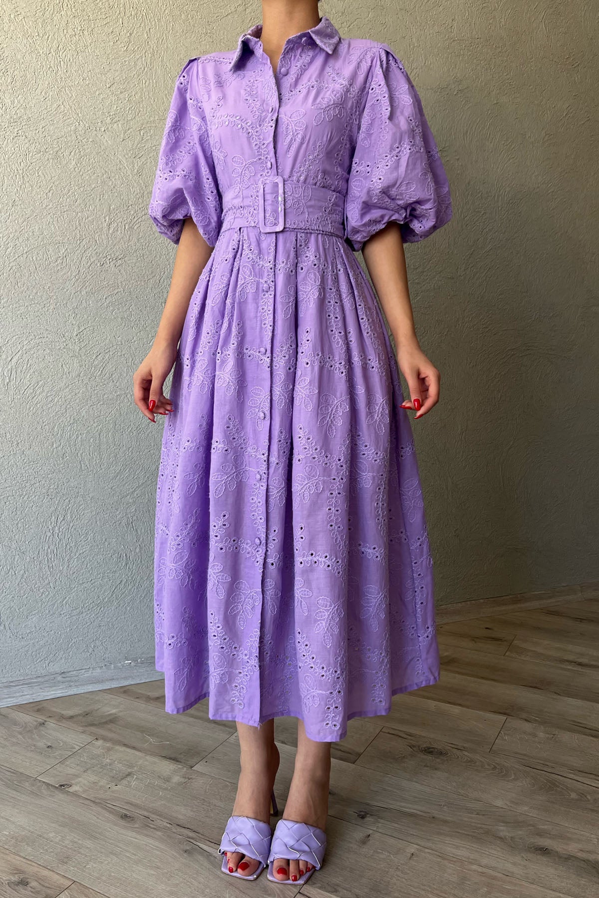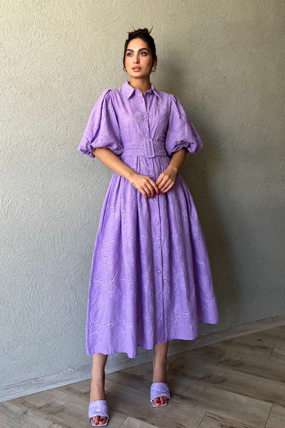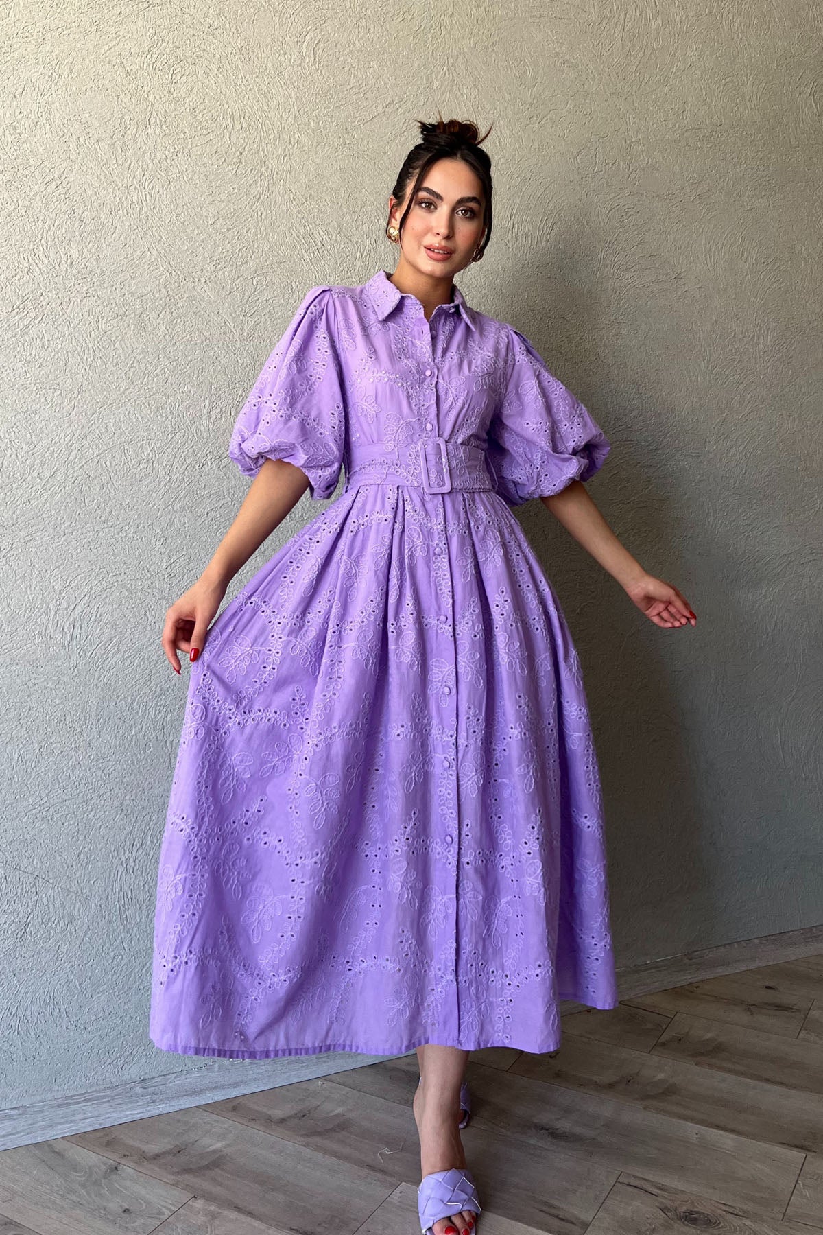 Lila Balon Kol Pile Detaylı Kemerli Brode Elbise SY-2084-Lila