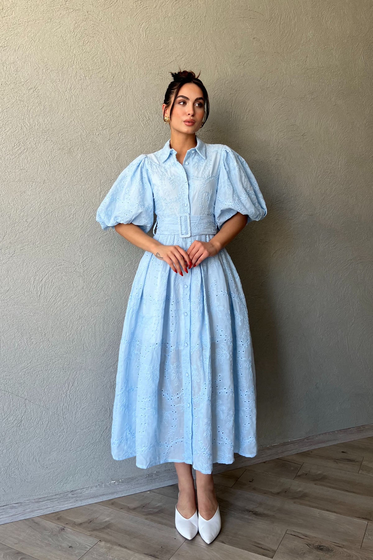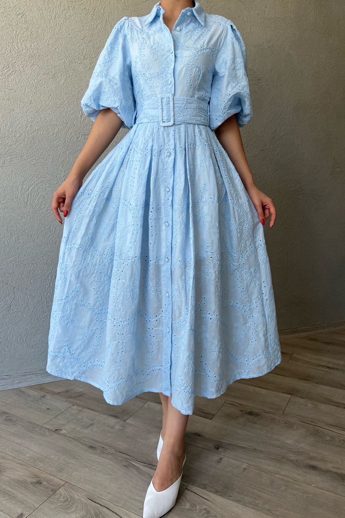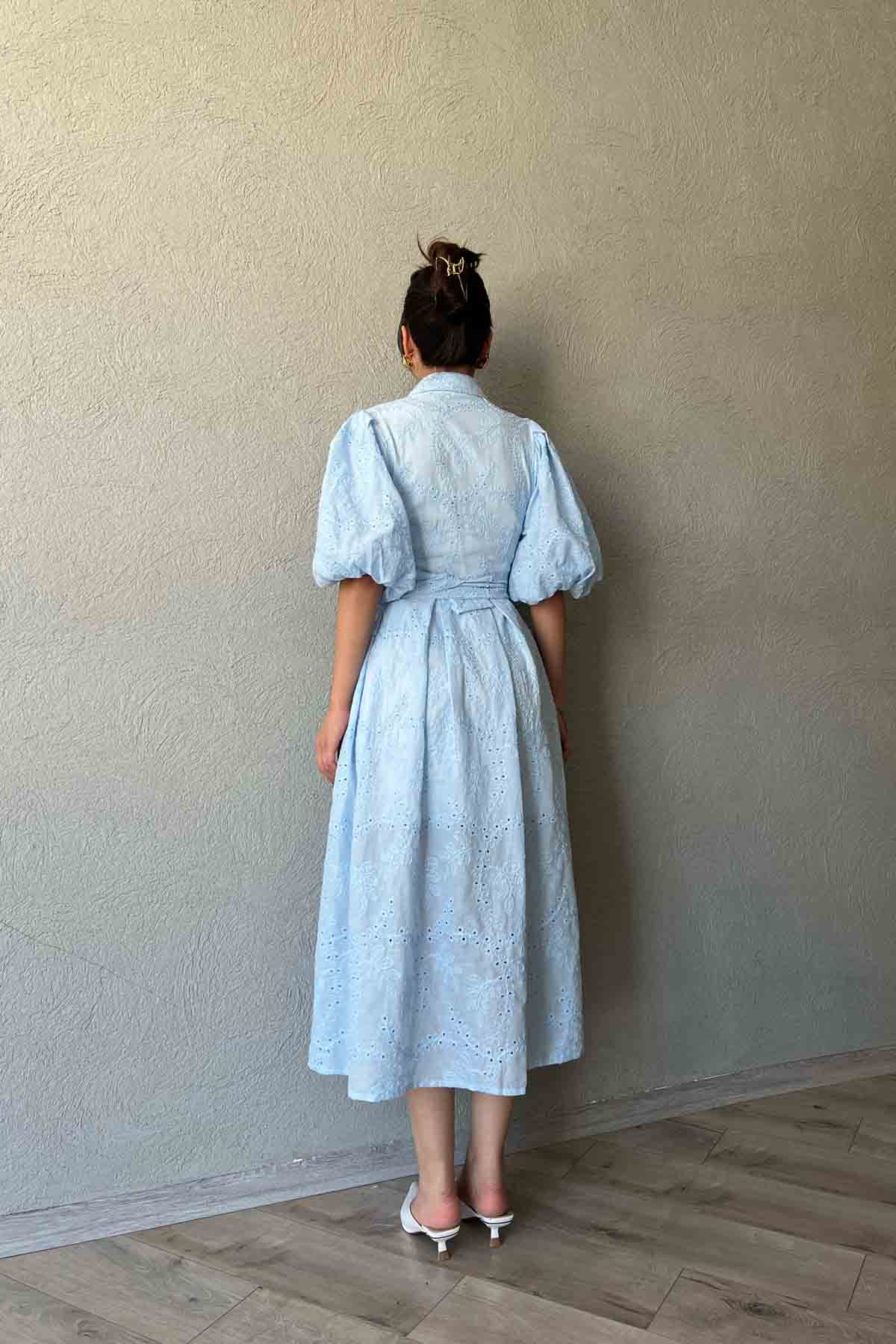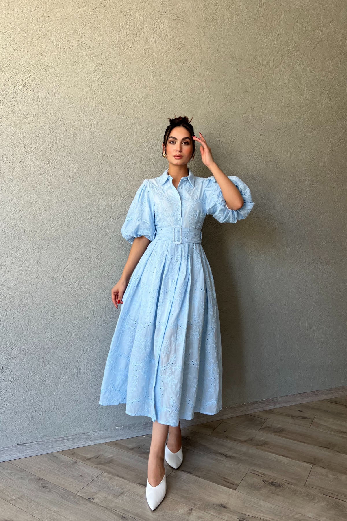 Mavi Balon Kol Pile Detaylı Kemerli Brode Elbise SY-2084-Mavi