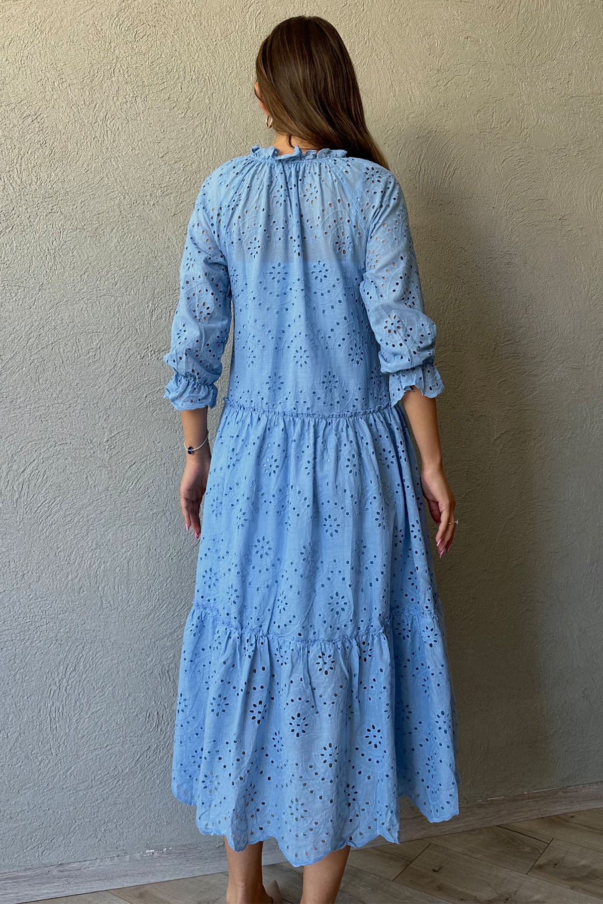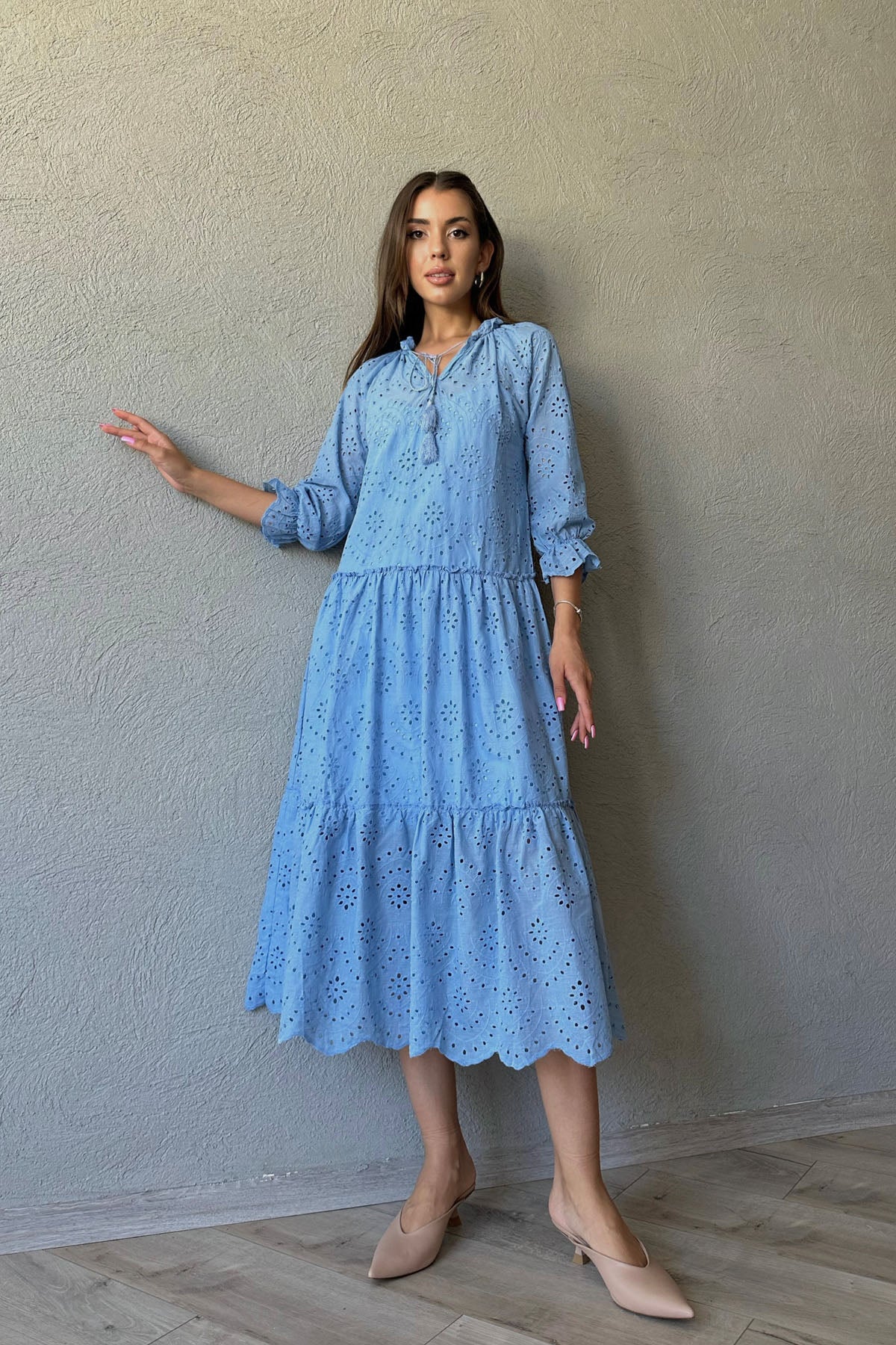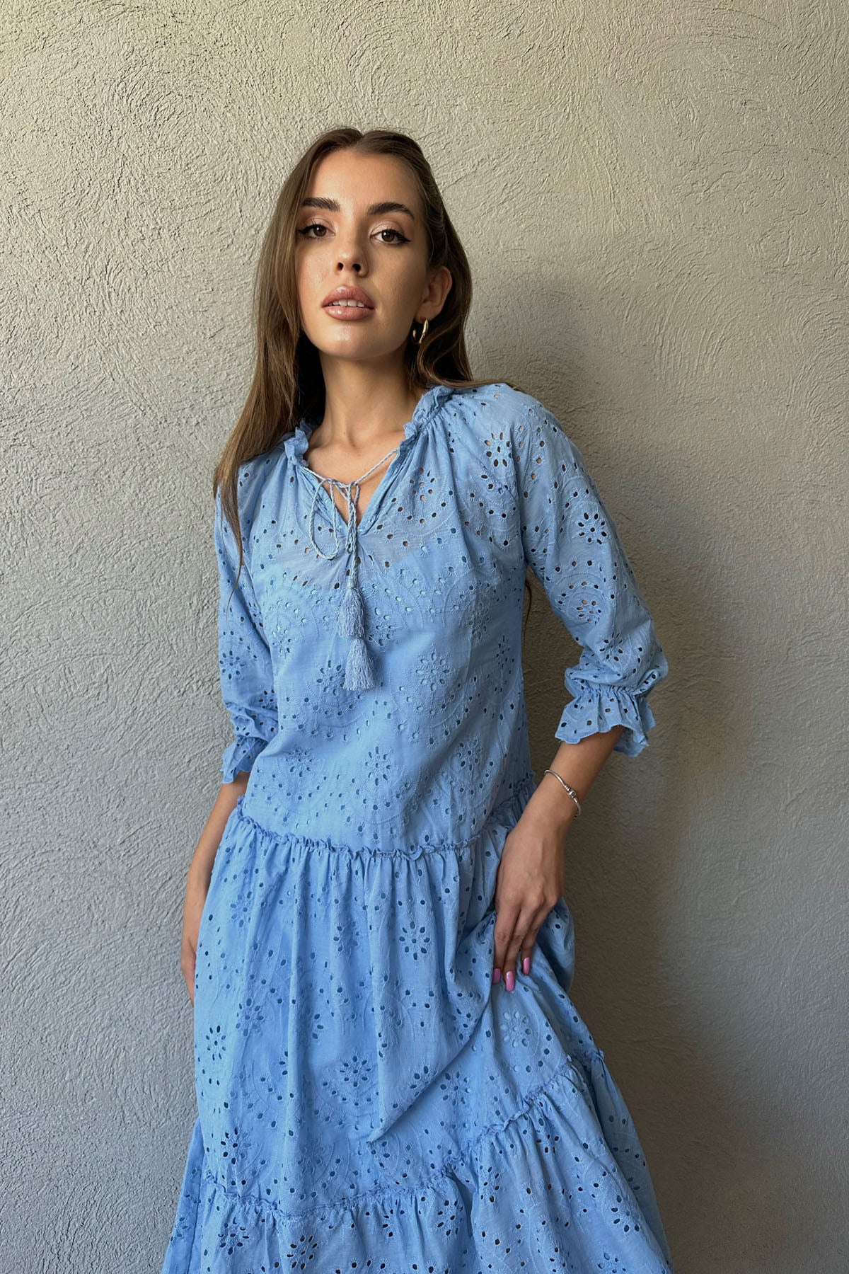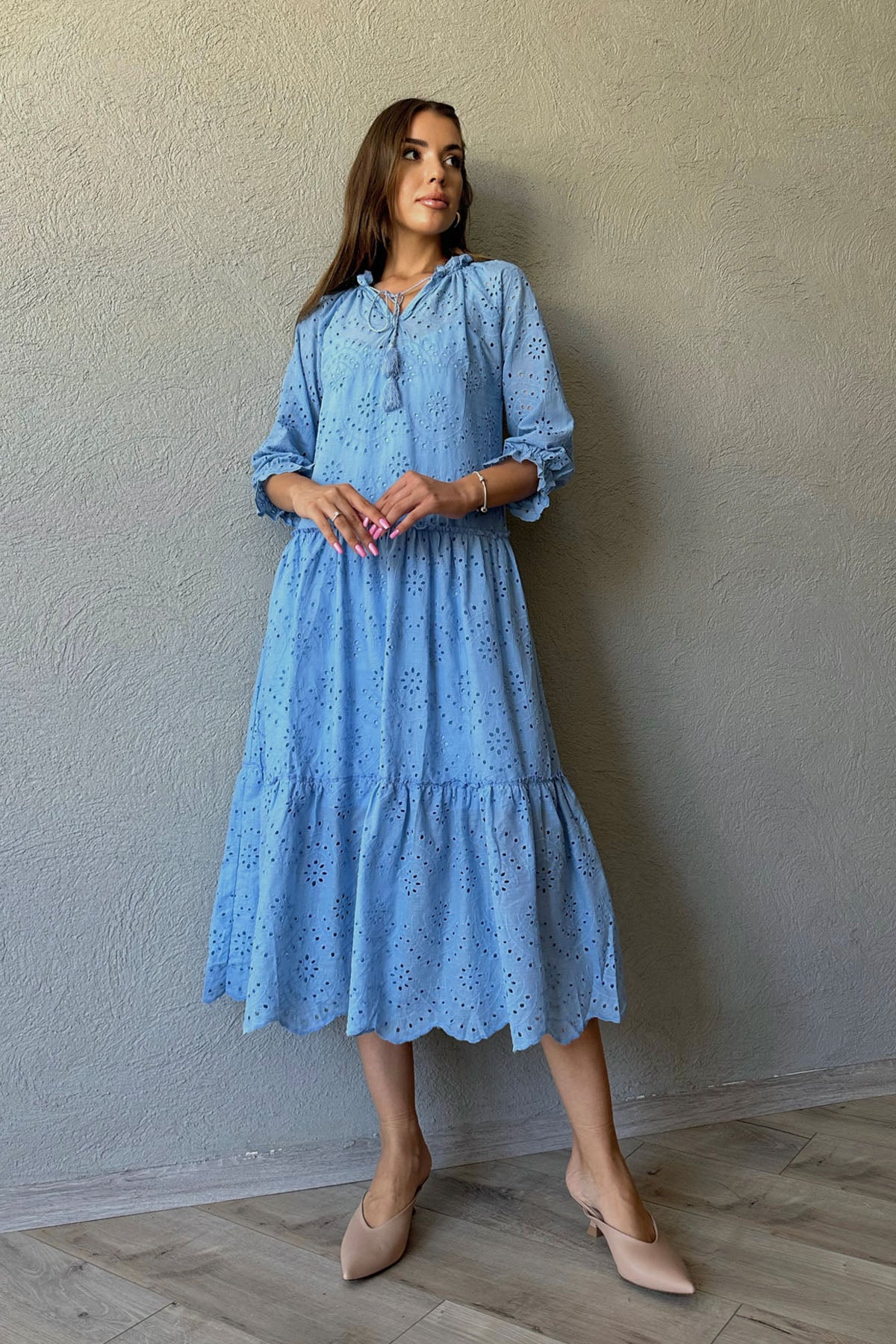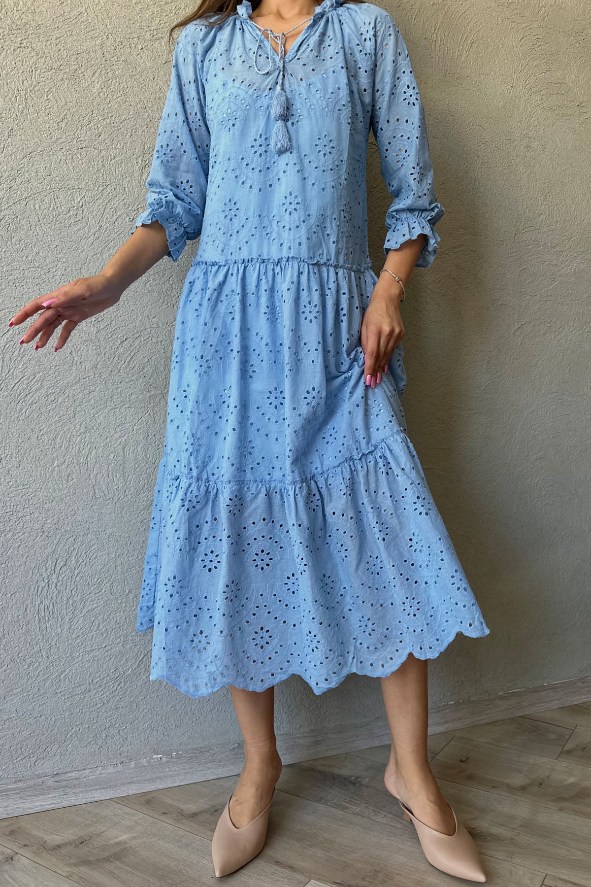 Mavi Brode Astarlı Midi Boy Elbise SY-0544-Mavi