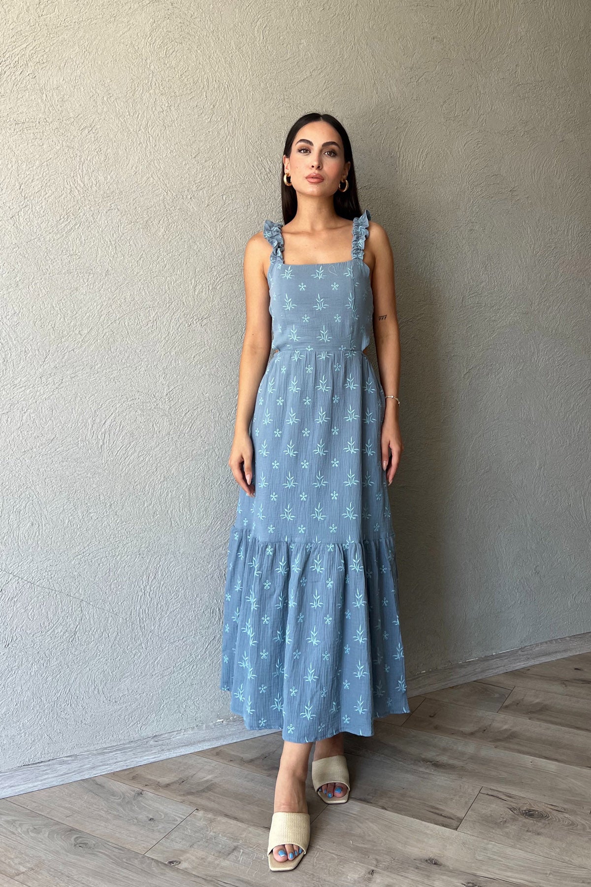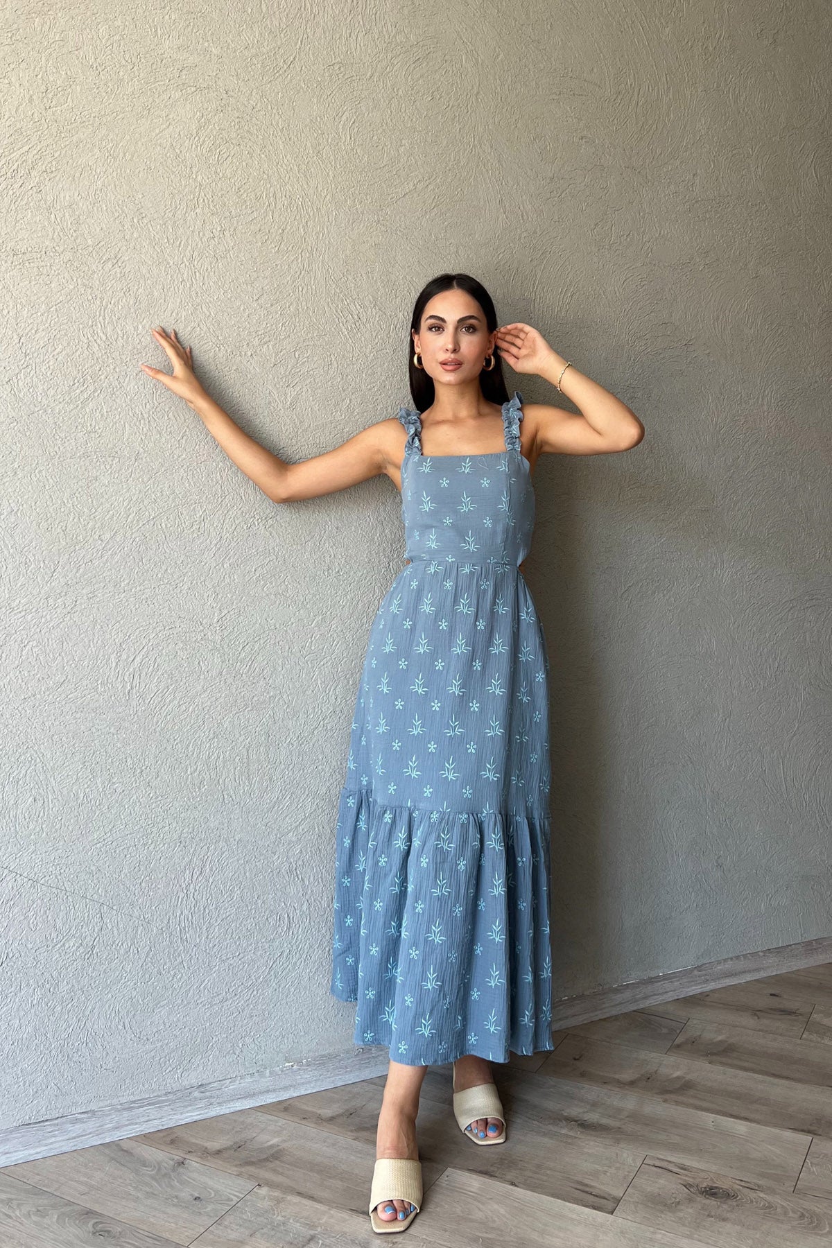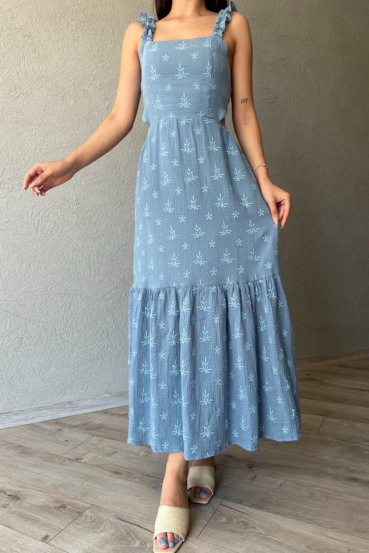 Mavi Desenli Kolu Fırfırlı Bağlamalı Elbise SY-2347-Mavi