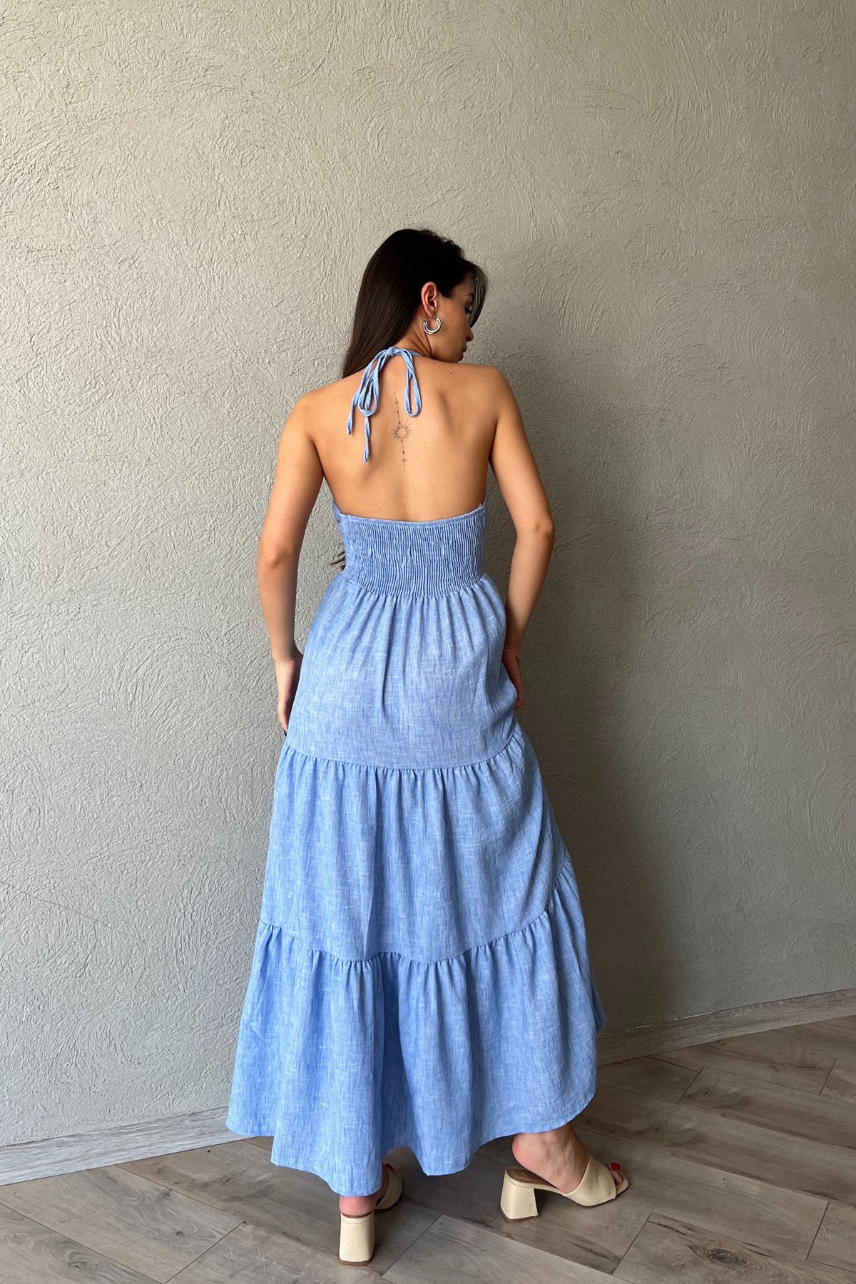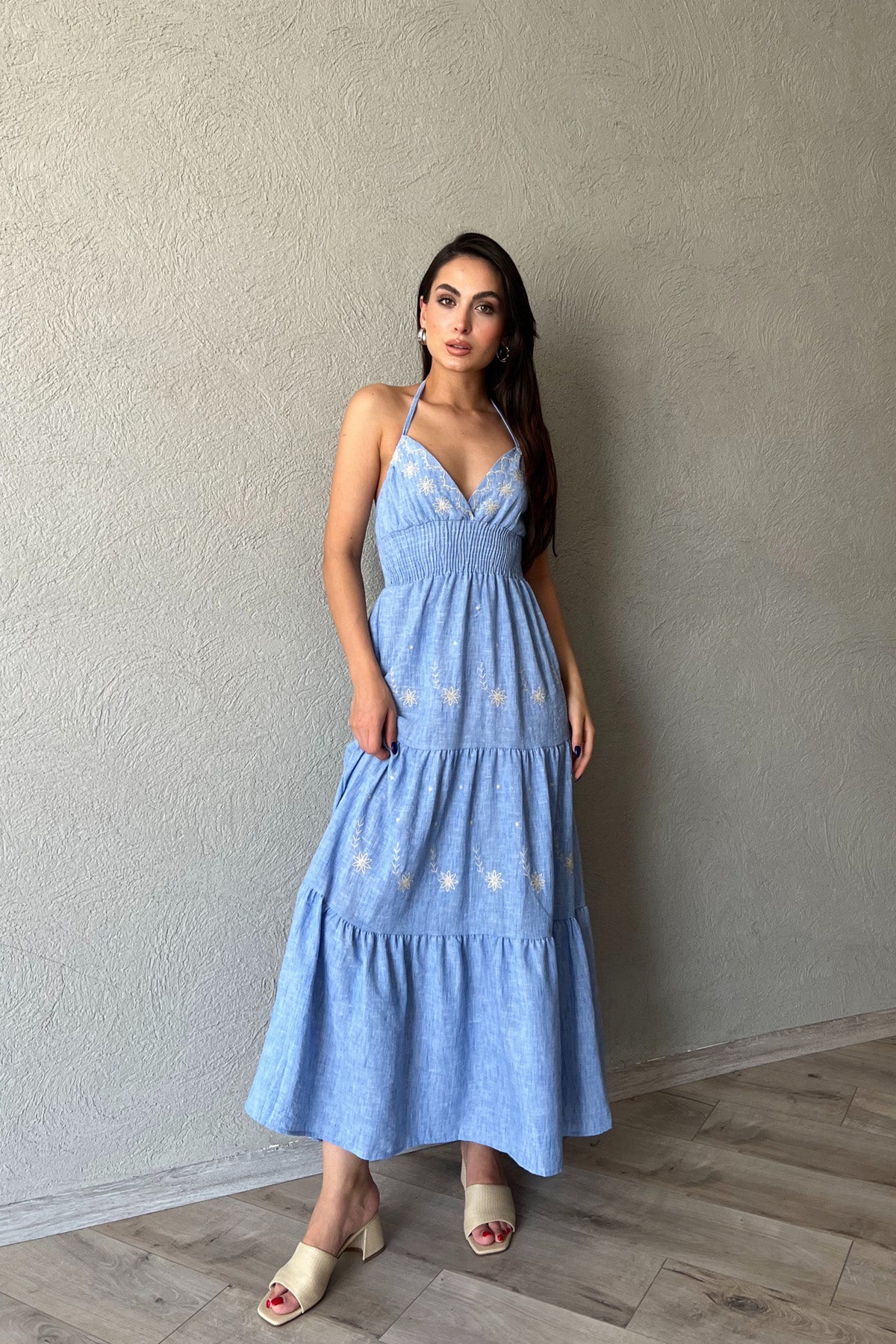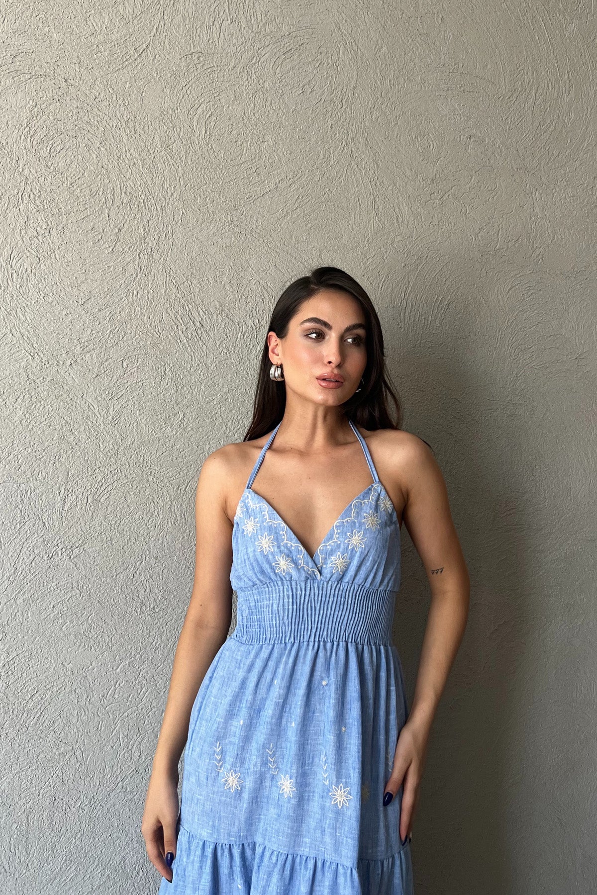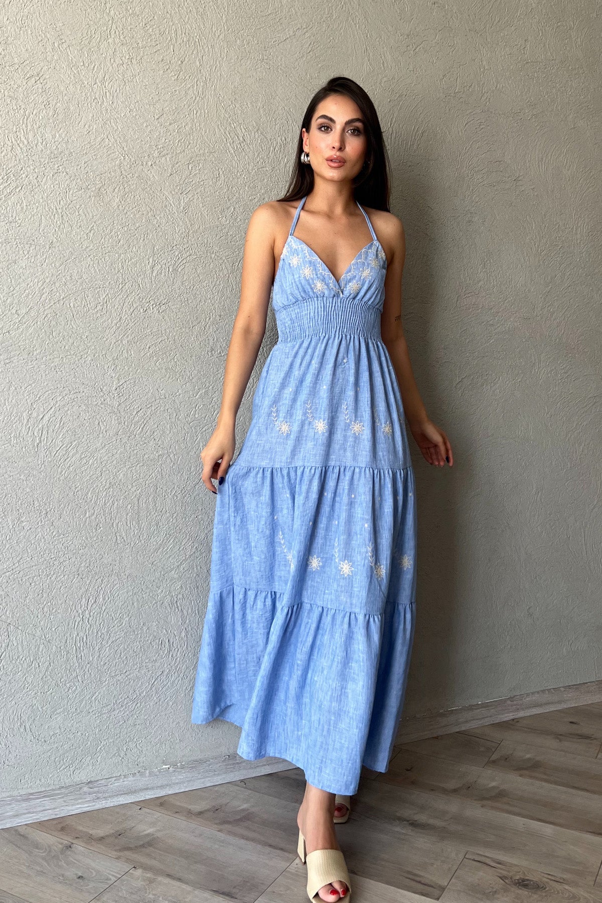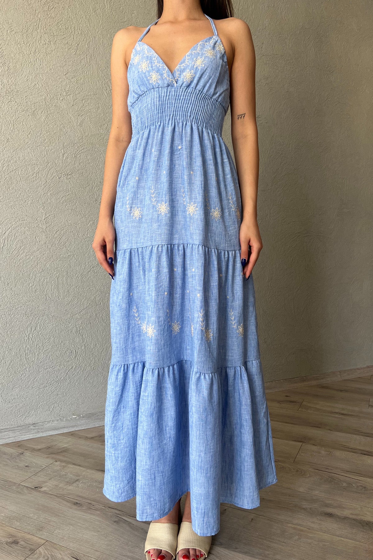 Mavi Nakış Detaylı Gipeli Boyundan Bağlamalı Uzun Elbise SY-2182-Mavi