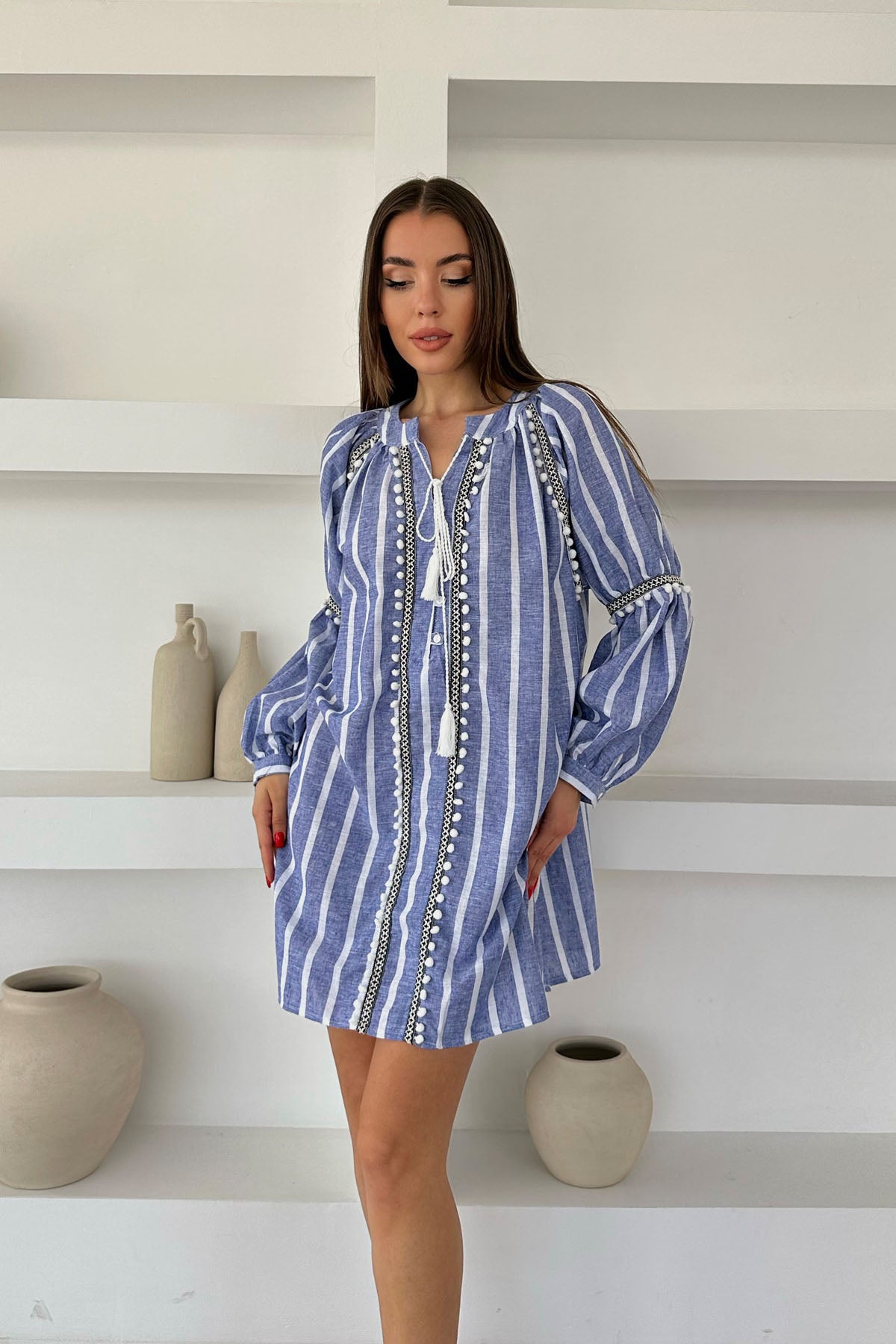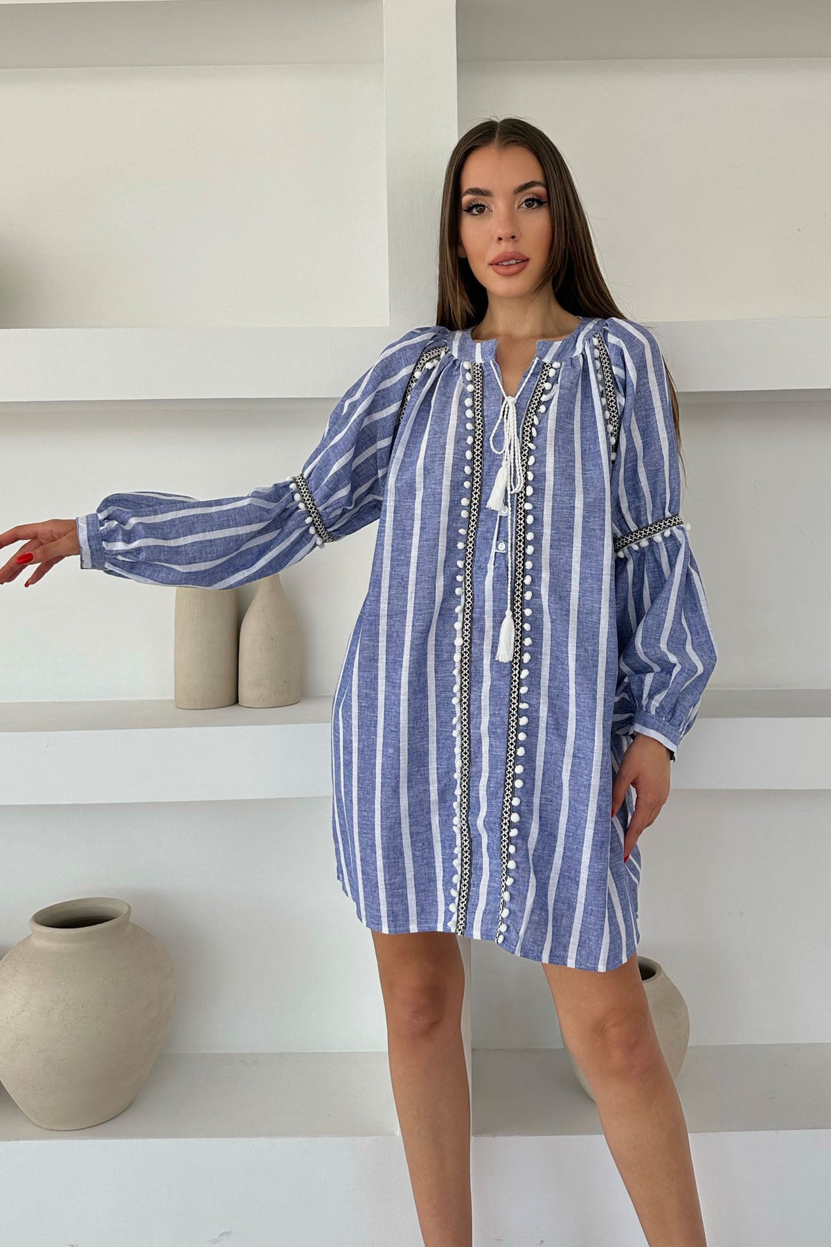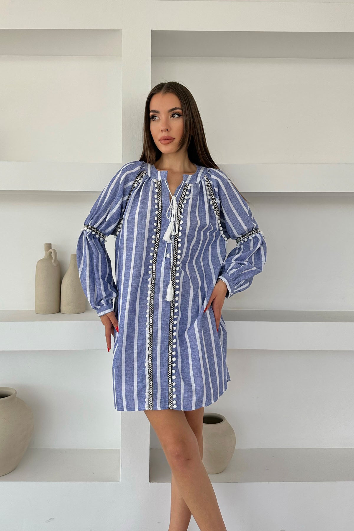 Mavi Püsküllü Çizgili Keten Elbise SY-0485-Mavi