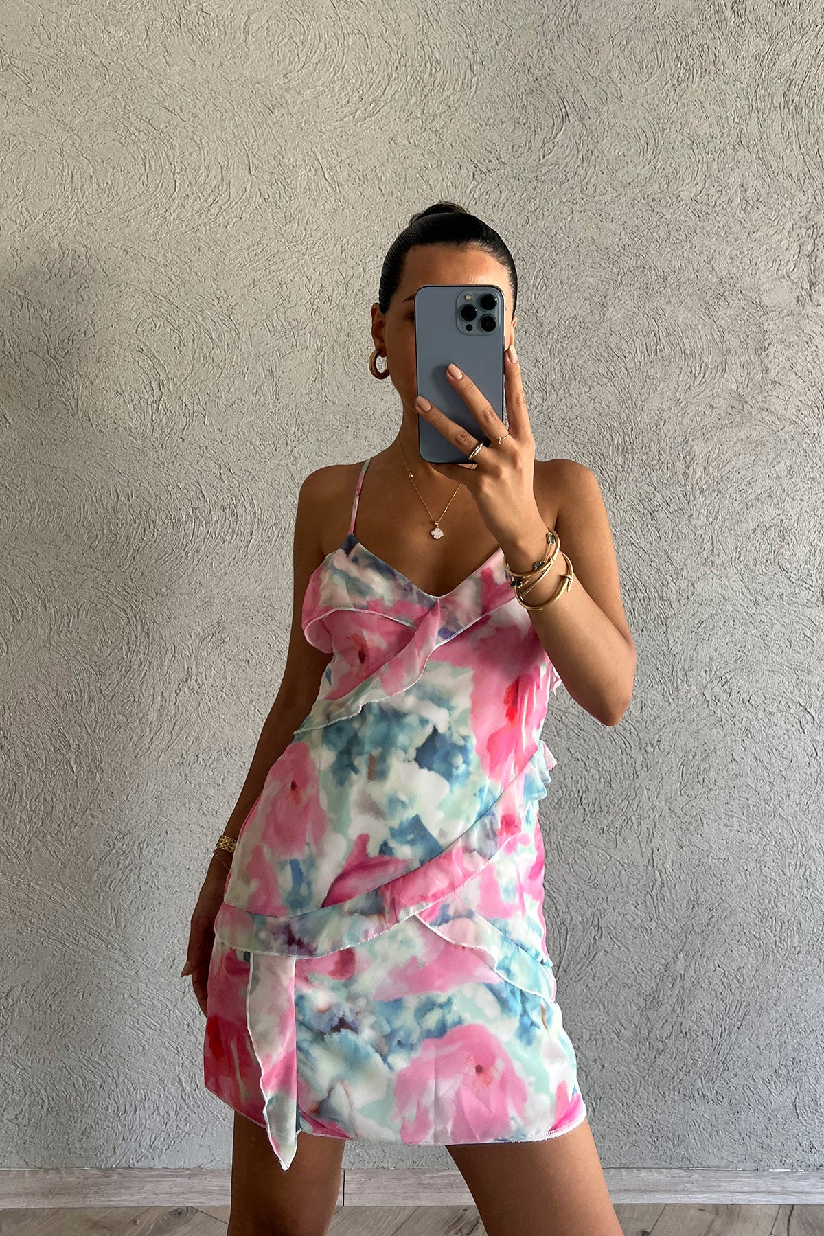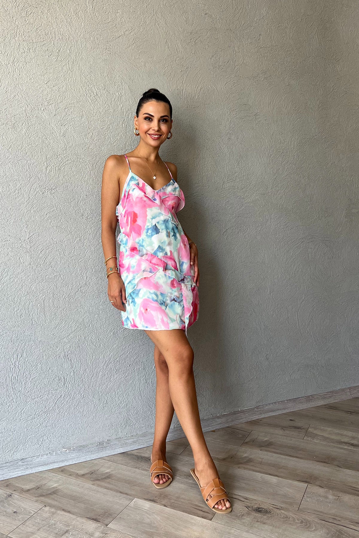 Ürün Detayları ;Pembe Çapraz Askılı  Fırfır Detaylı Mini Elbise