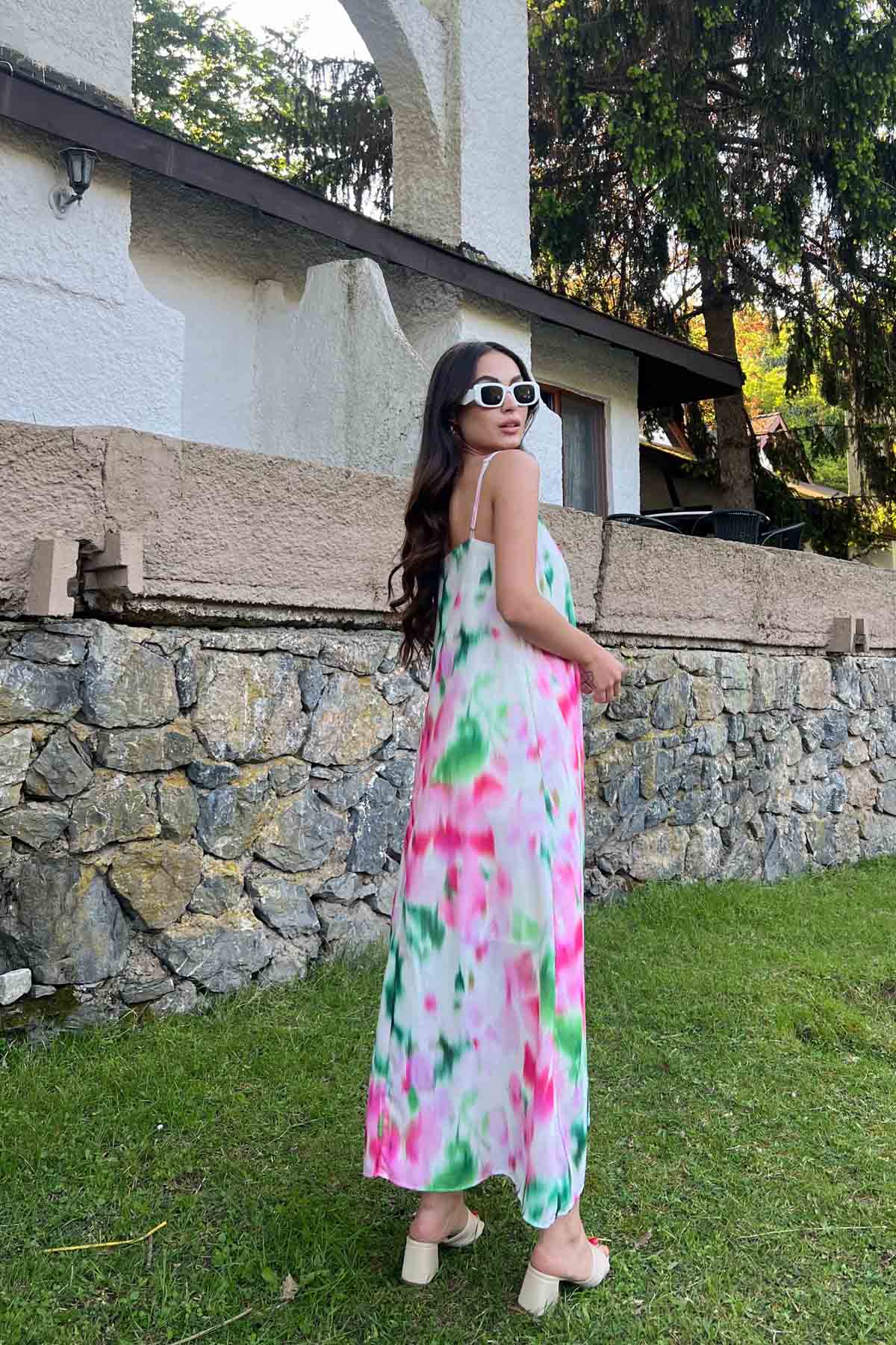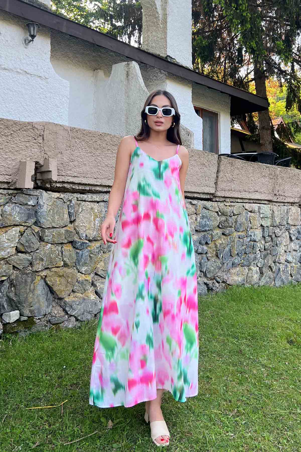 Ürün Detayları ;Çok Renkli Desenli İp Askılı Keten Elbise