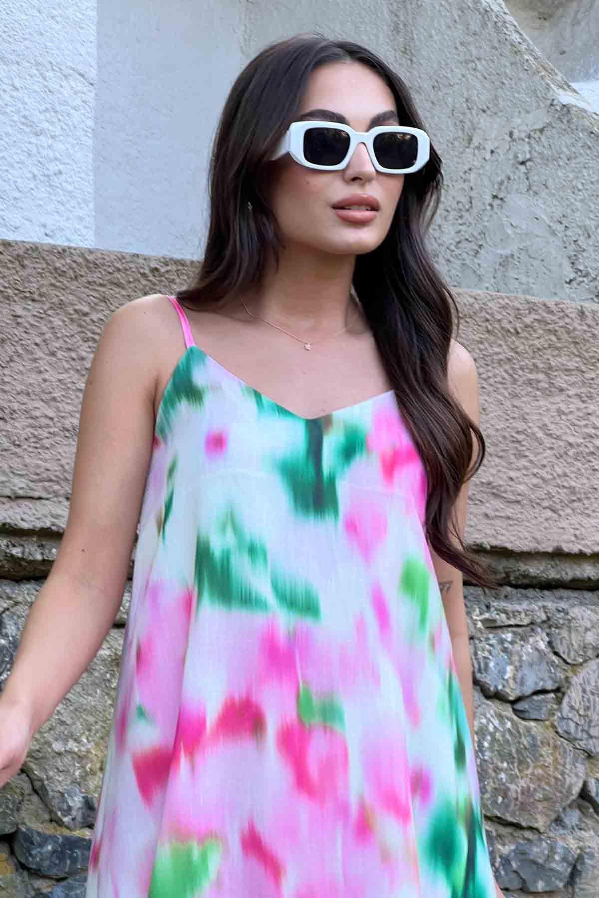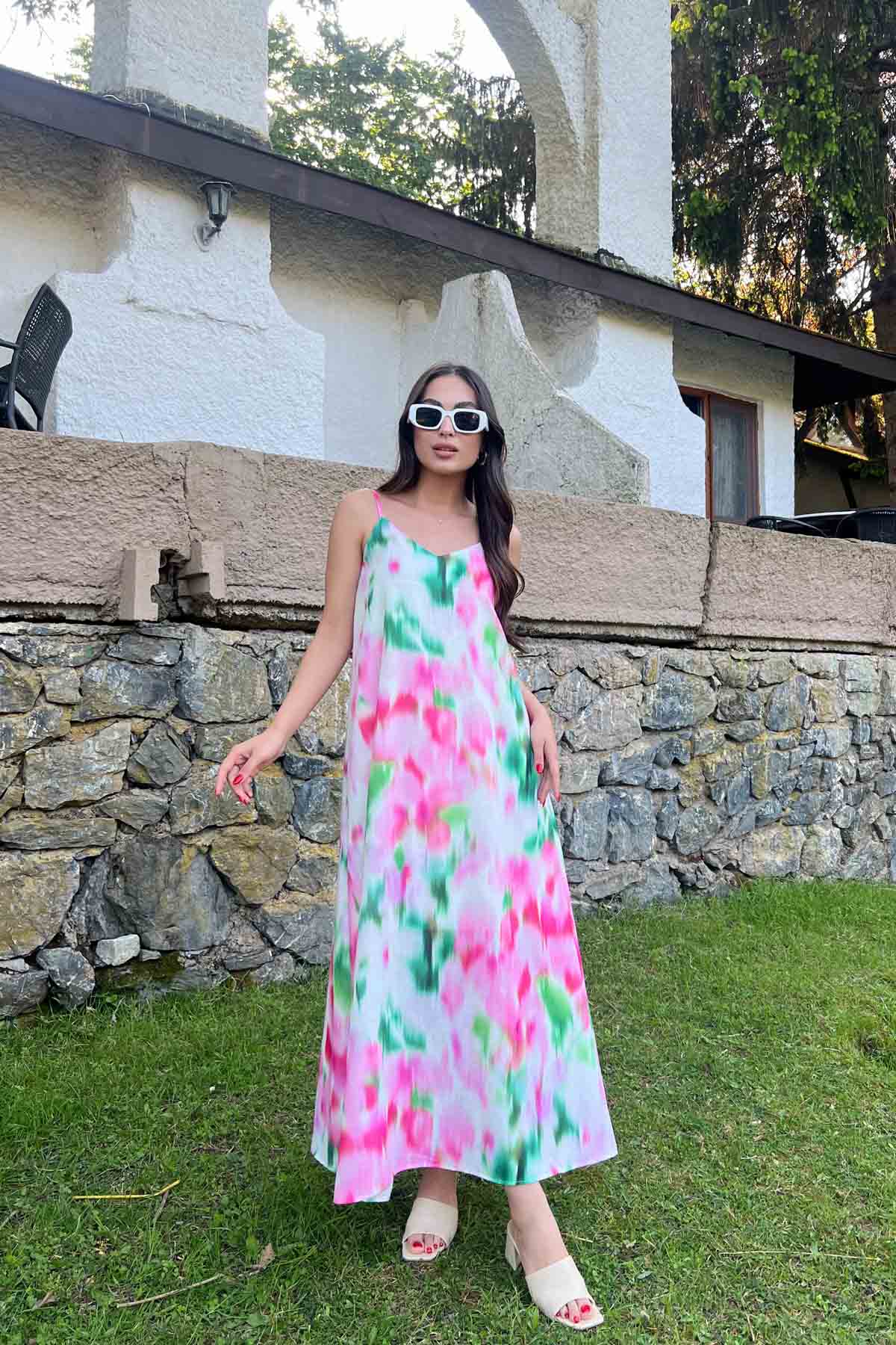 Pembe Çok Renkli Desenli İp Askılı Keten Elbise SY-2020-Pembe