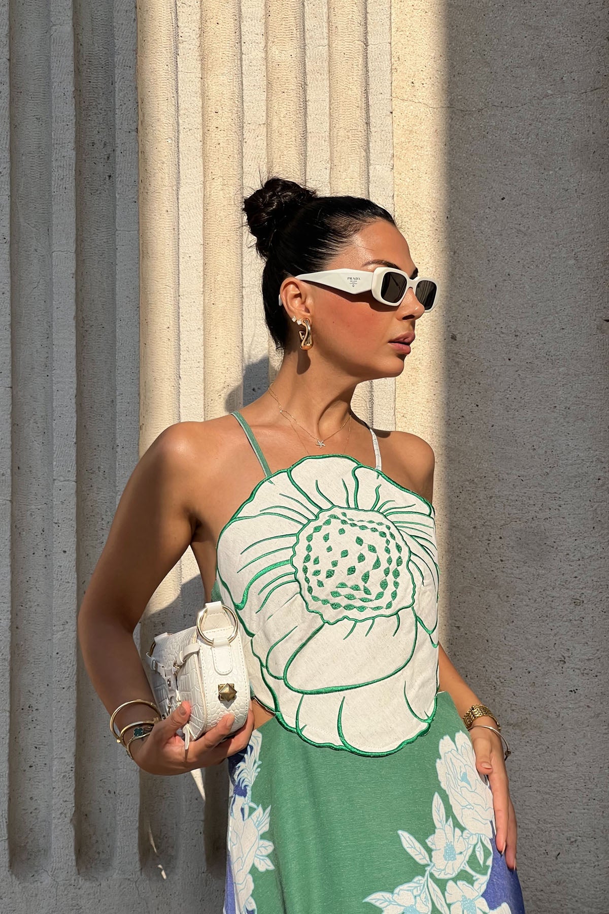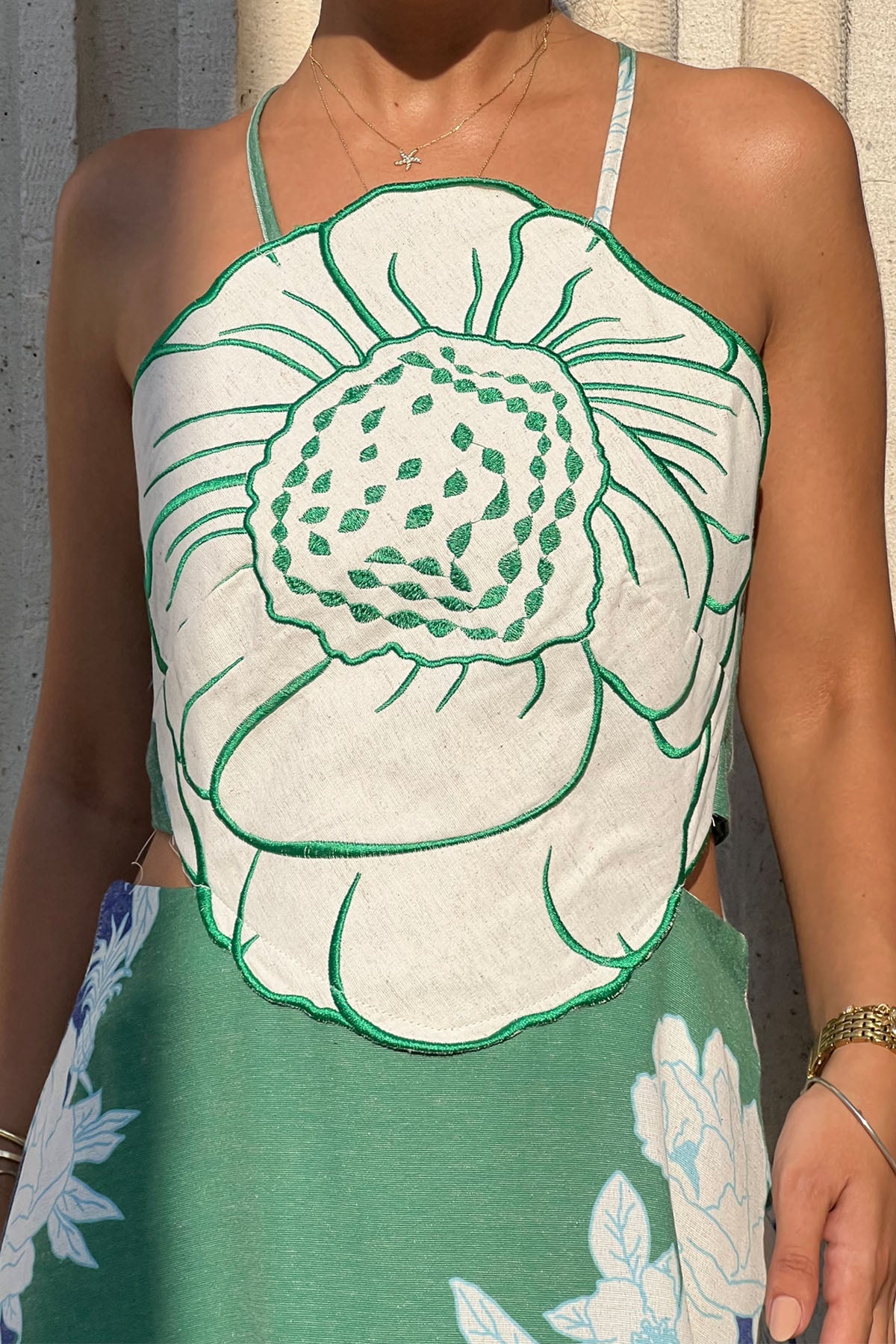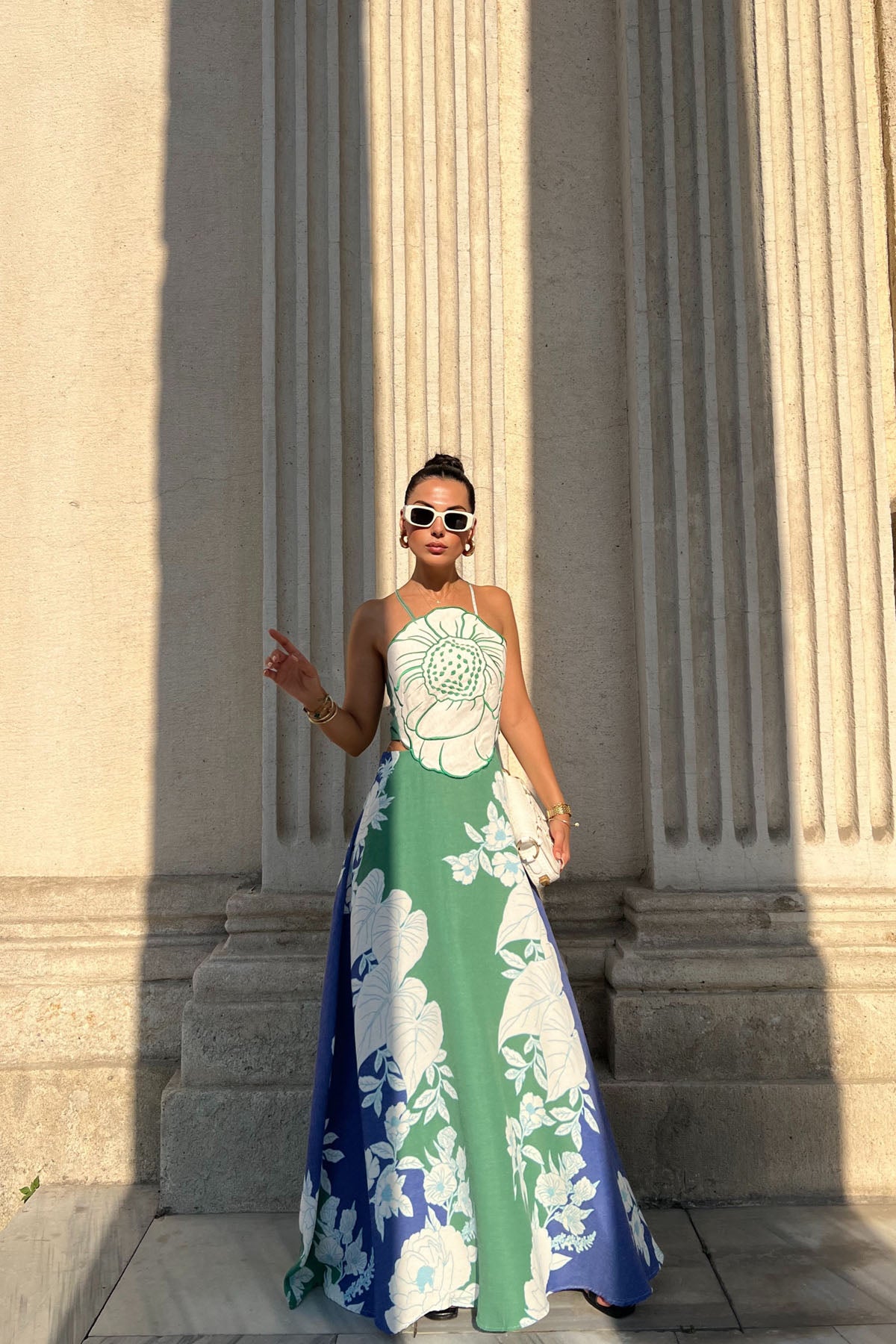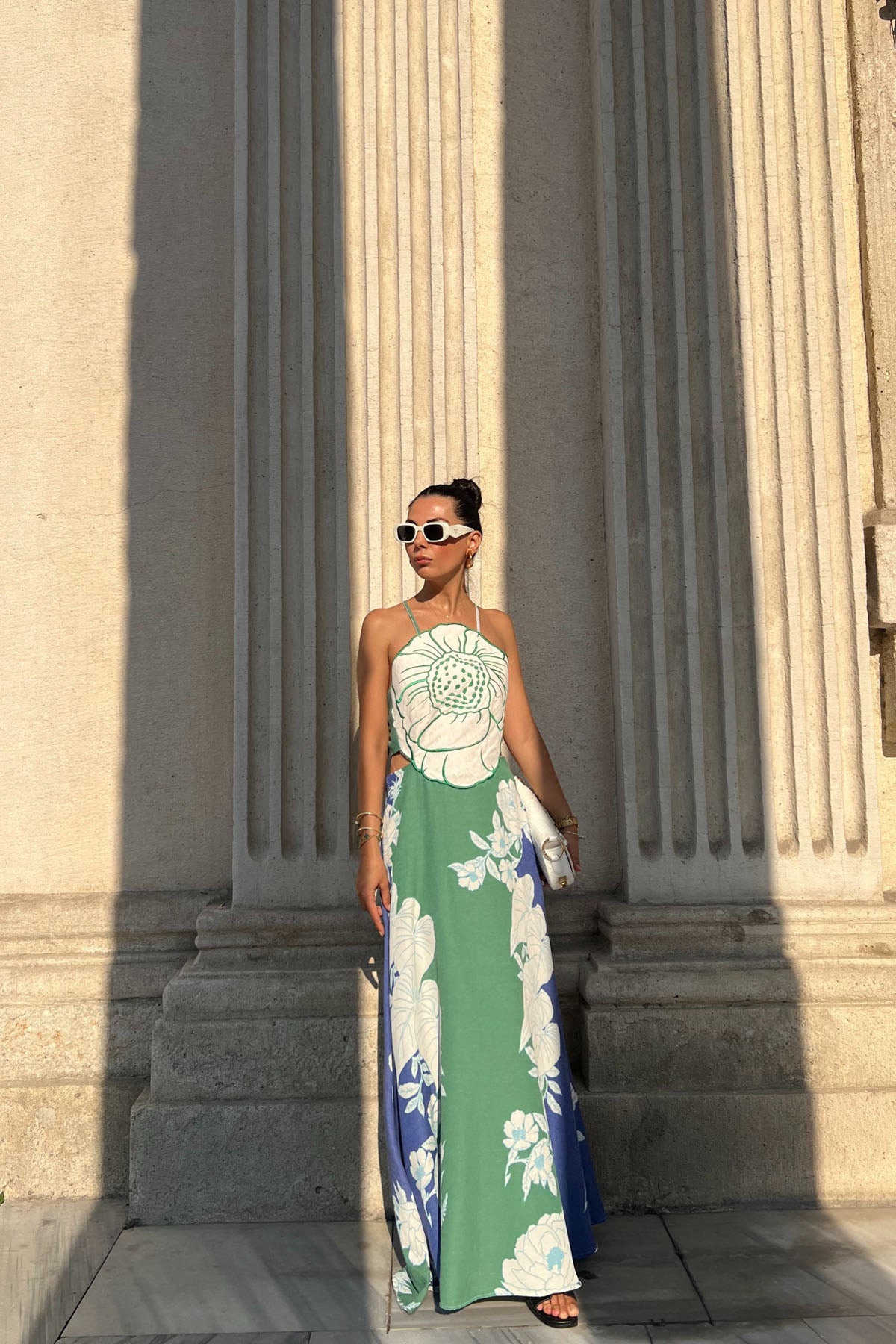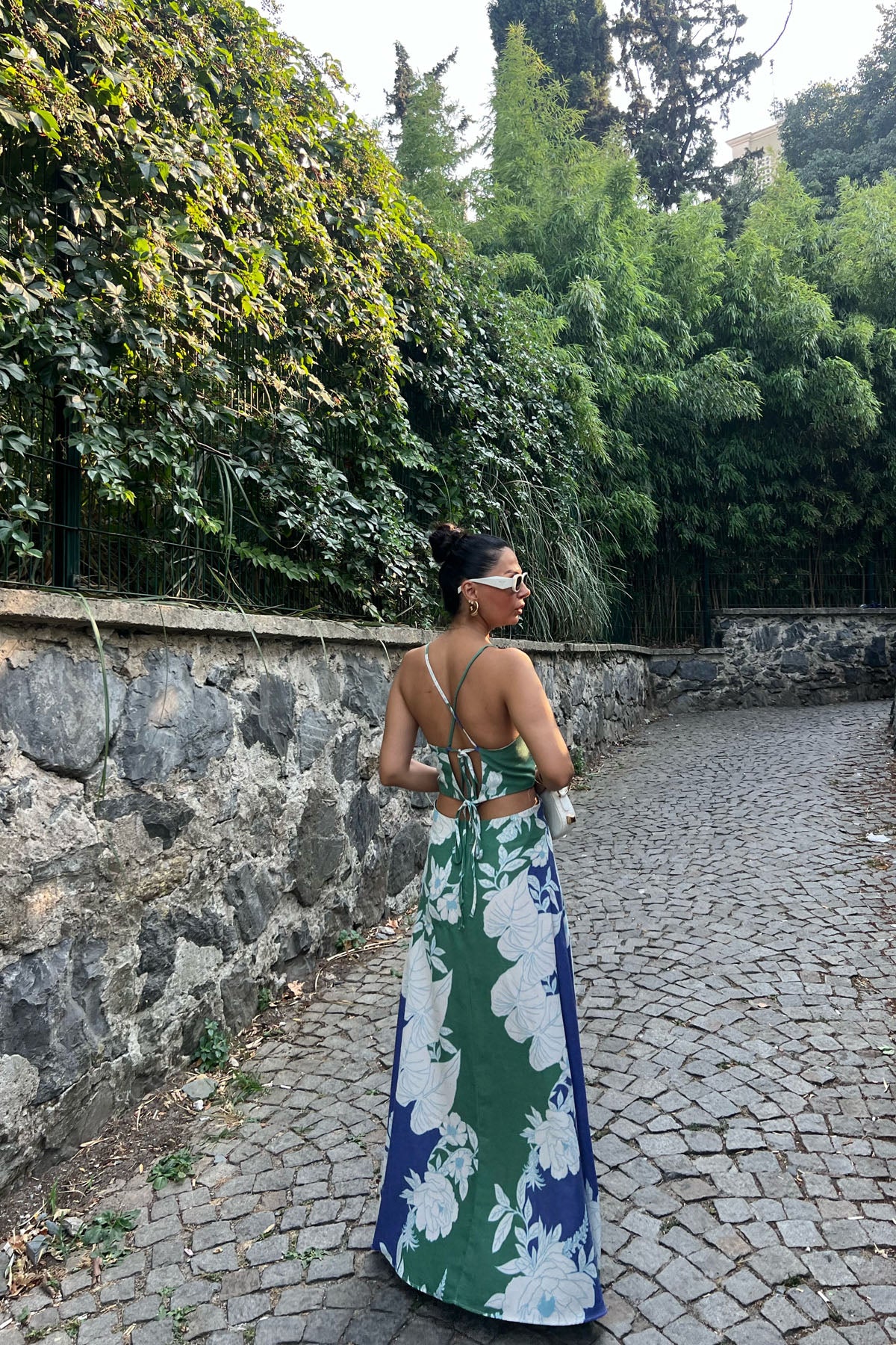 Ürün Detayları ; Pencere detaylı ve sırt detaylı bağlamalı çiçek desenli keten elbise.
