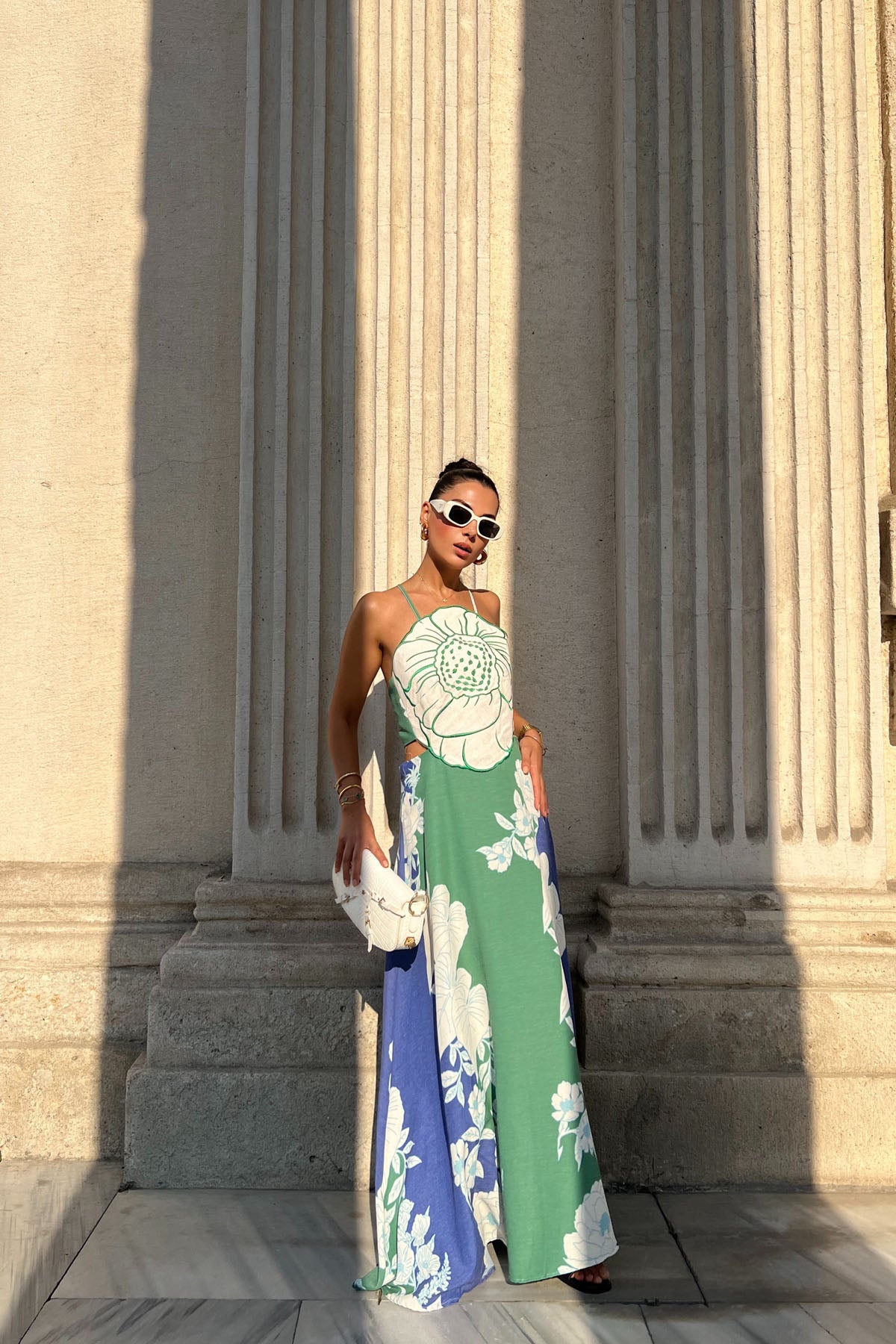 Renkli Positano Sırt Bağlamalı ve Çiçek Desenli Keten Elbise SY-2320-Renkli