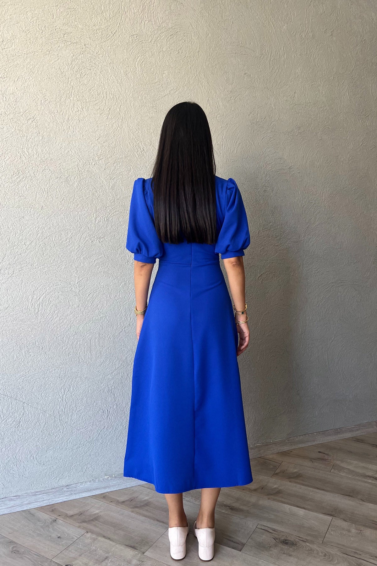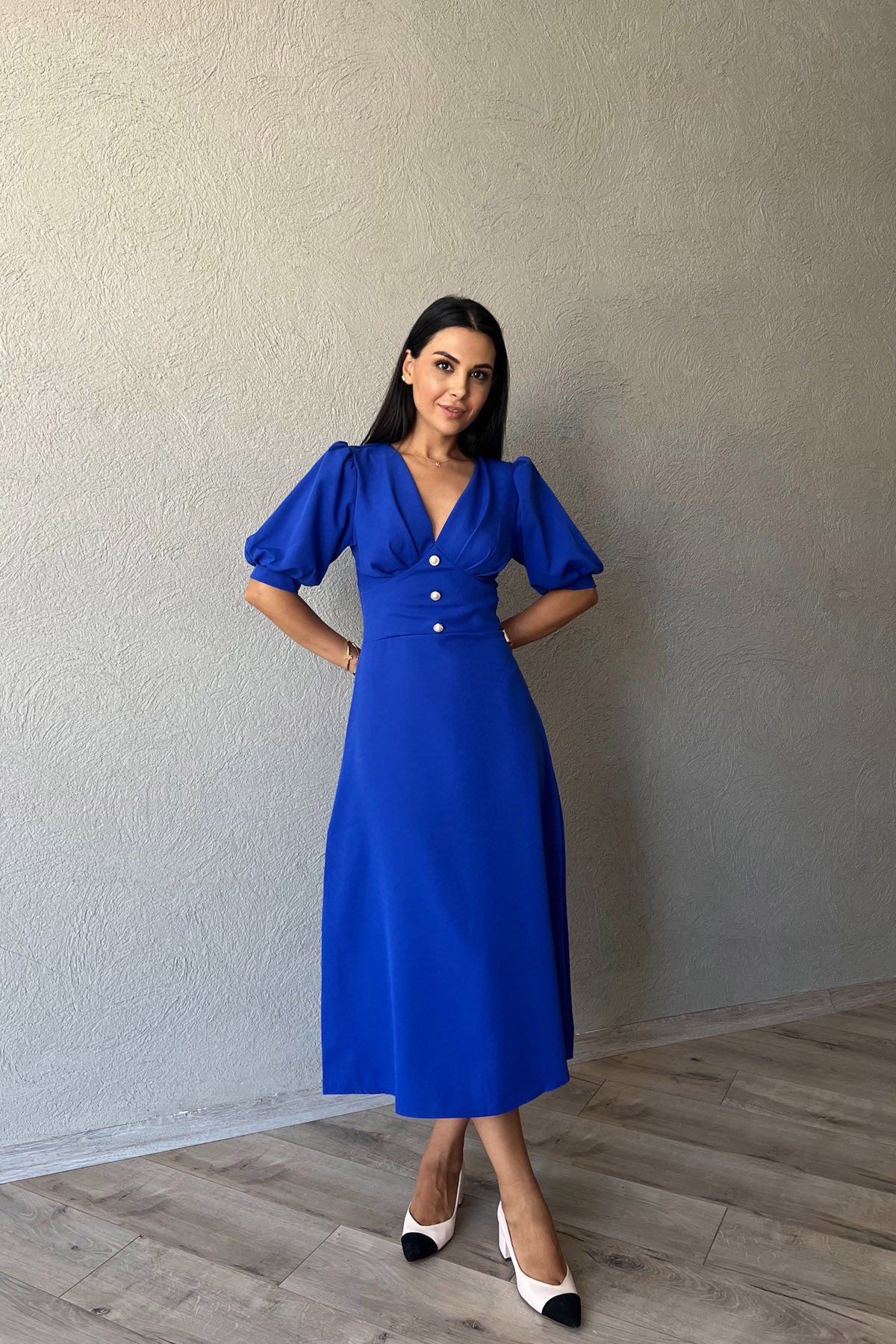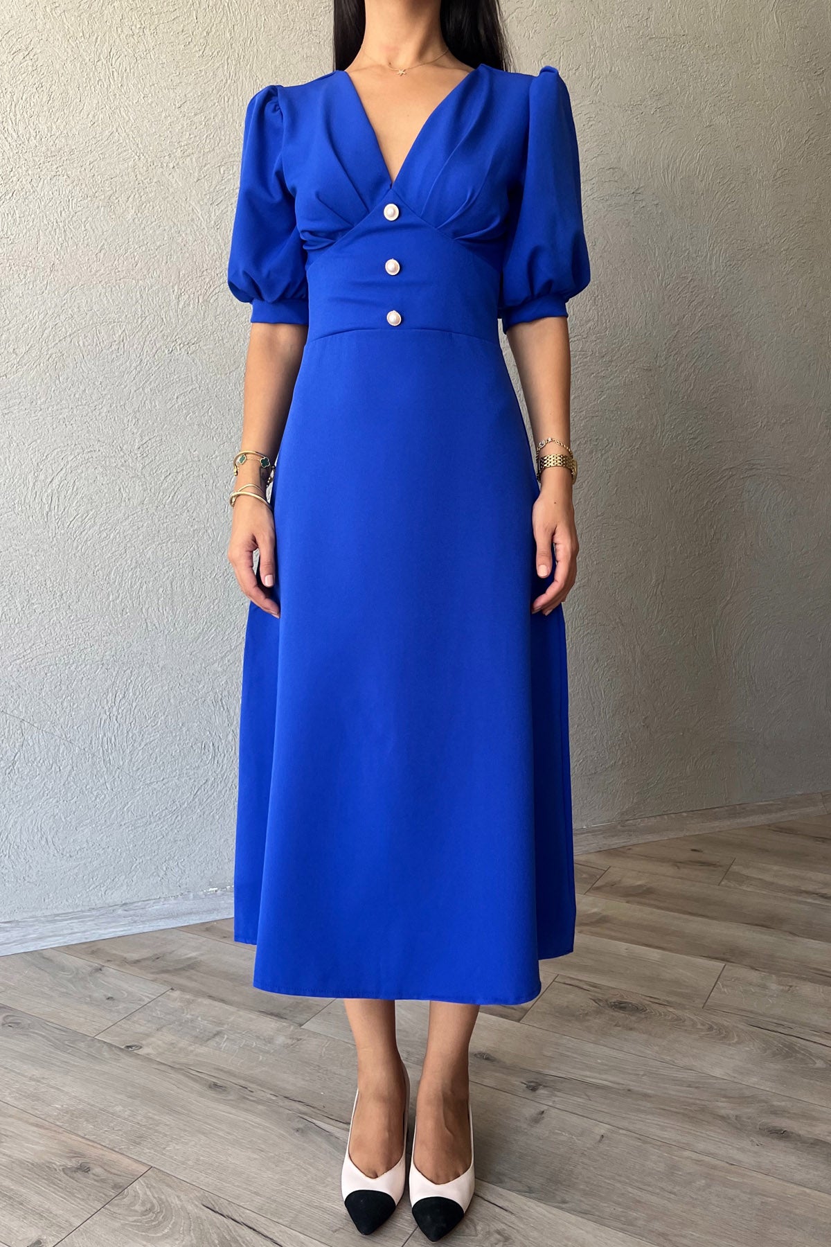 Saks Mavisi İnci Düğme Detay Elbise SY-0351-Saks Mavi