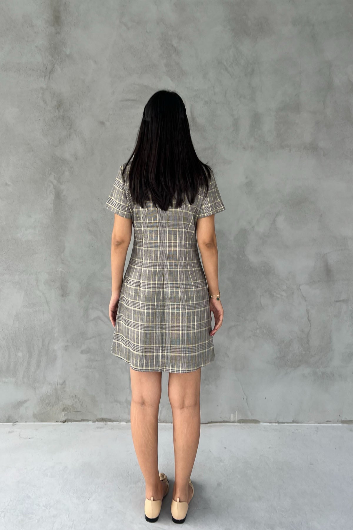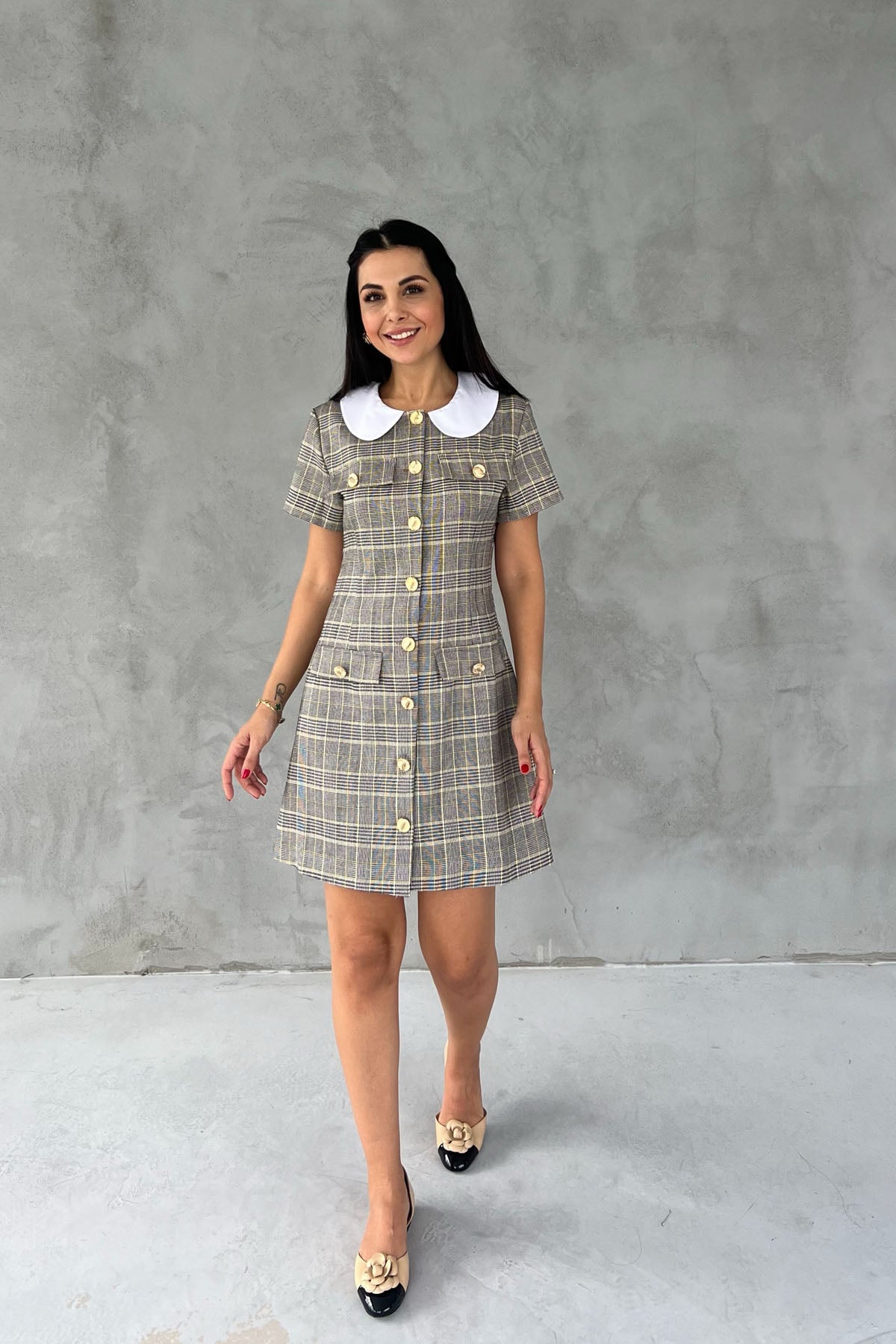 Ürün Detayları ;Ekoseli,gold düğmeli,sahte cep detaylı,bebe yaka elbise.