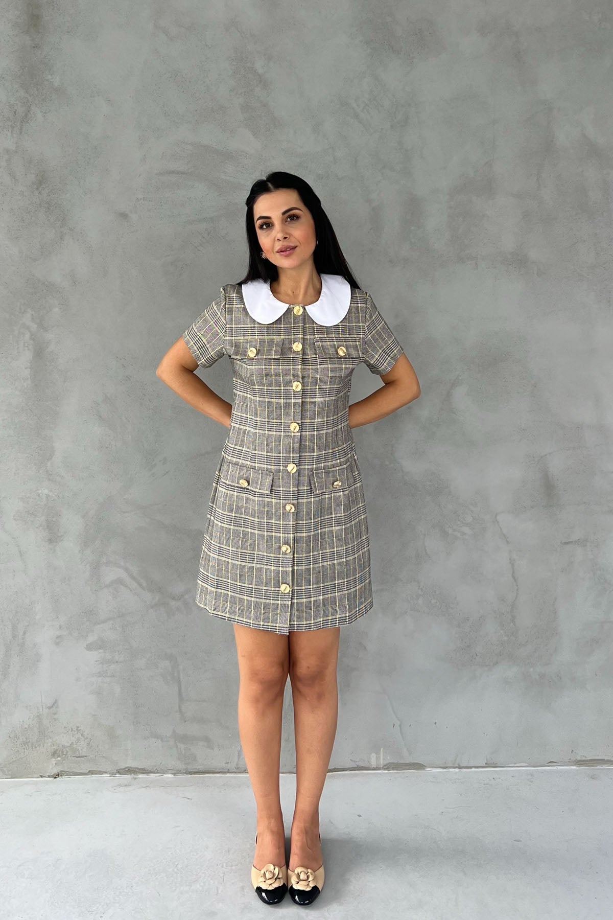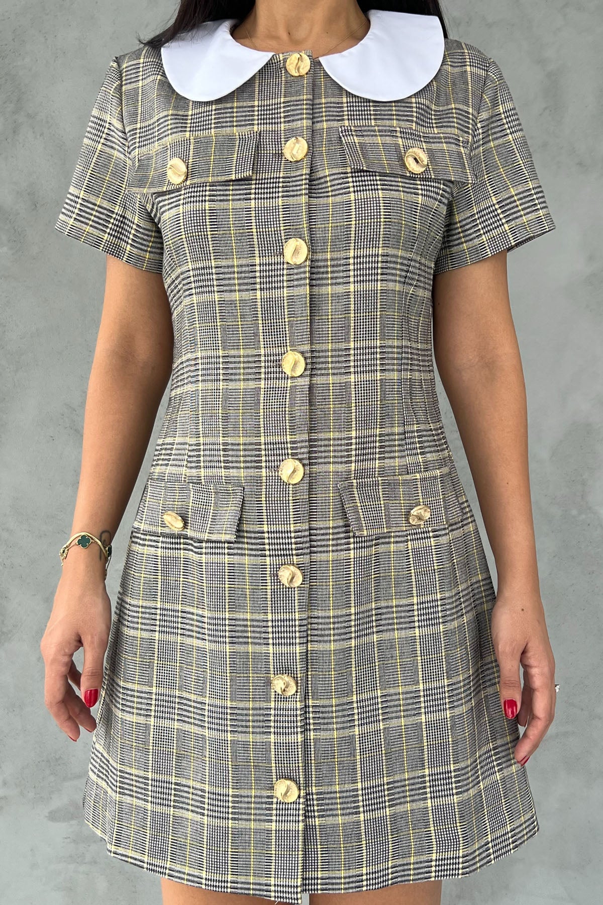 Sarı Ekoseli Bebe Yaka Gold Düğmeli Elbise SY-2544-Sarı