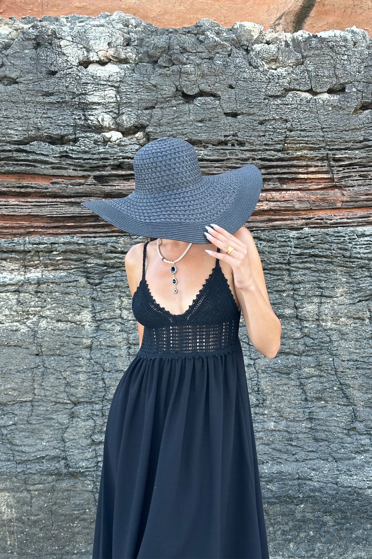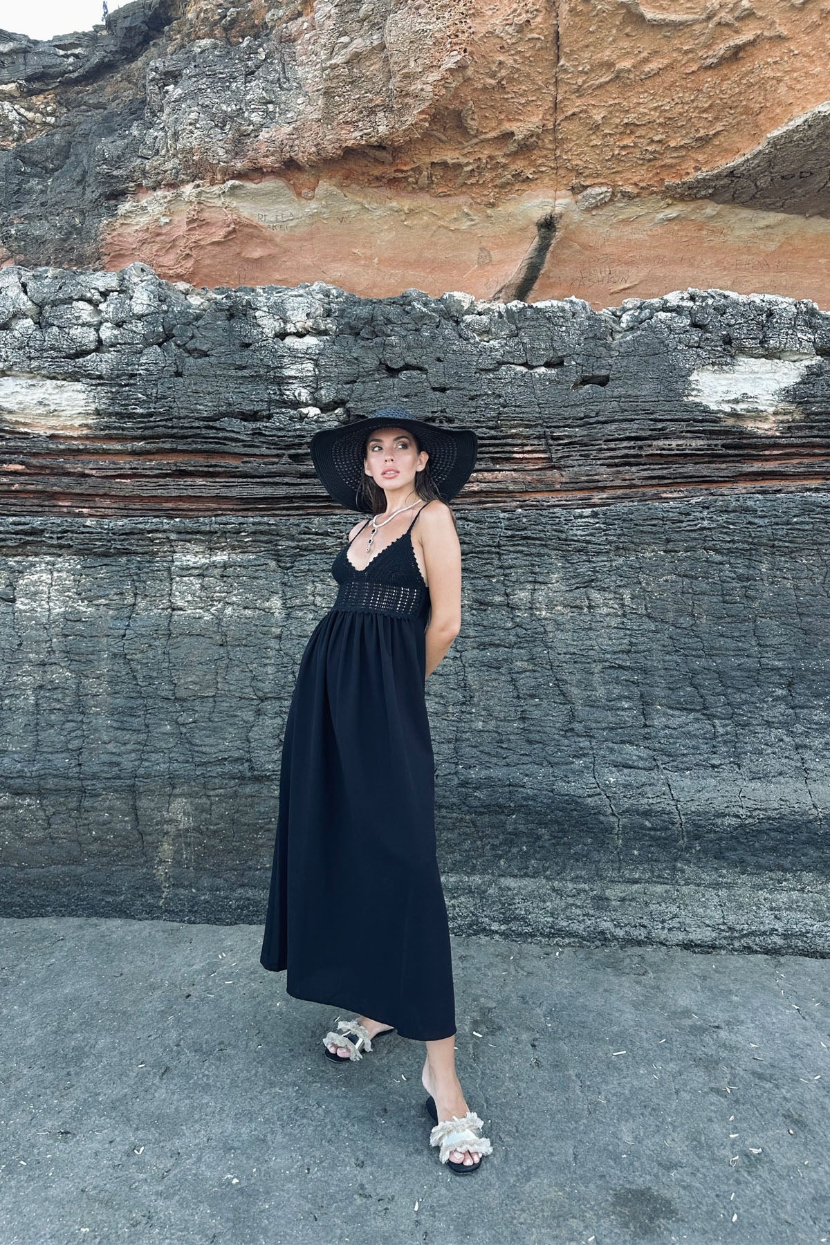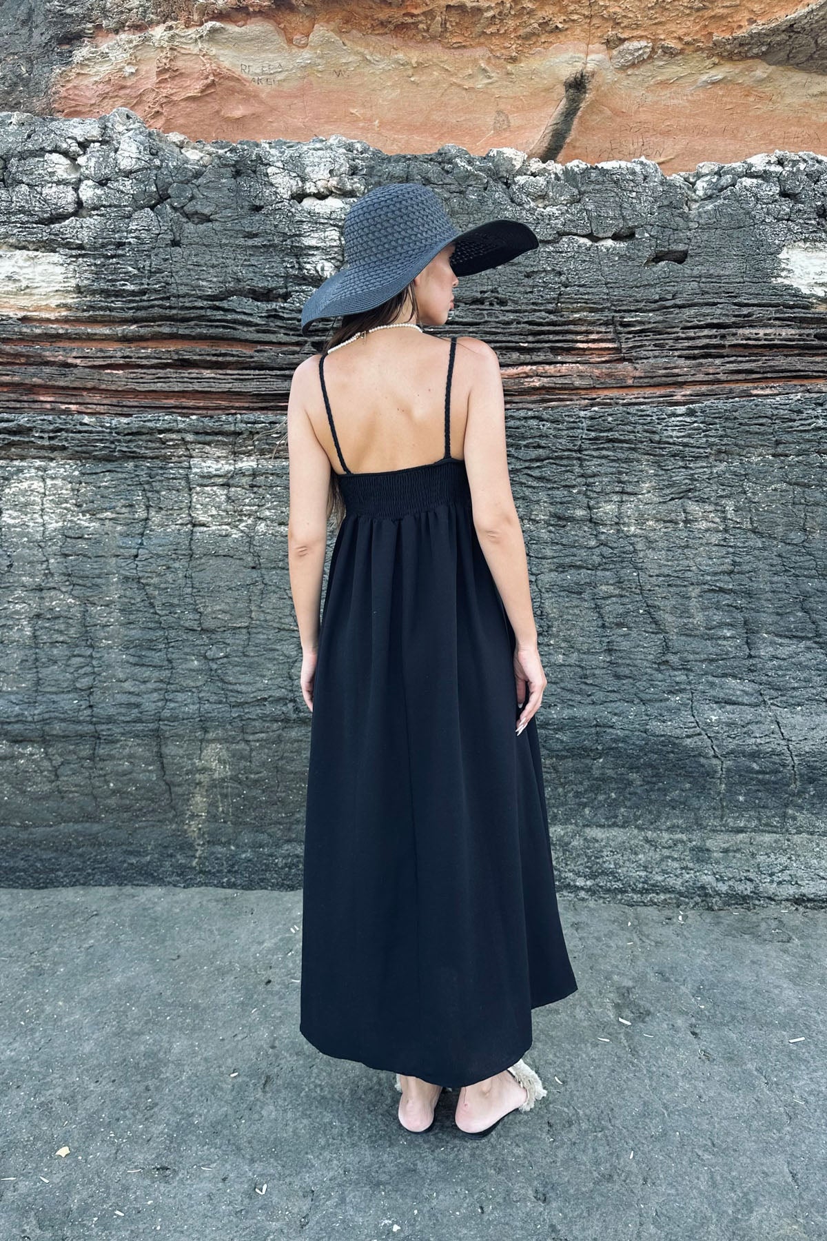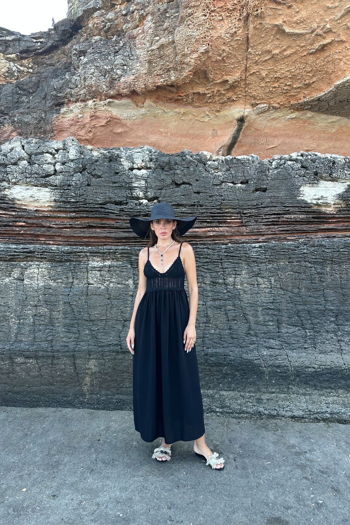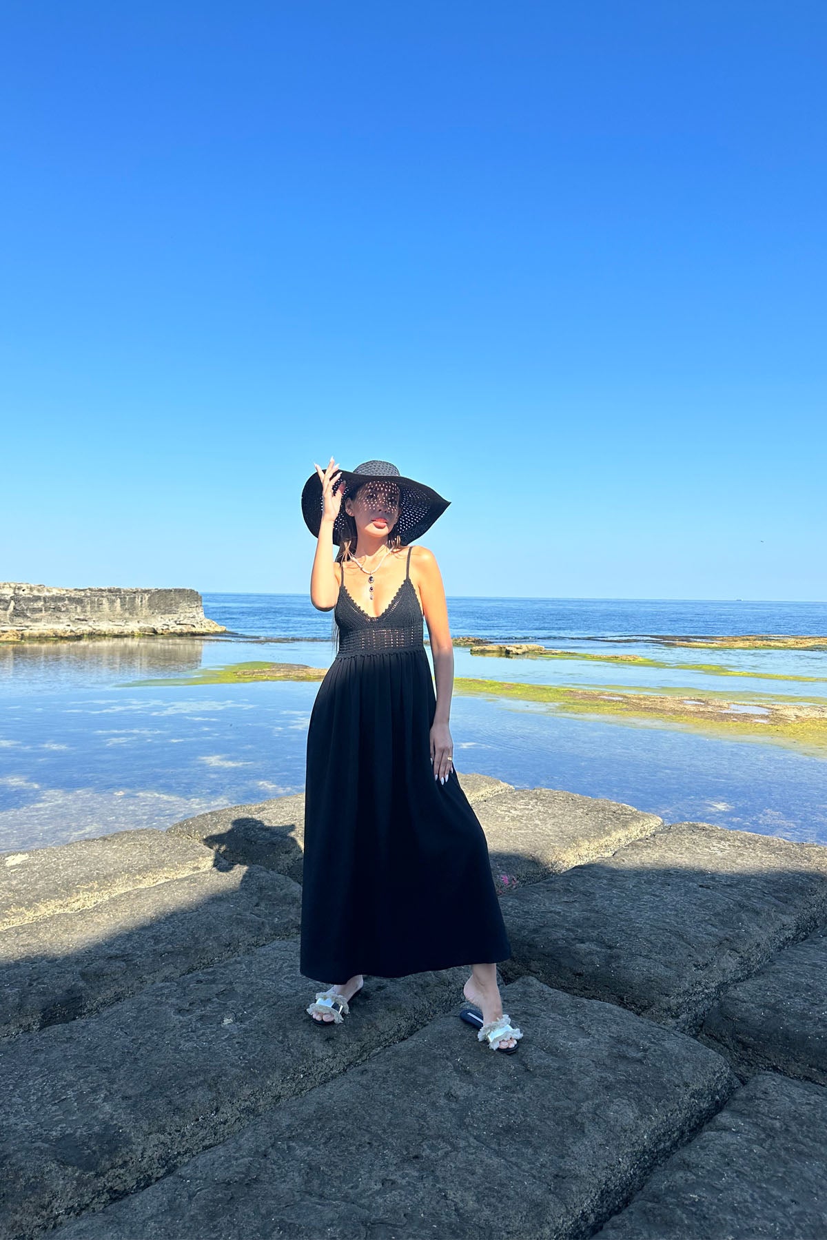 Siyah Askılı Triko Detay Keten Elbise SY-0784-Siyah