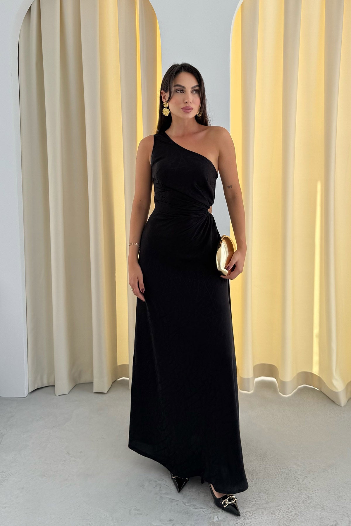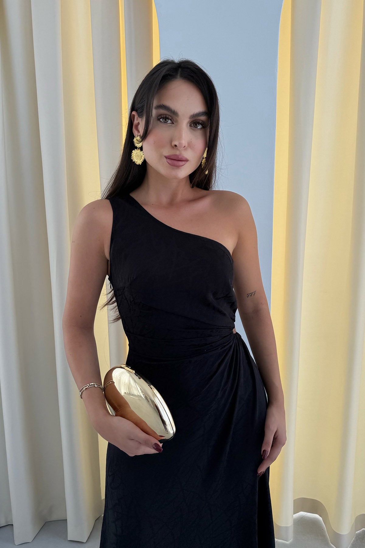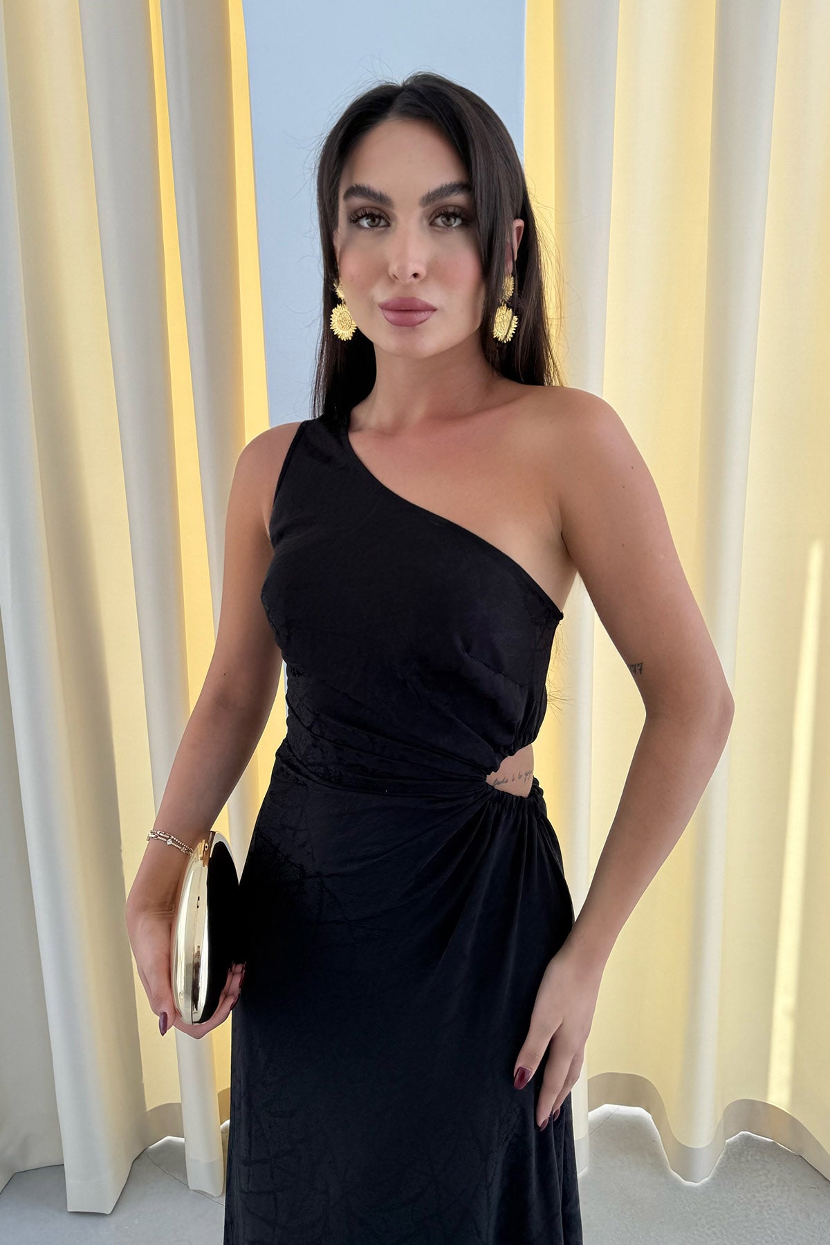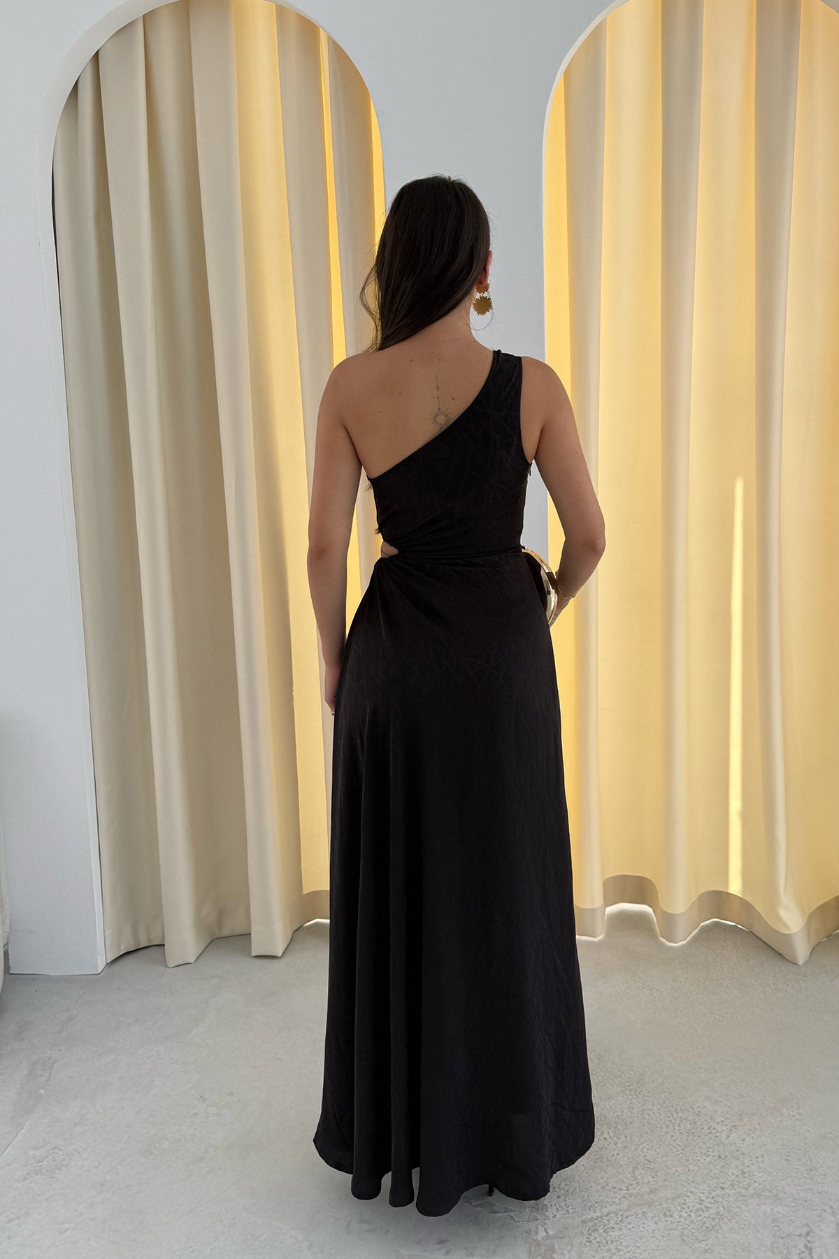 Siyah Desenli Tek Kol Pencere Detaylı Elbise SY-3334-Siyah