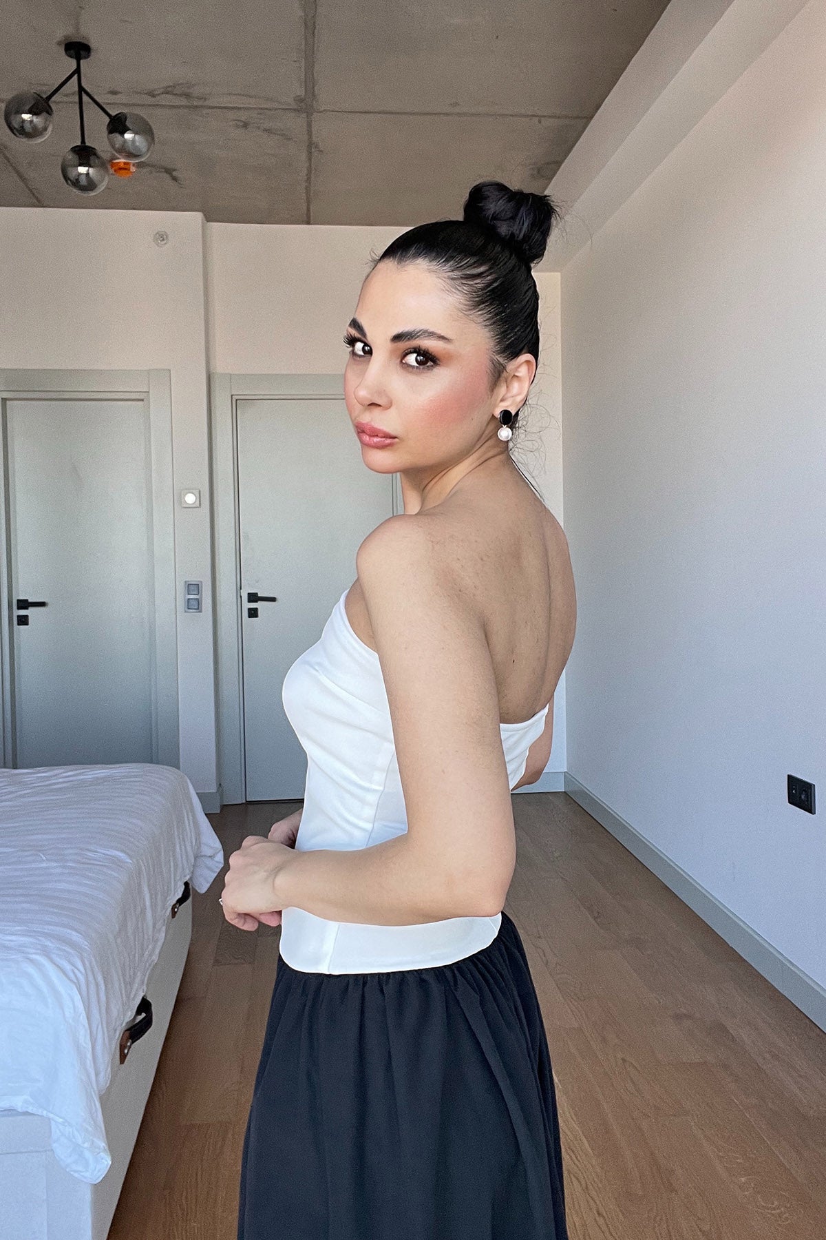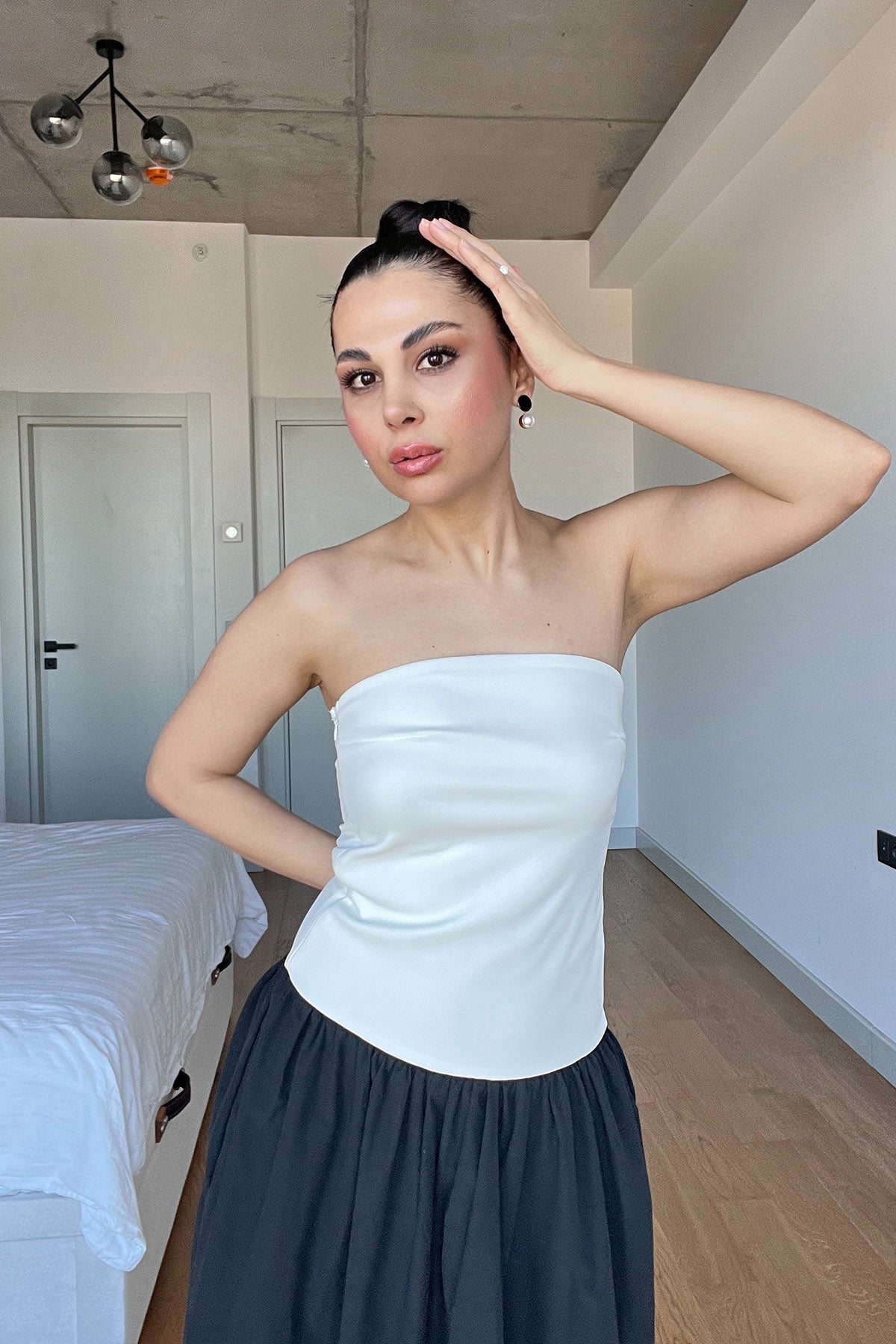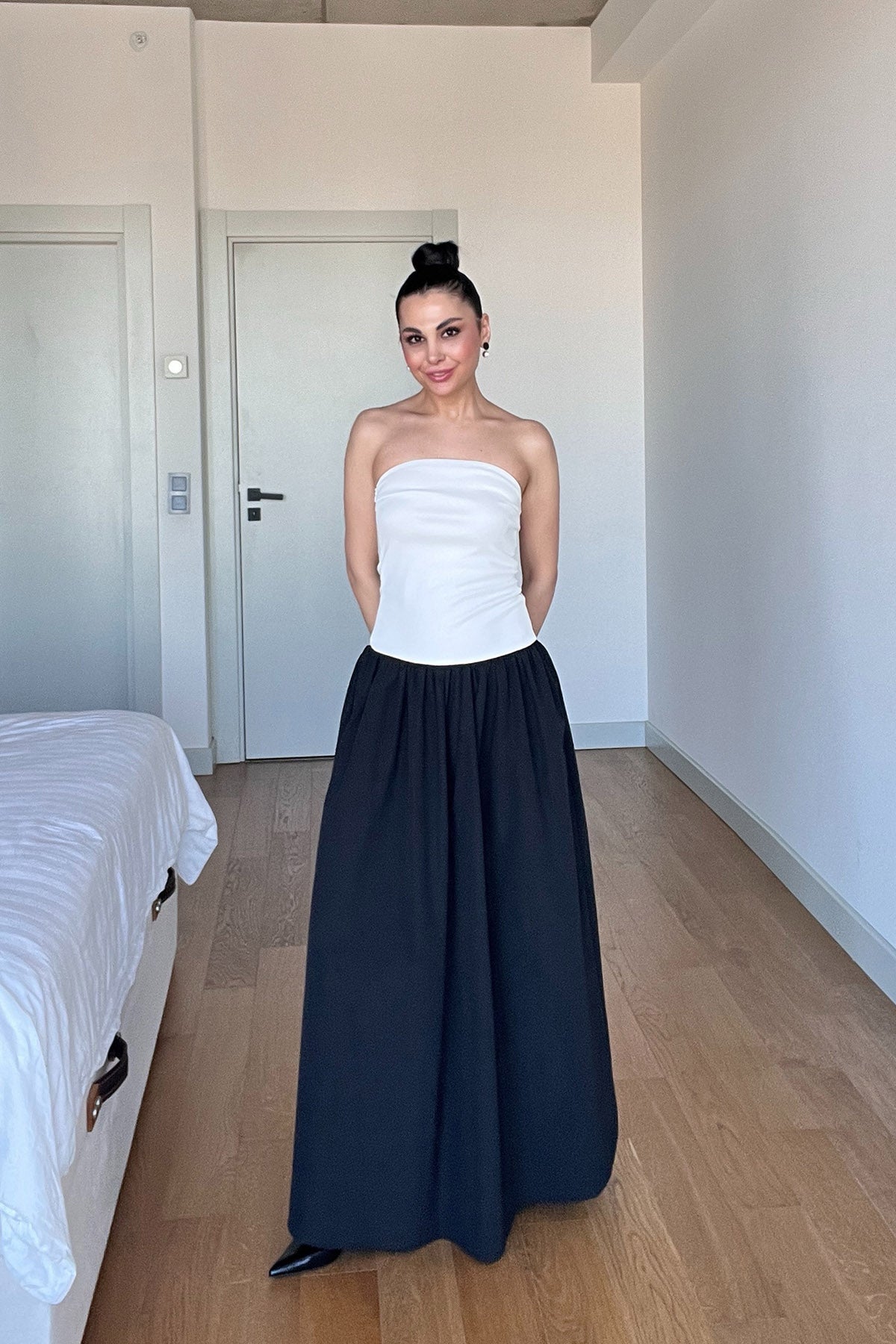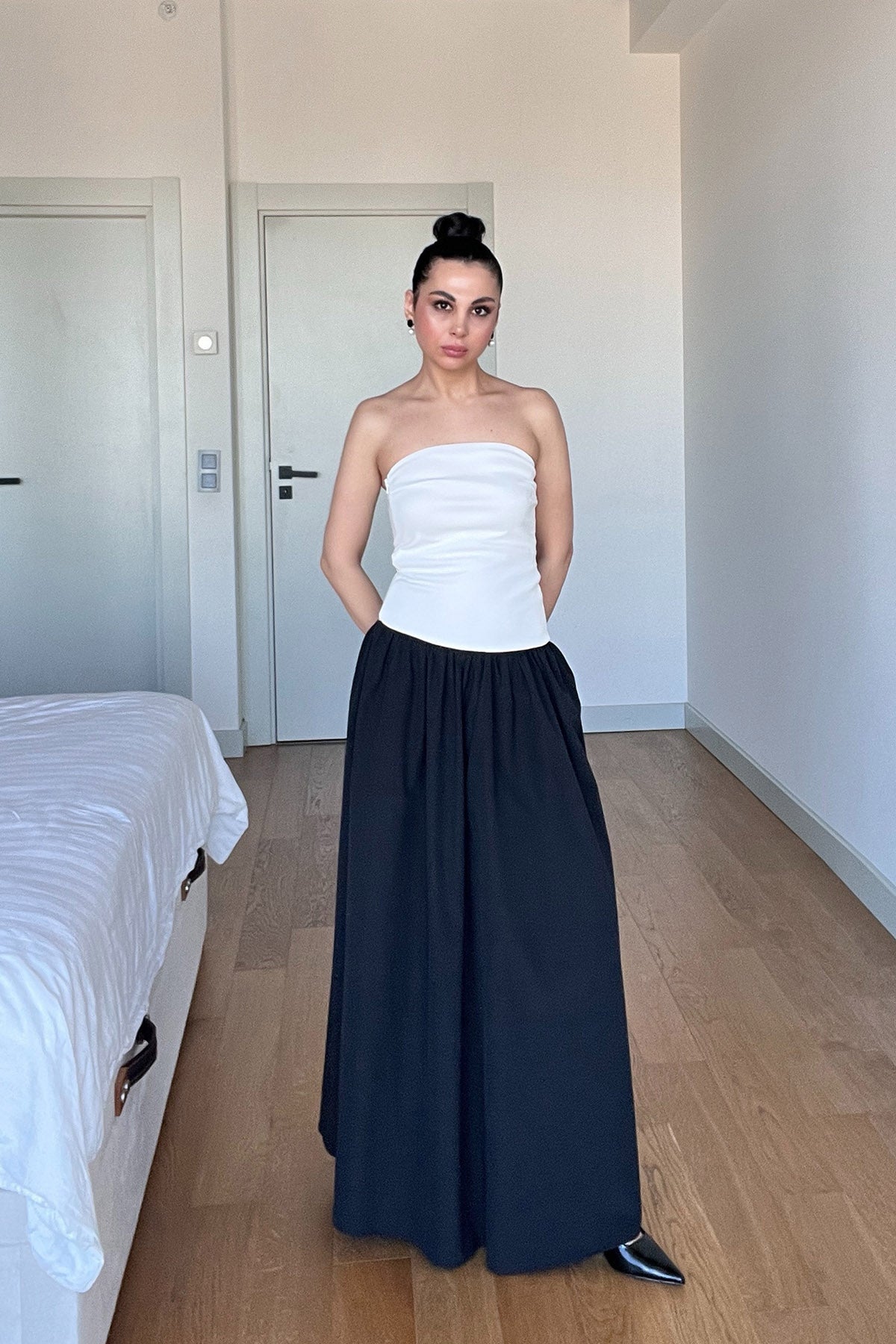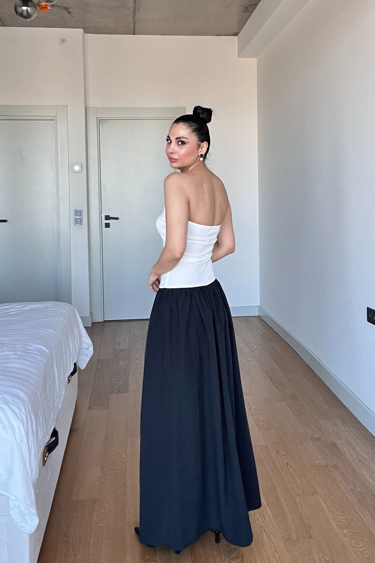 Siyah Poplin Üstü Beyaz Straplez Uzun Elbise SY-3019-Beyaz