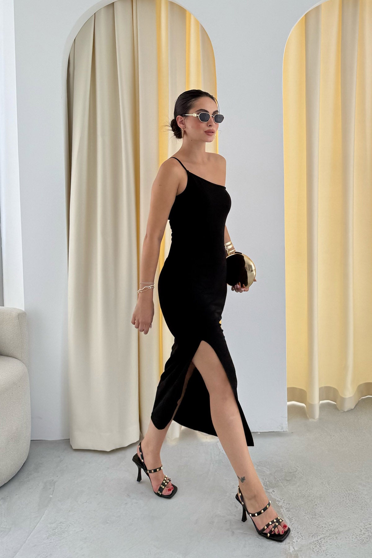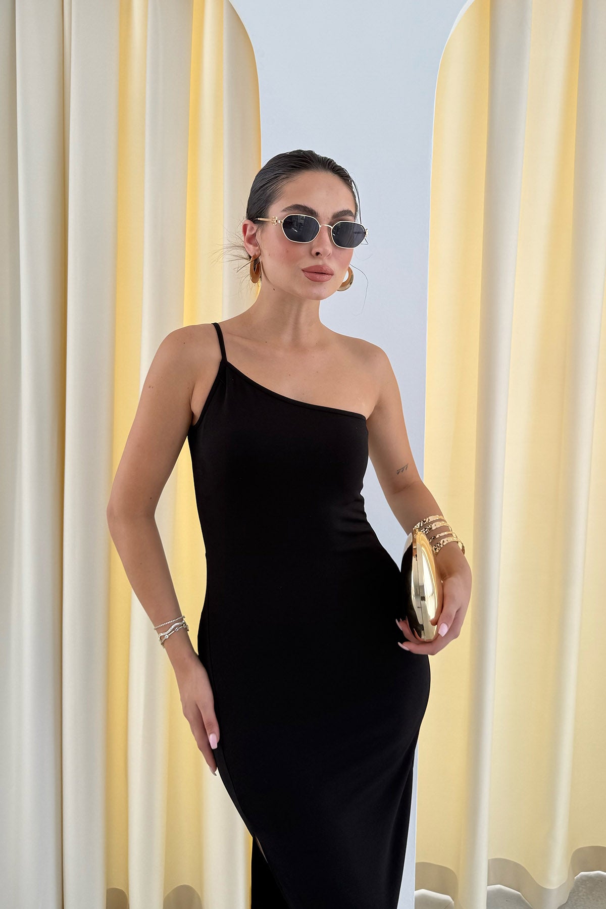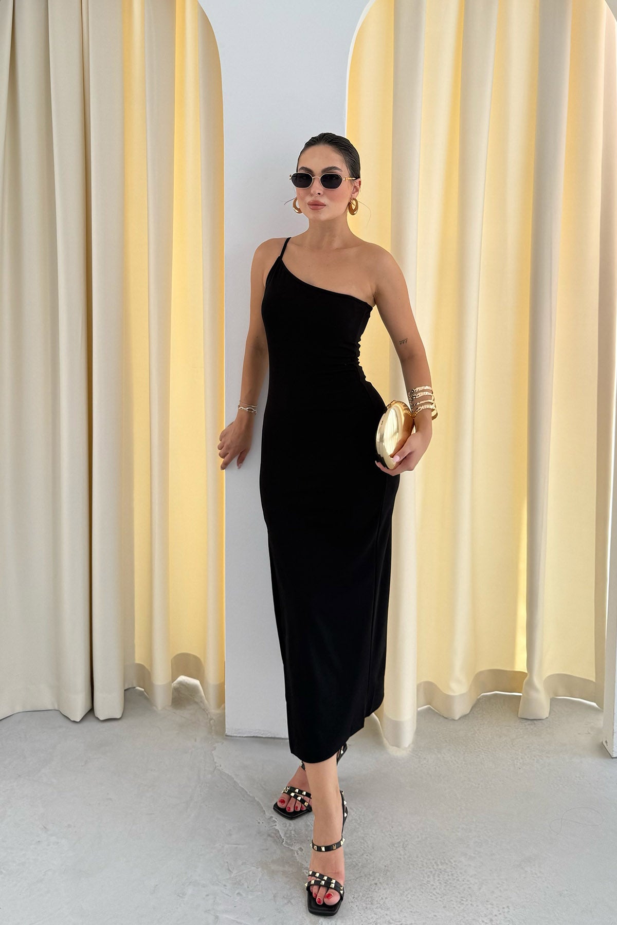 Siyah Tek Omuz Midi Boy Elbise SY-3300-Siyah