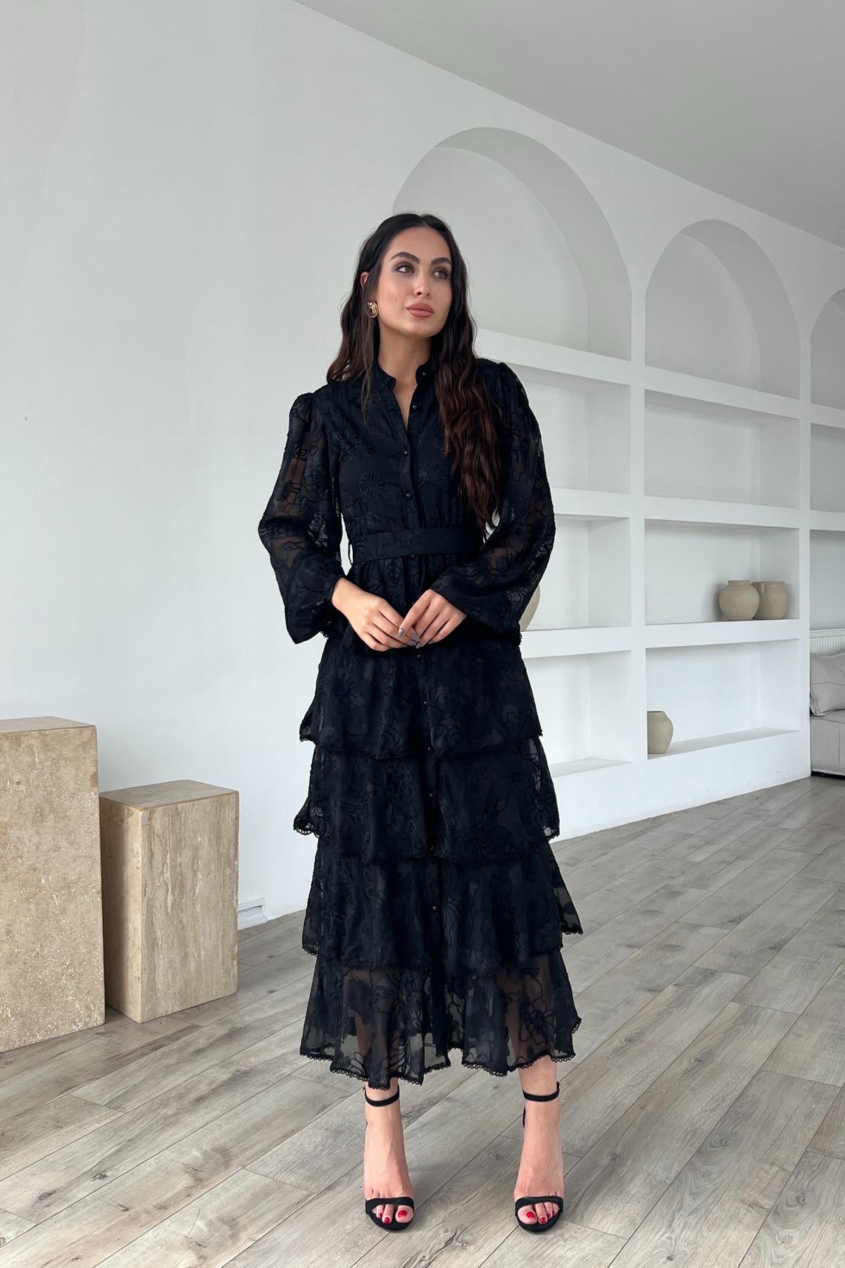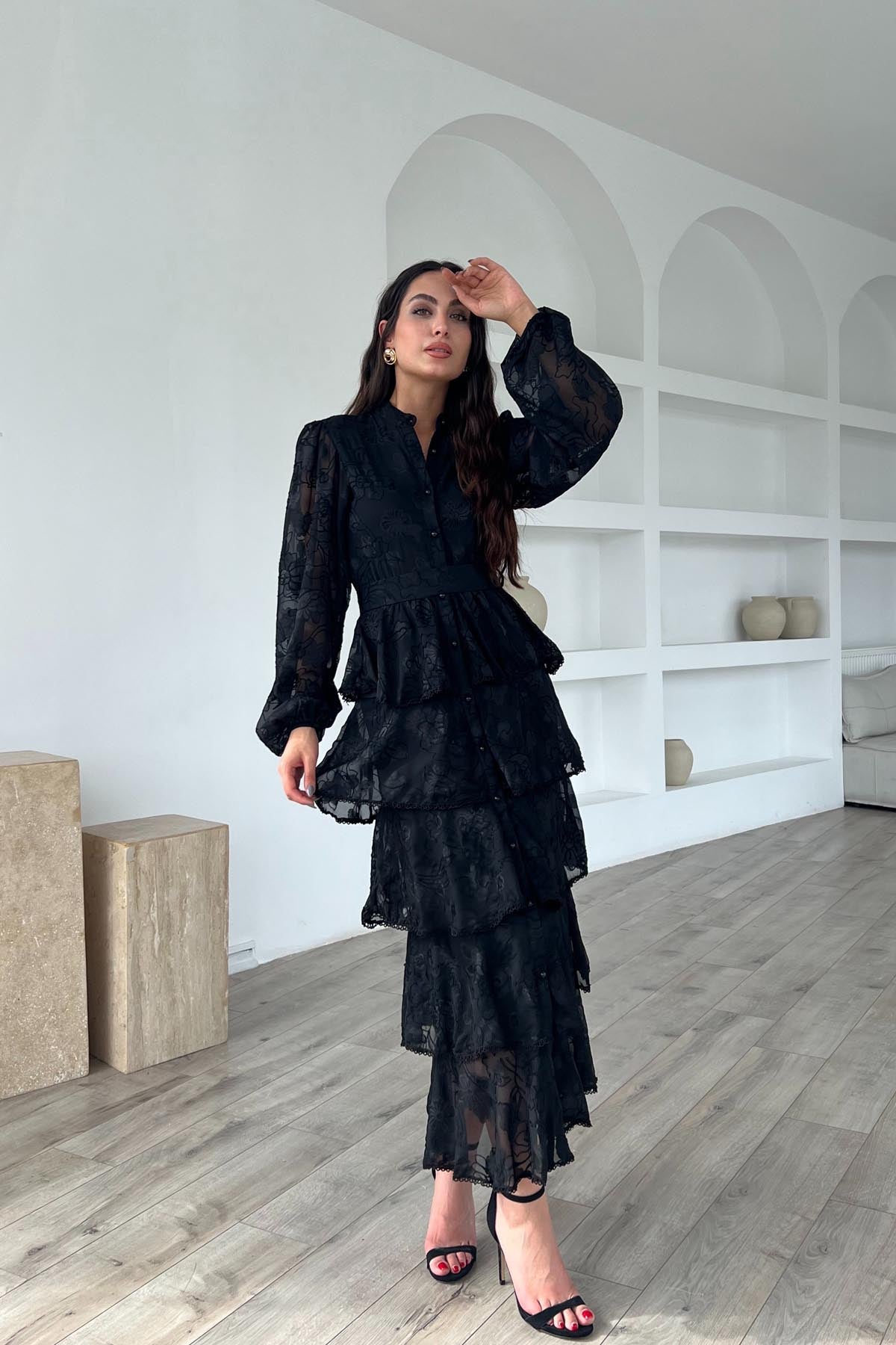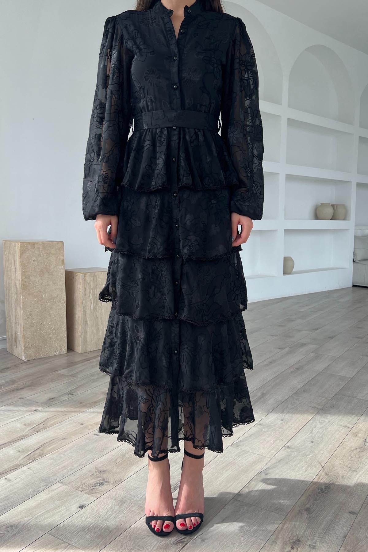 Siyah Valonlu Şerit Detaylı Kat Kat Elbise SY-1747-Siyah