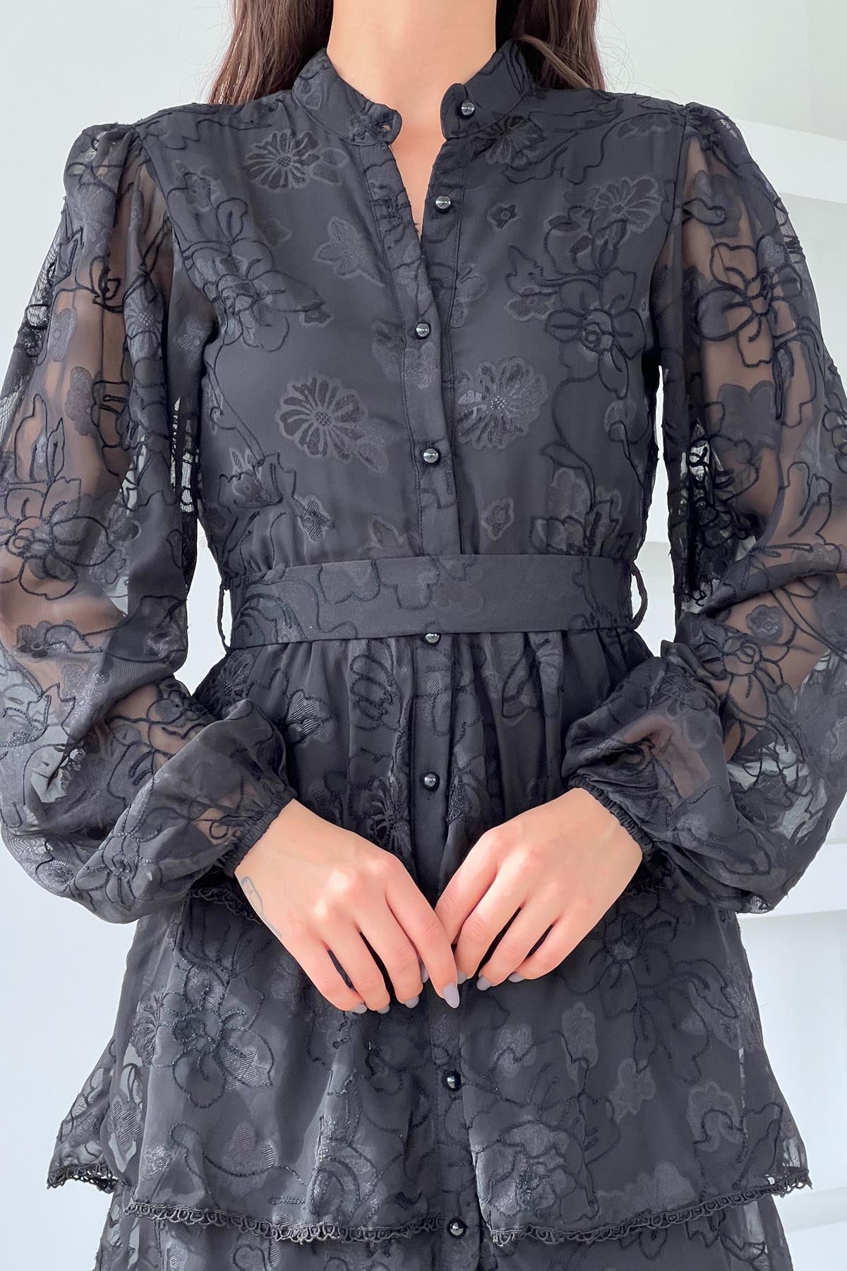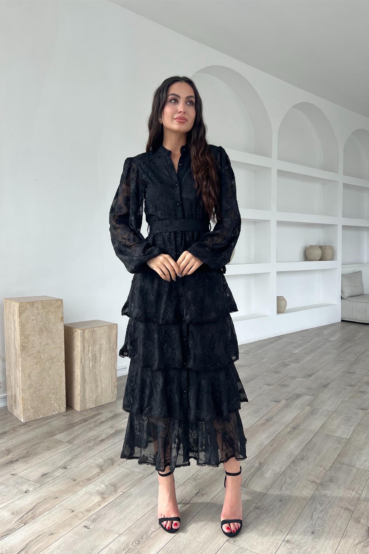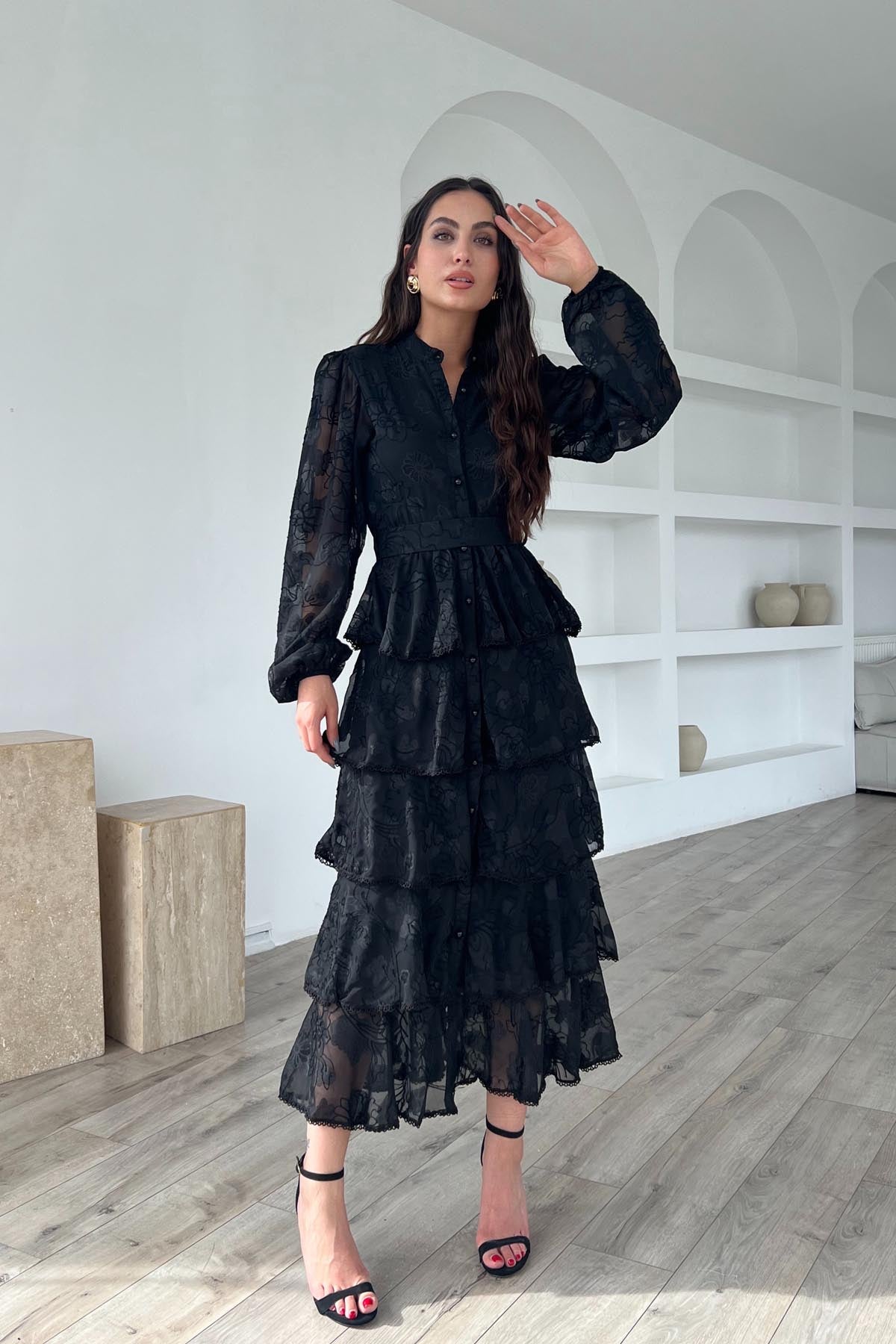 Siyah Valonlu Şerit Detaylı Kat Kat Elbise SY-1747-Siyah
